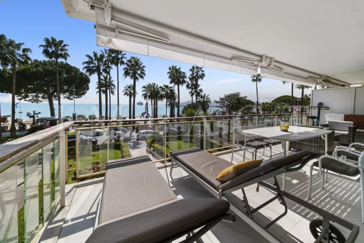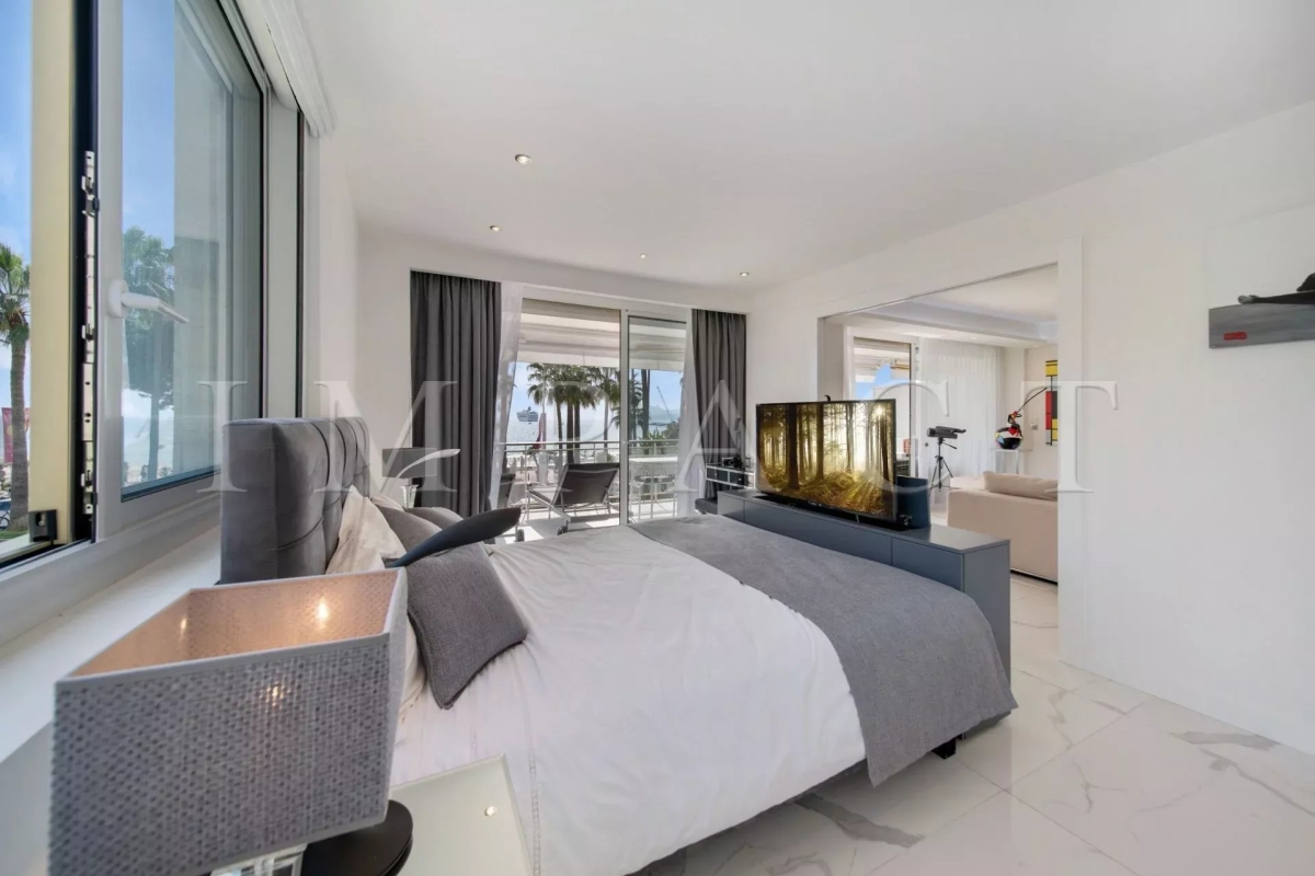 Installé sur la prestigieuse Croisette, à 2 minutes à pieds des boutiques, restaurants et du Palais des Congrès, dans la résidence de standing sécurisée avec gardiens 24/7 "Le Grand Hôtel". Appartement moderne rénové avec 2 chambres et 2 salles de bain, exposé Sud avec grande terrasse, vue panoramique mer et Iles de Lérins. Hall d'entrée avec toilettes invités. Spacieux double salon /salle à manger, vue mer et ouvert sur la terrasse : canapé, télévision. Cuisine américaine entièrement équipée : réfrigérateur/congélateur, plaque à induction, four, micro-onde, lave-vaisselle, machine à café Nespresso, table haute pour dîner pour 4 personnes. Chambre Maître N°1 vue mer et accès terrasse : lit double (160cm x 200cm), télévision, dressing, salle de bain ensuite avec baignoire, douche et toilettes. Chambre N°2 : lit double (160cm x 190cm), dressing, salle de douche ensuite et toilettes. Terrasse exposée Sud, vue mer, équipée de chaises longues et une table repas pour 6 personnes. Autres prestations : Wi-Fi, climatisation. Equipé pour 4 personnes. Contact: +33658270230.