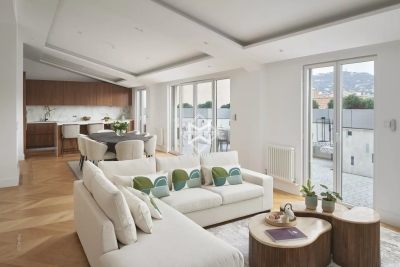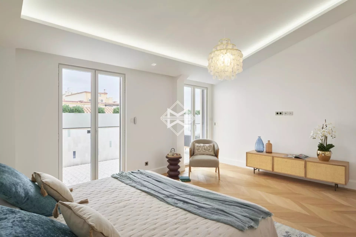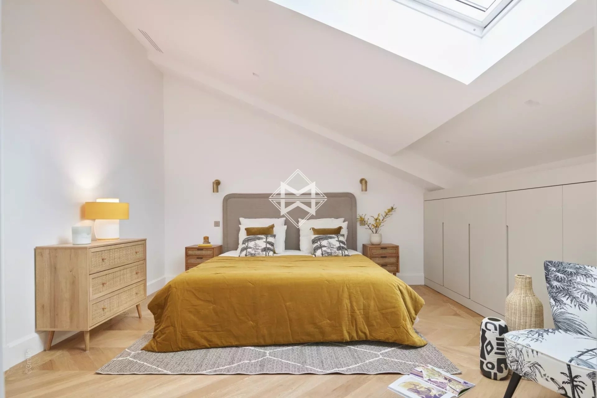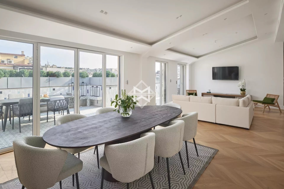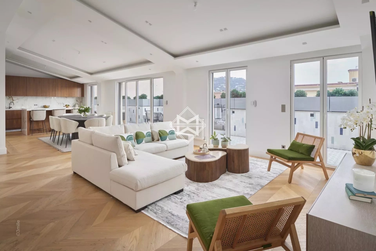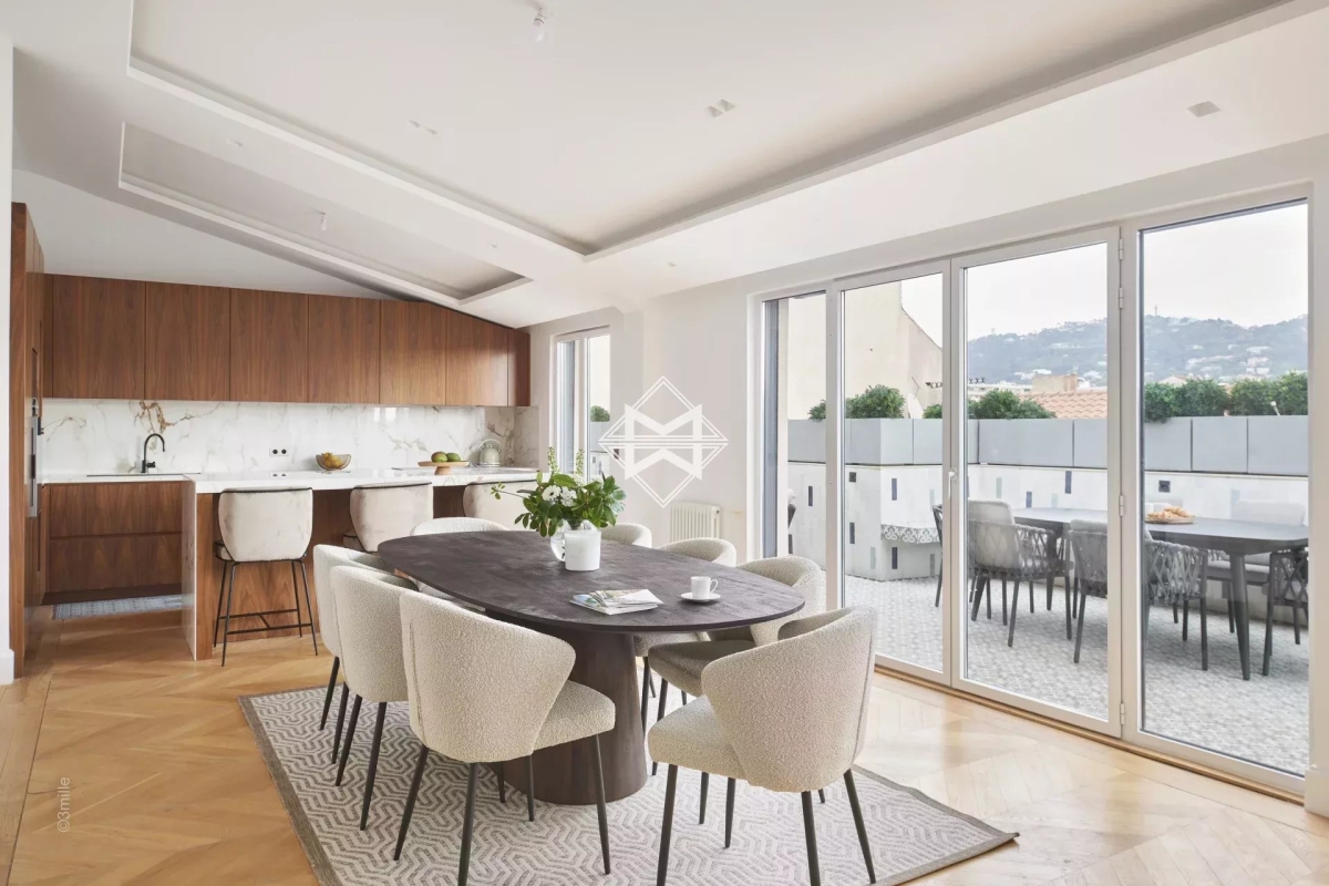 L'une des adresses les plus prestigieuses du centre ville, à 100 mètres de la Croisette. Ce superbe Penthouse niché dans un magnifique immeuble bourgeois aux parties communes soignées comprenant seulement 7 appartement, a été complètement réhabilité à neuf. Cet appartement d'environ 179m2 est une véritable villa sur le toit offrant une magnifique terrasse de près de 53,4m2. Il possède de très belles hauteurs sous plafond et beaucoup de cachet avec ses lignes en sous pentes dans les chambres, produit unique. Il se compose comme suit : - Un hall d'entrée avec WC indépendants et buanderie - Un double séjour et salle à manger d'environ 45m2 ouvrant sur la terrasse dominant Cannes et offrant une incroyable vue sur les collines - Une cuisine indépendante attenante. - Chambre 1 : suite de maîtres d'environ 19m2 avec dressing, salle de bains complète donnant sur la terrasse - Chambre 2 : suite d'invités avec salle de bains - Chambre 3 : suite d'invités avec salle de bains - Chambre 4 : suite d'invités avec salle de bains - Une buanderie. Numéro de déclaration : 06029025206HT Estelle FACCHINETTI - Agent commercial - EI - RSAC 87862822