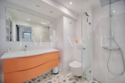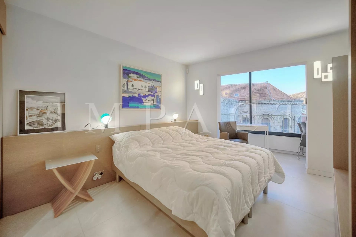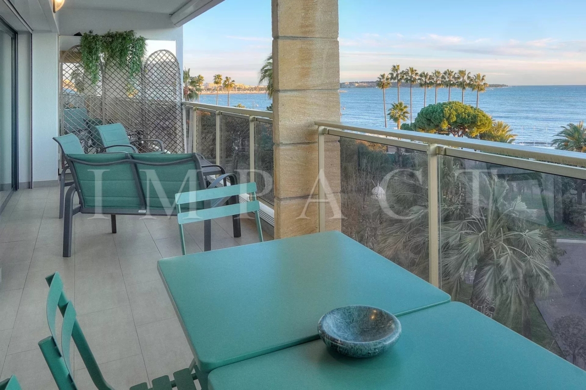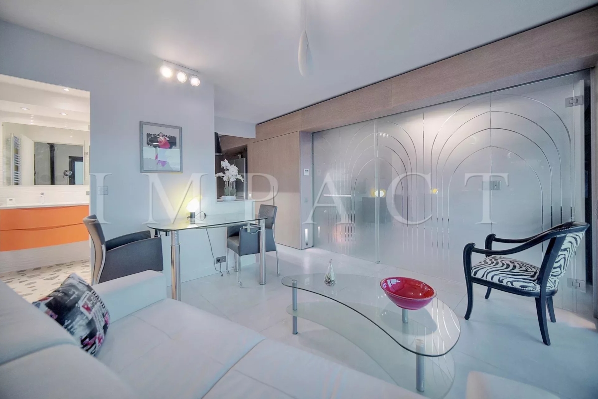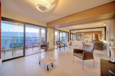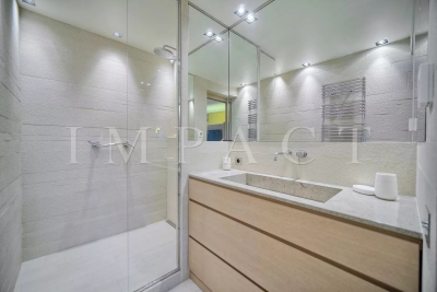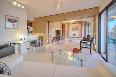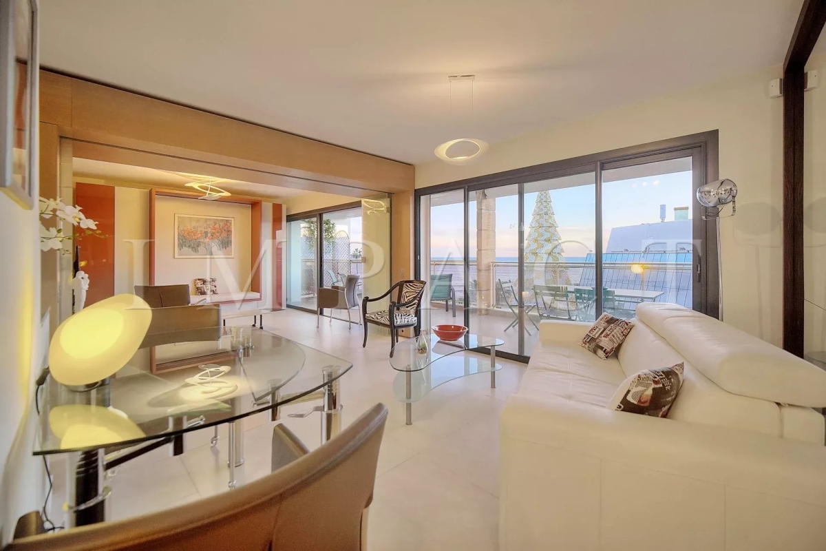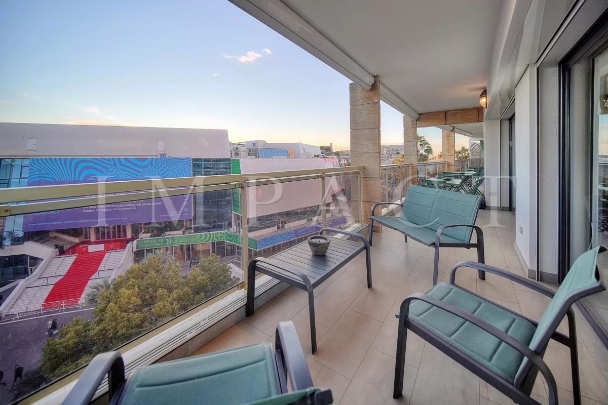 En face du Palais des Congrès, sur la célèbre Croisette, à proximité de toutes les commodités, appartement spacieux vue mer entièrement rénové avec de belles prestations. Descriptif Hall d'entrée, toilettes invités. Double séjour avec canapés, coin TV pouvant faire office de seconde chambre, lit escamotable de 160cm et séjour se fermant complètement pour offrir une véritable intimité. Cuisine entièrement équipée. Grande chambre : Lit double 160x200 cm avec vue dégagée sur les collines de Cannes. Salle de douche, bureau, TV. Une deuxième salle de douche. Spacieuse terrasse aménagée 17 m² bénéficiant d'une vue mer panoramique, le Palais des Congrès et le Suquet. Box en sous-sol pouvant être mis à disposition (petite voiture). Equipé pour 4 personnes. Autres prestations : Wi-Fi, climatisation. Contact: +33658270230.