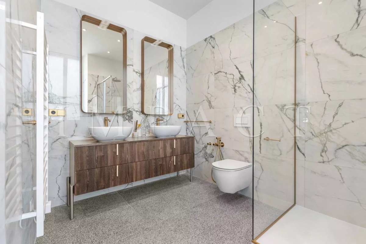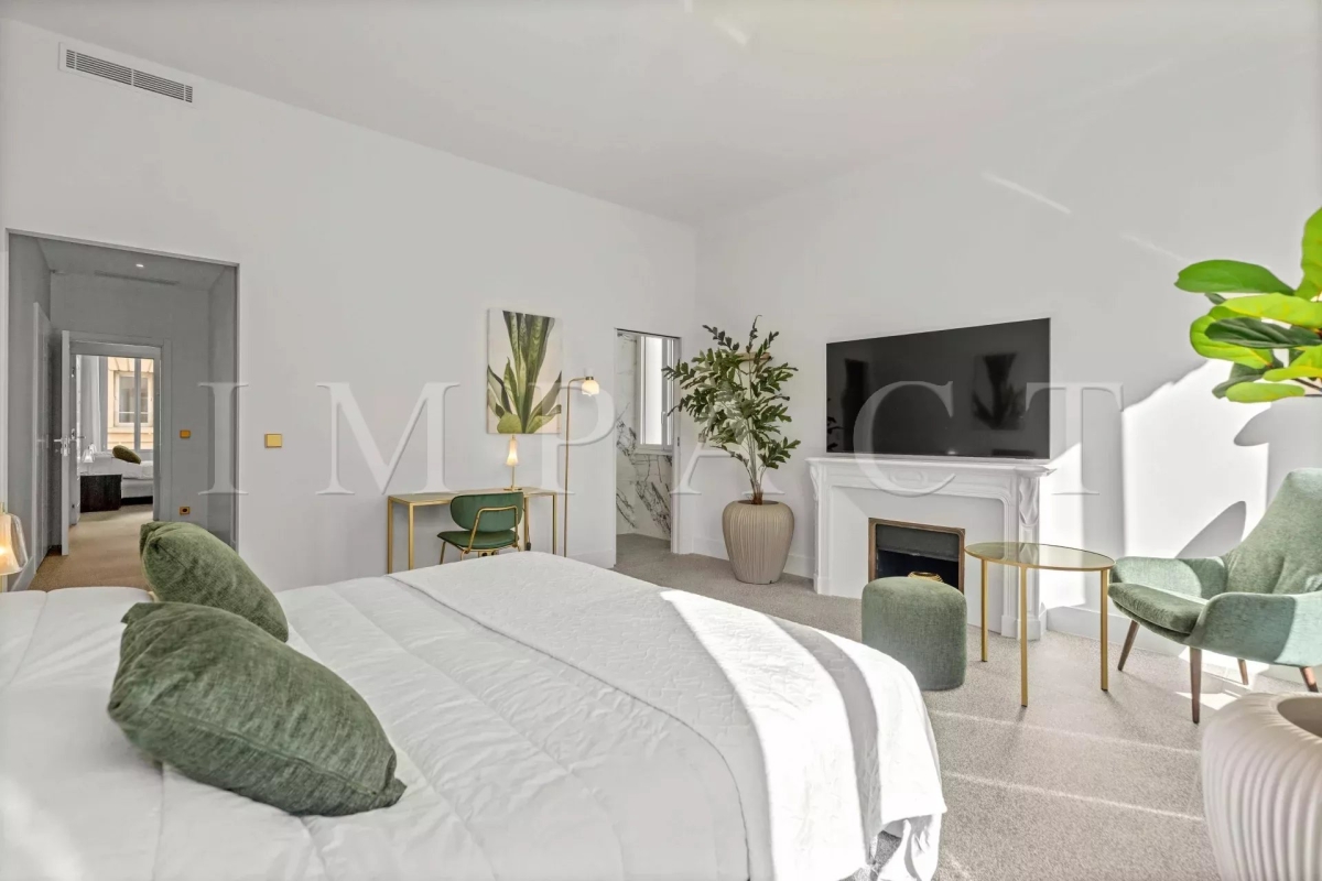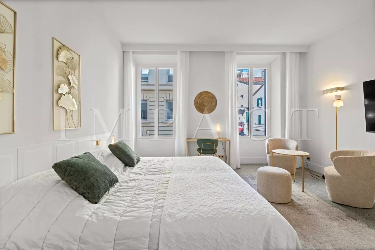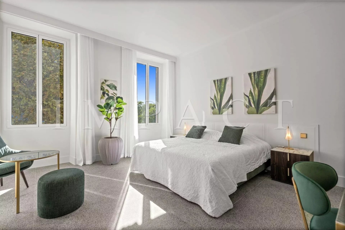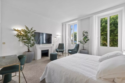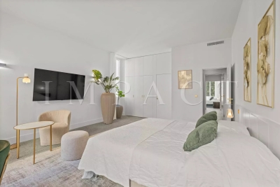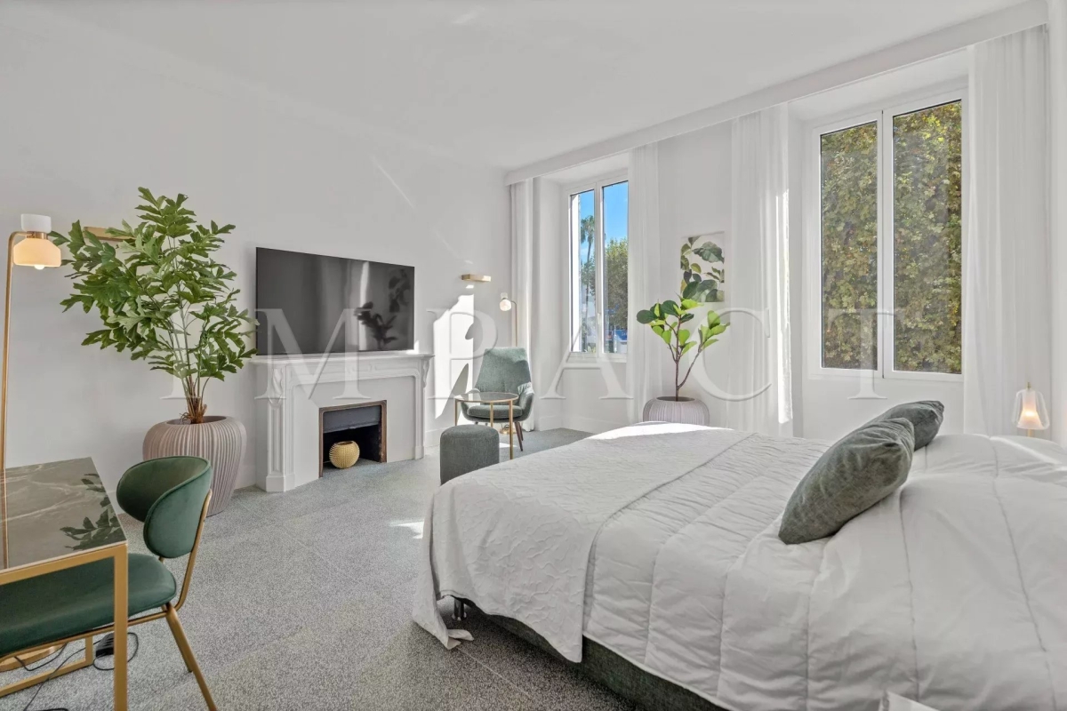 Cannes centre, face au Palais des Festivals. Proximité immédiate de la Croisette, des commerces, du Vieux Port et des plages. Appartement bourgeois d'environ 160m² + balcon sud de 10m². Exposition sud, est et nord, vue Croisette Palais des Congrès, Vieux Port et Le Suquet. DESCRIPTION : Récemment rénové. Entrée, placards, toilettes, invités avec lave mains. Grande cuisine entièrement équipée, réfrigérateur américain Samsung, piano de cuisson SMEG, four, micro-ondes, lave-vaisselle, lave-linge Siemens, table breakfast. Double séjour, 3 mètres sous plafond, c TV écran plat, espace repas 8 personnes. Bar avec réfrigérateur et cave a vin Chambre n°1 (sud) : 2 lits 90cm x 200cm ou 1 x 180cm-placards. Salle de douche avec toilettes. Chambre n°2 (nord) : 2 lits 90cm x 200cm ou 1 x 180cm placards, Salle de douche en suite avec toilettes. Chambre n°3 (nord) : 2 lits 90cm x 200cm ou 1 x 180cm, placards. Salle de douche avec toilettes. Autres prestations : Air conditionné WIFI Equipé pour : 6 personnes