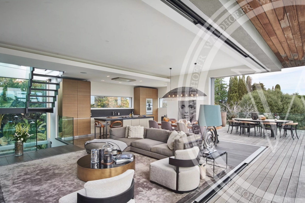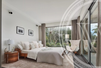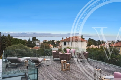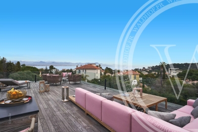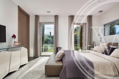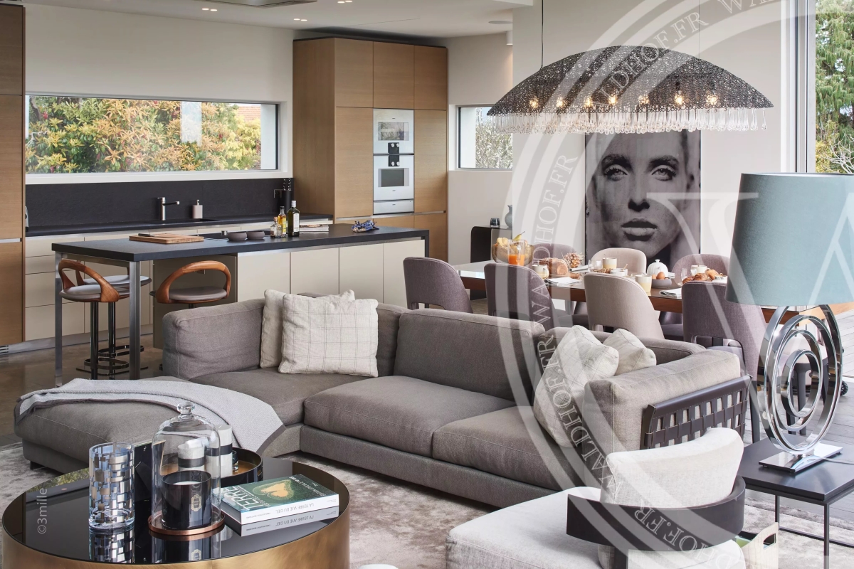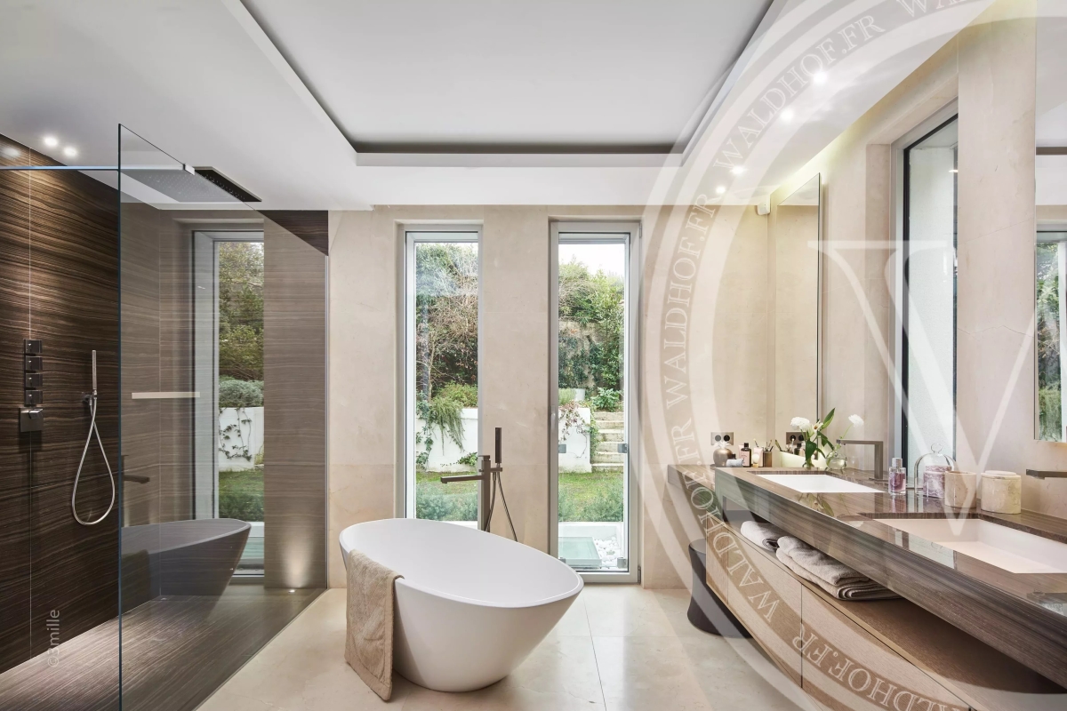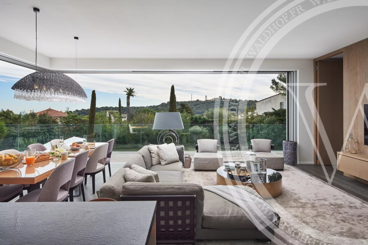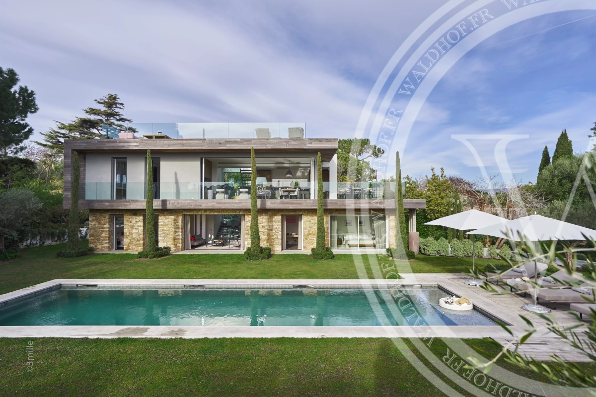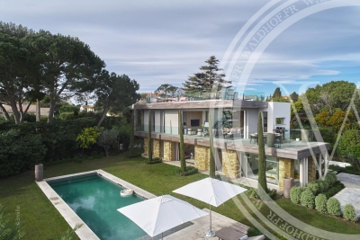 Villa contemporaine avec une vue sur la mer, les Alpes et le phare du Cap d'Antibes depuis le toit terrasse. Situé à seulement quelques minutes à pied des plages des plus belles plages du Cap D'Antibes. Superficie Habitable: 330 mètres carrés. Superficie du terrain: 1800 mètres carrés. 2 salons 1 salle à manger avec cuisine ouverte. 5 chambres en suites. 5 salles de Bain. 1 piscine chauffée et sécurisée. 1 Sauna. 1 Rooftop 100m2. Capacité: 10 personnes. Inclus: ménage 3x par semaine 6h par jour, changement de linge chaque semaine. - Rez-de-chaussée: Entrée Toilette invitée Salon TV avec espace bureau Chambre 1 (Master 1): 1 lit double 200cm, dressing, salle de bain avec baignoire, douche et wc, accès jardin. Chambre 2: 1 lit double 180cm, salle de douche et wc. 1er Étage: Vaste salon, salle a manger, cuisine ouverte, accès terrasse de 70m2. Chambre 3: 1 lit double 180cm, salle de douche et wc. Chambre 4: 1 canapé lit double 140cm, salle de douche et wc. Niveau -1: Chambre 5 avec puit de lumière naturel: 1 lit double 160cm, salle de bain et wc. Cave à vin Sauna Buanderie Cuisine pour le personnel de maison Rooftop: Toit terrasse de 100m2 avec vue mer et montagne Côté lounge, transats et bar Extérieur: Une piscine chauffée et sécurisée par un volet électrique. Parking pour 4 voitures Autres prestations: Climatisation réversible dans toutes les pièces. Alarme et cameras de surveillance. Système son et domotique Wifi Contact: +33651318572.