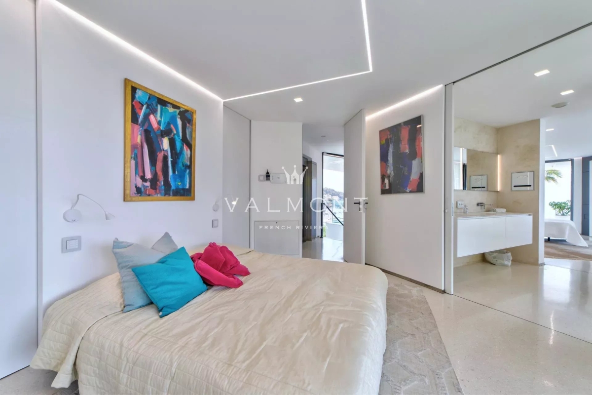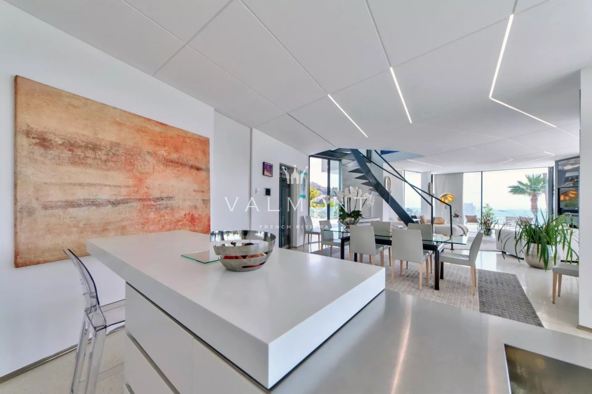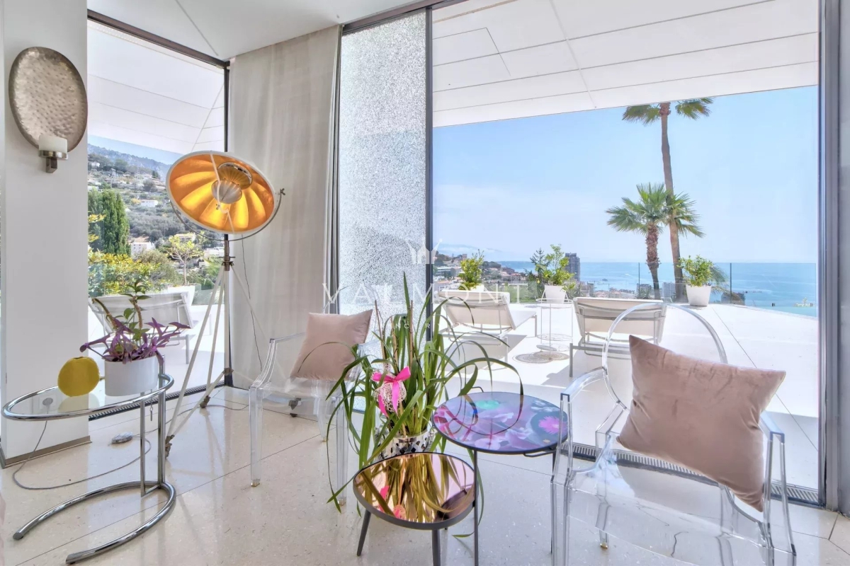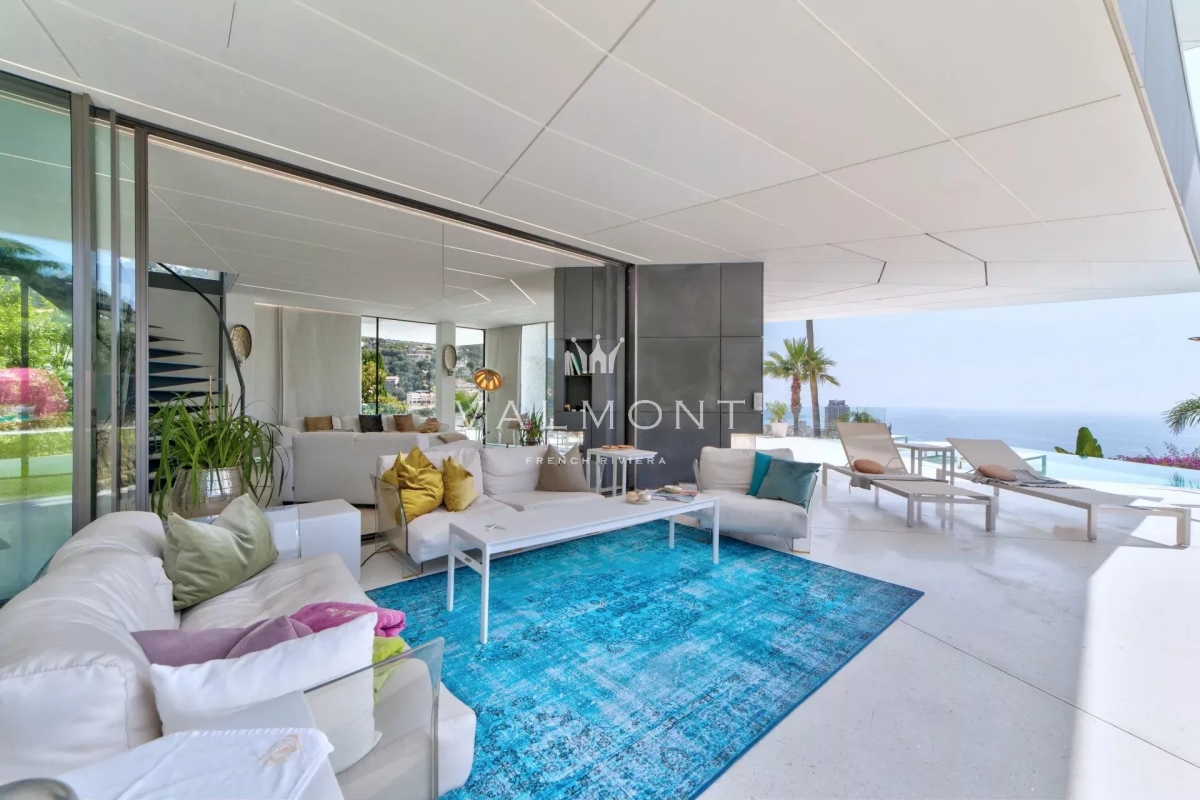 BEAUSOLEIL: Située à quelques pas de Monaco, cette superbe villa contemporaine bénéficie d'une vue magnifique sur la mer et la principauté. De style minimaliste, la villa profite d'environ 460 m² de surface habitable divisée en trois niveaux accessible avec ascenseur. La propriété dispose de deux chambres en suite à l'étage dont une spacieuse chambre de Maître donnant sur une grande terrasse avec une vue imprenable sur la mer. Au rez de jardin: grand séjour, salon, cuisine ouverte, coin repas. Au rez-de-chaussée: deux appartements privés avec leur chambre, salle de bains, réception, dressing et chambre de bonne. La villa possède également d'une salle de yoga, salle de cinéma intérieure / extérieure et une cave à vin. Cette luxueuse villa propose des prestations haut de gamme : intérieur Antonio Lupi, finition en Tadelakt, «James Bond» bar «rétractable»… Arboré de plusieurs plantes exotiques, le jardin de la propriété dispose d'une grande piscine de 18m ainsi que de plusieurs espaces de relaxation répartis sur les vastes terrasses de la villa. Un parc aménagé situé à coté de la villa offre sur un hectare un sentier botanique et un parcours sportif.