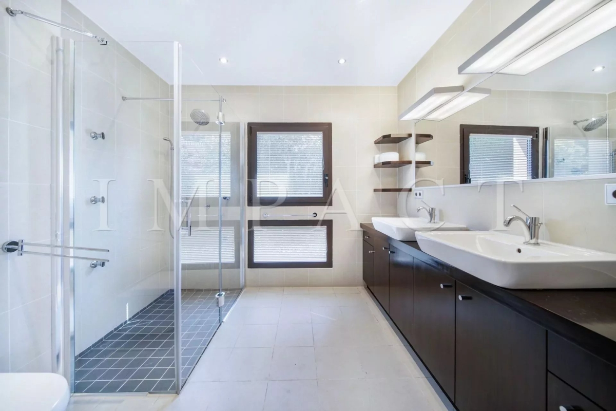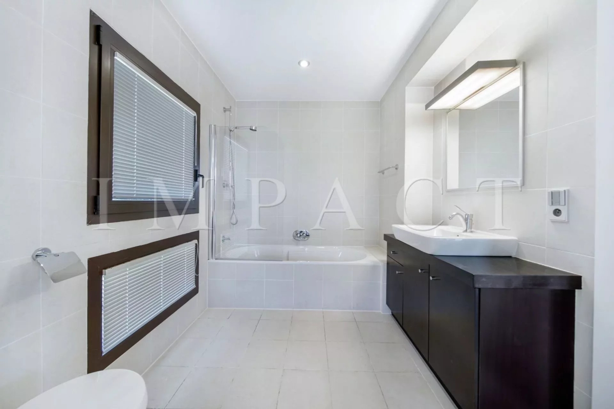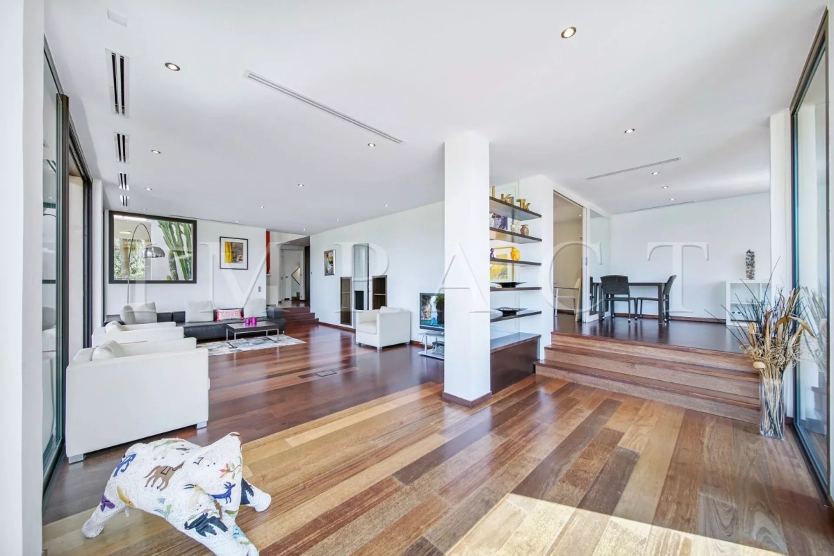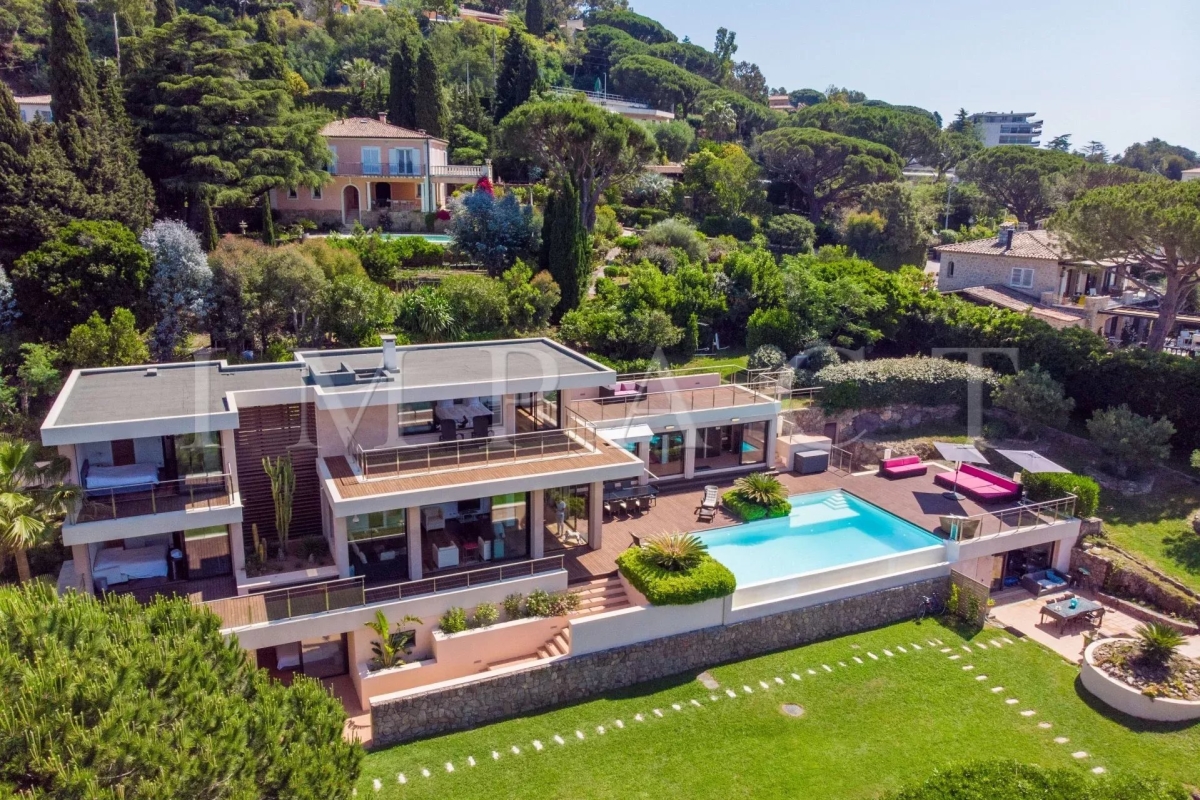 Dans le quartier de la Croix des Gardes, belle villa contemporaine de 5 chambres avec vue mer. 1er étage: Chambre N°1 - vue mer, accès sur la terrasse : Lit double 180cm Salle de bains en suite avec baignoire, toilettes et lavabo Chambre Maitre (N°2) - vue mer, accès aux deux terrasses privées : Lit double 220cmx200, canapé, TV écran plat Salle de bains en suite avec douche, double vasque et toilettes Accès direct au jardin et piscine Rez-de-chaussée: Chambre N°3 / bureau : canapé -lit double (160 cm), TV, bureau, ordinateur Salle de bains en suite avec douche, toilettes et lavabo Toilettes invités. Cuisine entièrement équipée avec réfrigérateur américain, congélateur, plaques à induction, hotte, machine à café Nespresso Salle à manger équipée pour 10 personnes Double salon ouvrant sur la terrasse équipé avec deux canapés,cheminée, TV Espace piscine avec sauna, douche et toilette. Niveau -1: accessible par un escalier Appartement séparé avec : Chambre N°4, accès direct sur la terrasse : Lit double 180cm, penderie Chambre N°5, accès direct sur la terrasse : 2 Lits simples 90cm, penderie Salle de bains partagé avec chambre 4 avec douche et toilette. Salon avec cuisine américaine, coin repas et espace télévision Buanderie (lave-linge et sèche linge) Extérieur : Piscine à débordement 11m x5m avec volet Jardin de 2500m2 2 grandes terrasses équipées avec un espace salle à manger et plusieurs coin lounge. Autres prestations: WIFI Air conditionné dans toute la villa Chauffage au sol Parking pour 2 voitures Alarme reliée à une société de sécurité Volets électriques avec commande centrale Equipée pour : 10 personnes Appartement gardiens Contact: +33778826164.