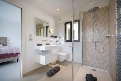 Située dans un secteur résidentiel recherché, à quelques minutes des plages, cette belle villa contemporaine de 315 m² combine modernité et confort. Installée sur un terrain de 800 m², le jardin paysager intègre une piscine, offrant un cadre agréable et intime pour profiter du plein air. L'architecture moderne de la villa se distingue par ses lignes épurées et des finitions de qualité. Ses espaces de vie lumineux, ouverts sur l'extérieur, sont conçus pour offrir un cadre de vie confortable et convivial. Avec sa localisation idéale, cette propriété permet d'accéder rapidement aux commodités locales, restaurants et boutiques de Cannes, tout en offrant une atmosphère tranquille à proximité de l'animation du centre-ville. Rez-de-chaussée surélevé: Grande cuisine intégralement équipée ouverte sur l'un lumineux salon. Une chambre avec 3 lits dont deux superposés. L'ensemble ouvert sur une terrasse avec une magnifique vue dégagée. 2 toilettes invités + un placard 2 chambres se partageant une salle de douche. Une salle de bains avec vue mer depuis la baignoire. Une chambre double avec une petite chambre avec 3 lits avec salle de douche et WC Niveau Rez-de-jardin 2 chambres avec leur salle de douche et toilettes, l'une d'elle est équipée d'un système de lit tiroir permettant d'augmenter la capacité de couchage de 2 personnes. Une buanderie ainsi qu'une salle de sport avec toilettes. Climatisation réversible. 16 bains de soleil, piscine qui peut être chauffée ( 12,20 x 5,30) + une douche extérieure. 18 couchages au total. Estelle FACCHINETTI - Agent commercial - EI - RSAC 87862822