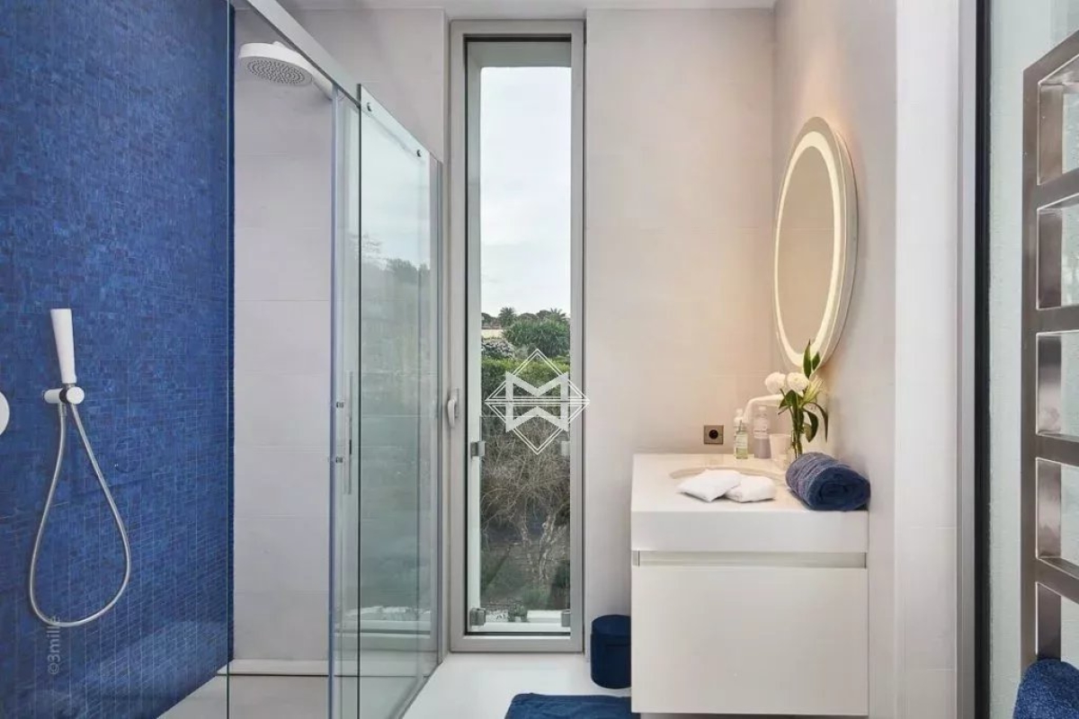 Cap d'Antibes, remarquable villa contemporaine d'architecte offrant un panorama exceptionel sur la mer, les alpes et le phare du Cap d'Antibes. La villa développe une superficie de 330 m² sur un jardin magnifiquement paysager de 1800m². Elle propose un environnement unique de confort et de luxe grâce aux matériaux chaleureux et modernes selectionés par un architecte et une décoratrice de renom. En s'approchant de l'entrée principale, vous ferez fasse à une majestueuse fontaine contemporaine de pierre face à un mur de verre offrant une luminosité et un décor magique à la villa. Entrée, toilette invitée, salon TV et bureau ouverts sur le jardin et la piscine. Chambre maître spacieuse donnant sur la piscine et son magnifique jardin. Salle de bains en marbre, baignoire, douche multi jets, double vasque et toilette. Grand dressing design d'environ 9 m². Chambre amis donnant sur la piscine et son jardin. Salle de douche avec toilette et vasque. Dressing. A l'étage : Arrivée sur un panorama magnifique grâce une vue panoramique sur le phare et sa verdure protégée et de beaux apercus sur la mer et les alpes. Une superbe pièce offrant une hauteur sous plafond de 3 m et une immense baie vitrée minimaliste pouvant s'ouvrir entièrement en galandage et se prolonge sur une terrasse en bois d'environ 70 m². Salon, salle à manger (table pour 8 - 10 personnes), cuisine US entièrement équipée (Gaggeneau). Terrasse avec table ronde pour 10-12 personnes donnant sur le phare, la mer et les alpes. Chambre maitre bis, spacieuse (3 mètres de hauteur sous plafond) avec grand dressing, toilette. Salle de douche en marbre avec double vasque et douche multi jets. Chambre enfant avec dressing, salle de douche en marbre, vasque et toilette. Accès au toit terrasse via un superbe escalier designe réalisé en verre, fer forgé et bois. Panorama exceptionnel depuis le toit terrasse. Superbe vue mer jusqu'au côtes Italiennes, vue sur les Alpes, Nice, le Cap Ferrat et vue splendide sur le phare du Cap d'Antibes. Toit terrasse d'une superficiede 100 m² entièrement aménagé avec des meubles de designer. Immense canapé d'angle, un second lounge avec fauteuils et tables basses. 2 transats et 2 parasols. Grand bar en pierre et bois avec réfrigérateur et evier. Au niveau - 1 : Espace piano, caves à vins. Chambre 5 spacieuse avec puit de lumière et grande hauteur sous plafond. Dressing, toilette séparée, salle de bains avec vasque, et bains thalasso. Superbe sauna design tout en verre pour 4 personnes. Douche en pierre et 2 lits pour se relaxer. Buanderie avec lave linge, sèche linge et évier. Cuisine personnel entièrement équipée. Villa entièrement domotisée (alarme, videosurveillance, éclairage design par scénario) Sonorisation haut de gamme en multi room, dans les 2 salons en home cinéma, sauna, chambre maître du rez de jardin, toit terrasse, terrasse, jardin. Internet wifi. Parking pour 4 voitures.