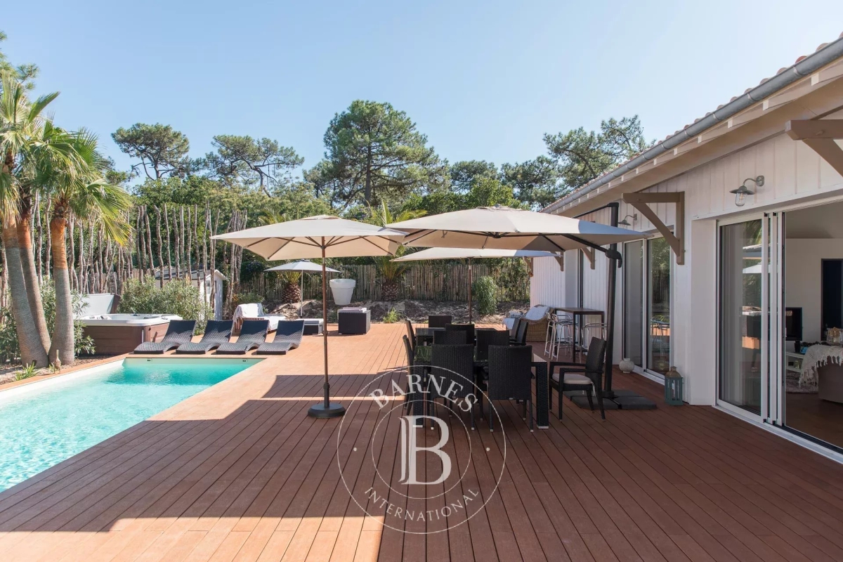 L'agence BARNES Bassin d'Arcachon vous présente cette villa d'exception, idéalement située dans le centre du Cap Ferret, au cœur d'un quartier calme assurant intimité et tranquillité, tout en étant à proximité des commerces et restaurants. La villa s'ouvre sur une grande pièce de vie lumineuse, harmonieusement agencée avec un salon accueillant agrémenté d'une cheminée, une salle à manger élégante et une cuisine ouverte équipée, dotée d'un îlot central. Cette pièce de vie s'étend naturellement vers une vaste terrasse exposée au sud, offrant un espace idéal pour se détendre, avec un barbecue, une piscine, et un jacuzzi en prolongement. Côté nuit, laissez-vous séduire par les 6 belles chambres, chacune avec sa propre salle d'eau : * Chambre 1 : Accessible depuis l'extérieur, elle propose une salle d'eau privative, des toilettes, et une télévision. * Chambre 2 : Équipée de deux lits simples (2x90), cette chambre dispose d'une salle d'eau et de toilettes privatives. * Chambre 3 : Offrant une salle d'eau, deux lits simples (2x90), une télévision, et des toilettes séparées. * Chambre 4 : Avec une vue sur la piscine, cette chambre propose deux lits simples (2x90), une télévision, et une salle d'eau privative. * Chambre 5 : Comprenant deux lits simples (2x90) et une salle d'eau attenante. * Master Suite : Cette suite parentale comprend deux lits simples (2x90), des toilettes séparées, un dressing, une télévision, un système audio, une vue imprenable sur la piscine, et une salle d'eau privative. Cette propriété offre un équilibre parfait entre espace de vie convivial, intimité, et confort, créant ainsi un lieu d'exception pour des moments inoubliables au Cap Ferret. Contact: +33789062188.
