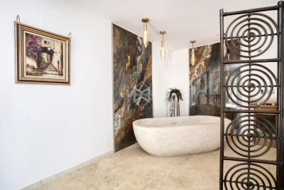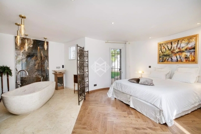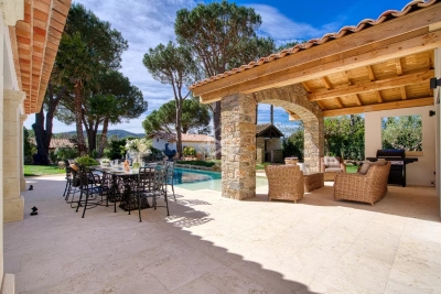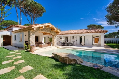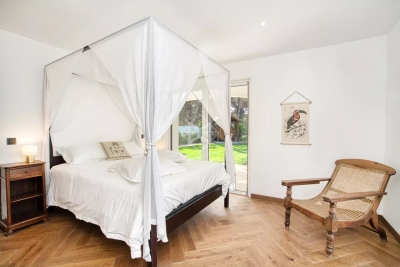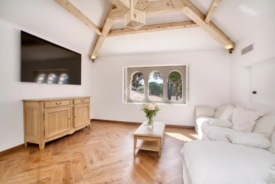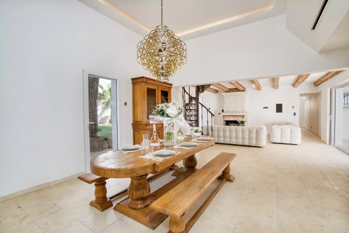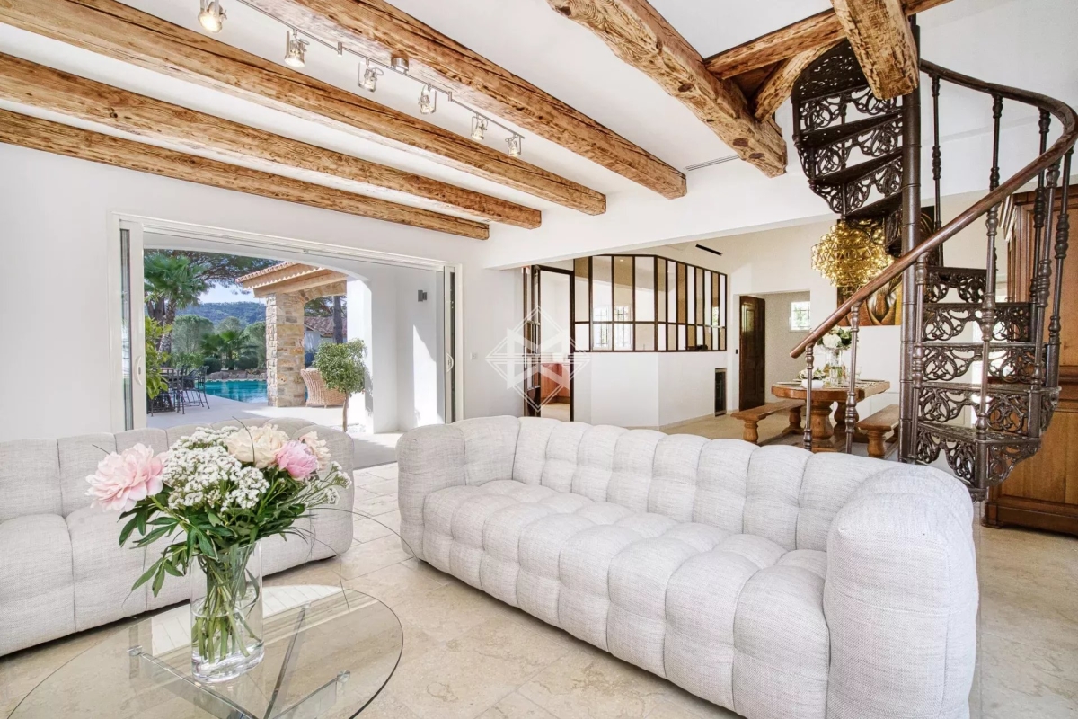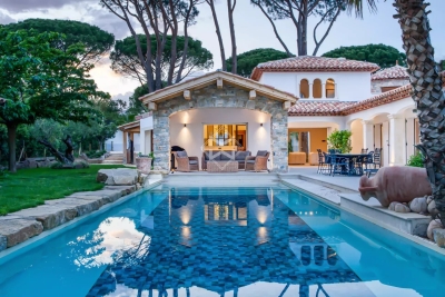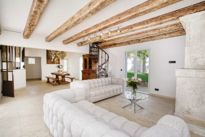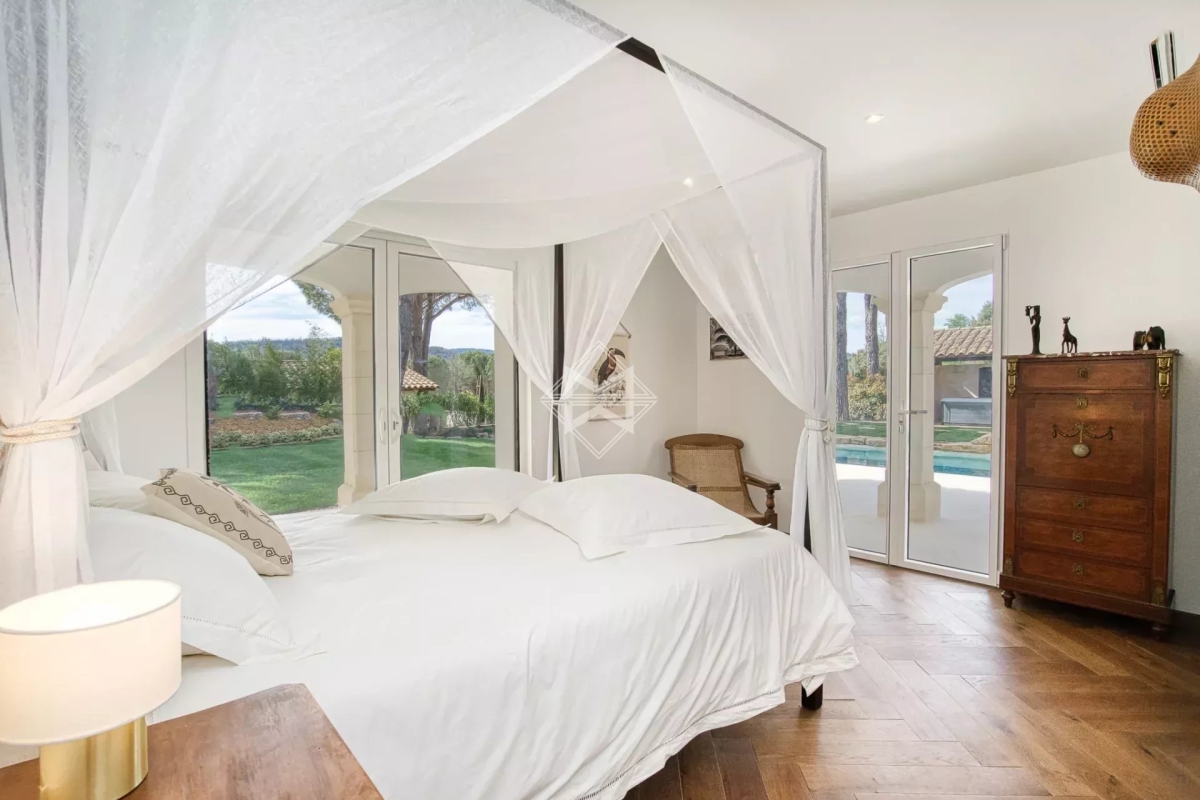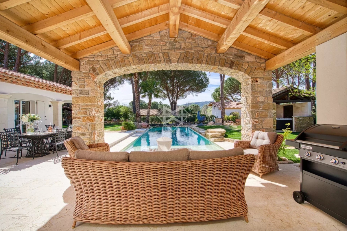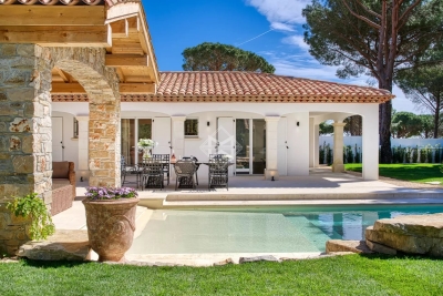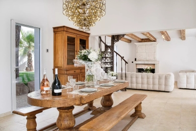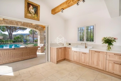 Cette propriété de 280m2, répartie sur deux étages, est dotée d'une cuisine tout équipée (avec cafetière Nexpresso et machine Delonghi), d'un grand salon lumineux et d'une salle à manger. On dénombre 5 chambres en suite au total. Certaines d'entre elles bénéficient d'une baignoire et toutes ont leurs toilettes privatisées. On peut accéder à l'étage supérieur grâce à un escalier en colimaçon, qui permet d'admirer les poutres apparentes et les fenêtres cintrées à l'étage. Juste à côté, un canapé en velours côtelé permet de se détendre en toute quiétude, au chaud en hiver et au frais en été. Le terrain extérieur bénéficie d'une surface de 2000 mètres carrés, ce qui offre une belle aire de détente. Une salle de sport climatisée a été pensée pour les plus sportifs. Au niveau des espaces extérieurs, une grande piscine, un pool house, un abri avec bain à remous, un barbecue, ainsi que 8 bains de soleil viennent compléter le tout. Un parking privatif a été prévu pour 3 voitures, avec une borne de recharge électrique. Pour les plus jeunes, une table de ping-pong, un babyfoot et deux vélos électriques viendront assurer les activités de plein air. Pour les apéritifs d'été, la terrasse extérieure fera largement l'affaire. Toutes les conditions sont réunies pour un séjour idéal, dans un cadre retiré et à l'abri des regards.