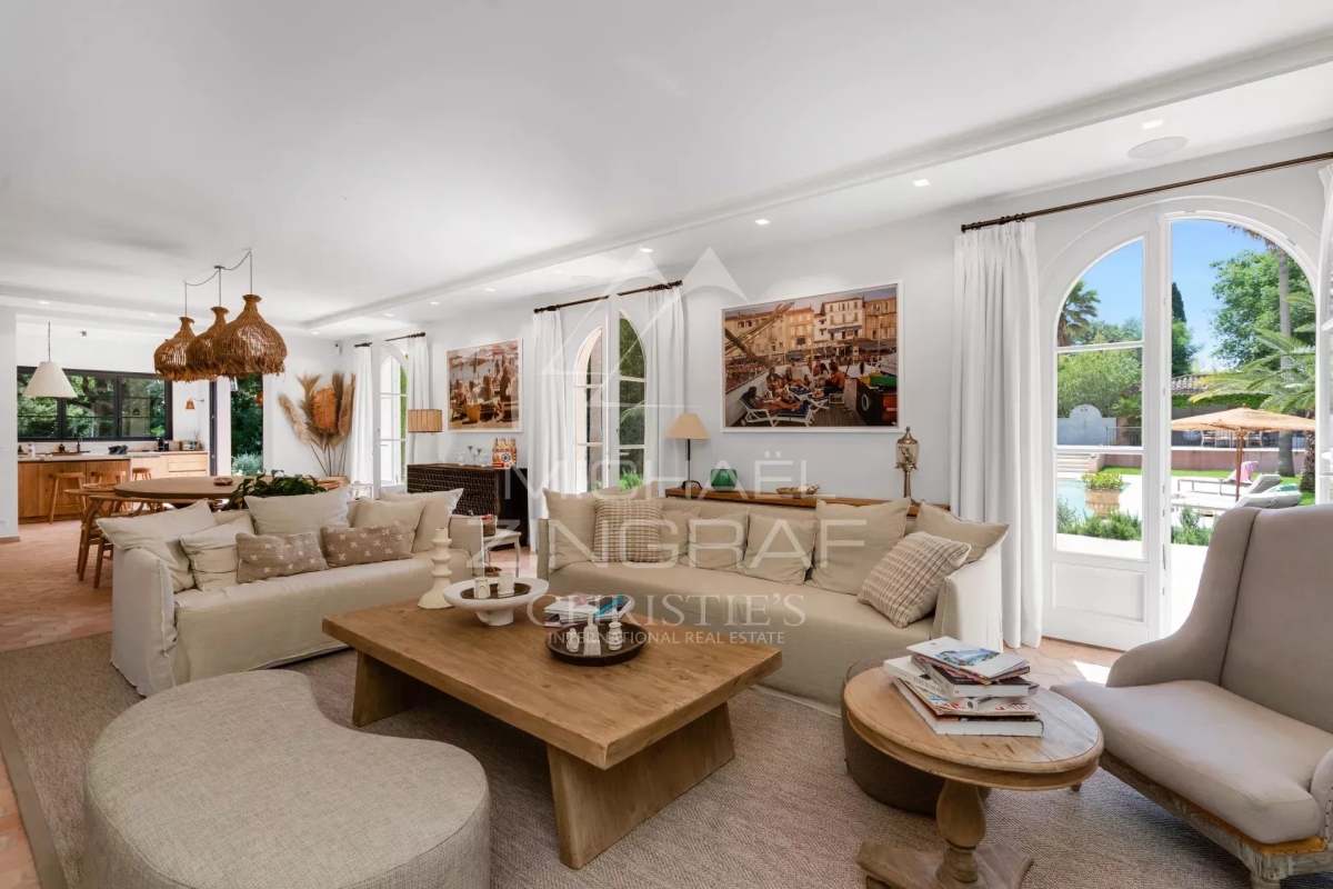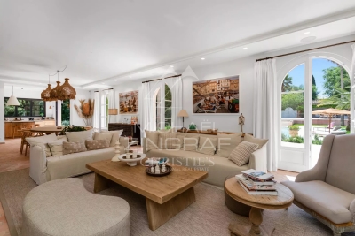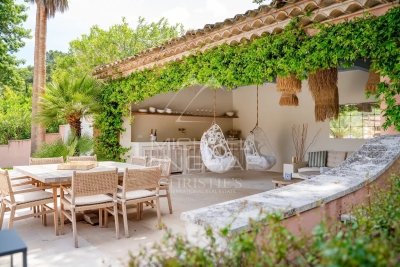 Bienvenue dans cette magnifique villa située au cœur de la pinède à Grimaud, offrant une vue imprenable sur les collines verdoyantes et les vignobles environnants. Ce havre de paix est un véritable oasis de tranquillité, entouré d'une végétation luxuriante, dans un cadre préservé et intime. La villa, de style néo-provençal, s'intègre harmonieusement dans son environnement naturel. Son grand parc magnifiquement arboré crée une atmosphère apaisante et offre de nombreuses possibilités de détente en extérieur. Vous pourrez profiter d'une grande piscine cristalline, entourée de terrasses spacieuses, et d'un pool house aménagé, comprenant un coin cuisine et un barbecue pour des moments conviviaux en famille ou entre amis. À l'intérieur, la villa se compose d'un lumineux séjour qui s'ouvre sur l'extérieur, créant une belle continuité entre les espaces de vie et le jardin. La cuisine équipée, moderne et fonctionnelle, répondra à toutes vos attentes. La villa dispose de cinq chambres, chacune avec sa propre salle de bains et toilettes, garantissant confort et intimité à tous les occupants. Cette villa est un lieu d'exception, où la beauté du paysage se mêle au confort et à l'élégance, offrant un cadre de vie idyllique pour des moments inoubliables.