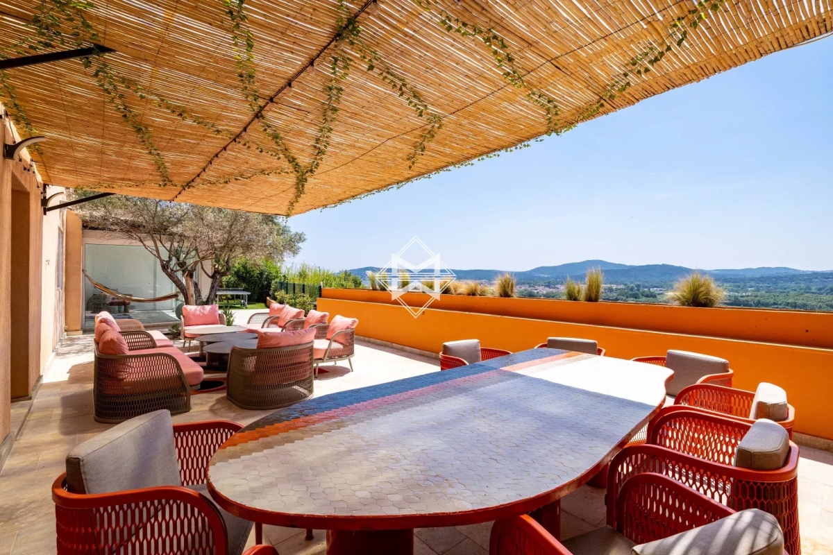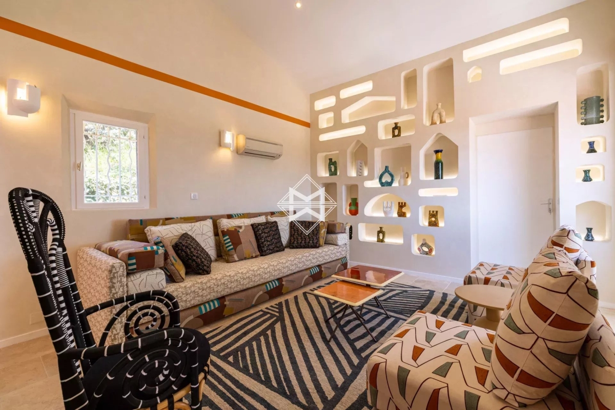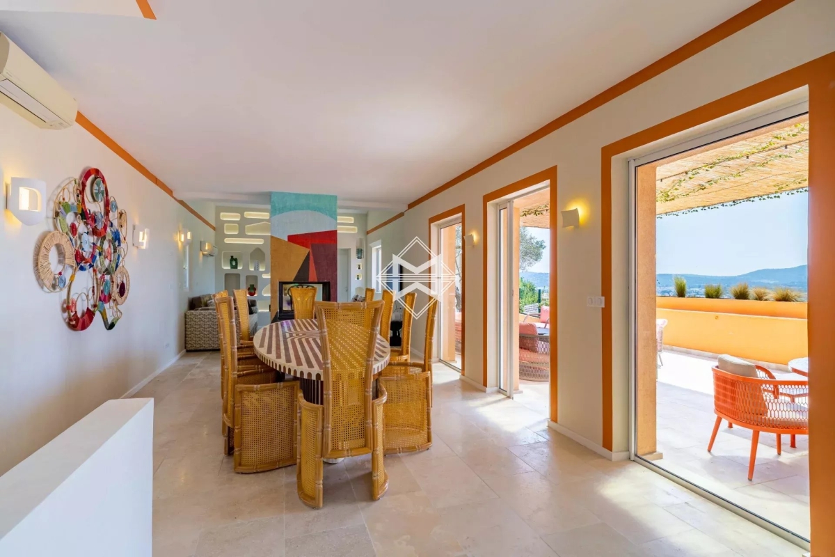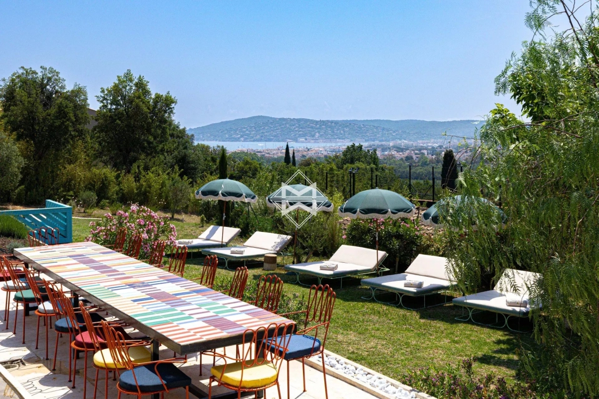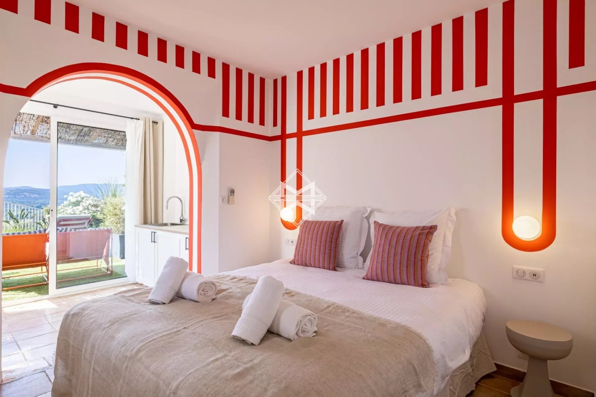 Située dans le pittoresque village de Grimaud, cette propriété se distingue par son architecture contemporaine et sa décoration colorée. Son emplacement privilégié offre une vue imprenable sur la mer et le village, tout en garantissant une atmosphère paisible et intime. Alliant un design moderne avec des lignes épurées et des éléments naturels, elle incarne parfaitement le charme méditerranéen. La villa peut accueillir une vingtaine de convives grâce à ses nombreuses chambres et dépendances, chacune équipée de sa propre salle de bains et kitchenette. Les espaces de vie sont agréables et spacieux, parfaits pour se détendre ou recevoir des invités. Profitez du soleil de Grimaud autour de la piscine, du pool house ou du jacuzzi, dépensez-vous sur le terrain de padel privé de la propriété, ou amusez-vous dans la boîte de nuit privée de la propriété. Cette villa est idéale pour des événements festifs en famille ou entre amis, offrant à la fois confort et élégance dans un cadre exceptionnel.
