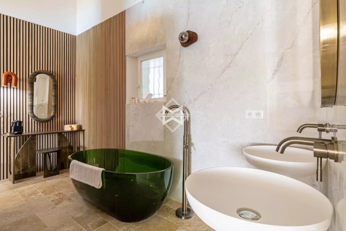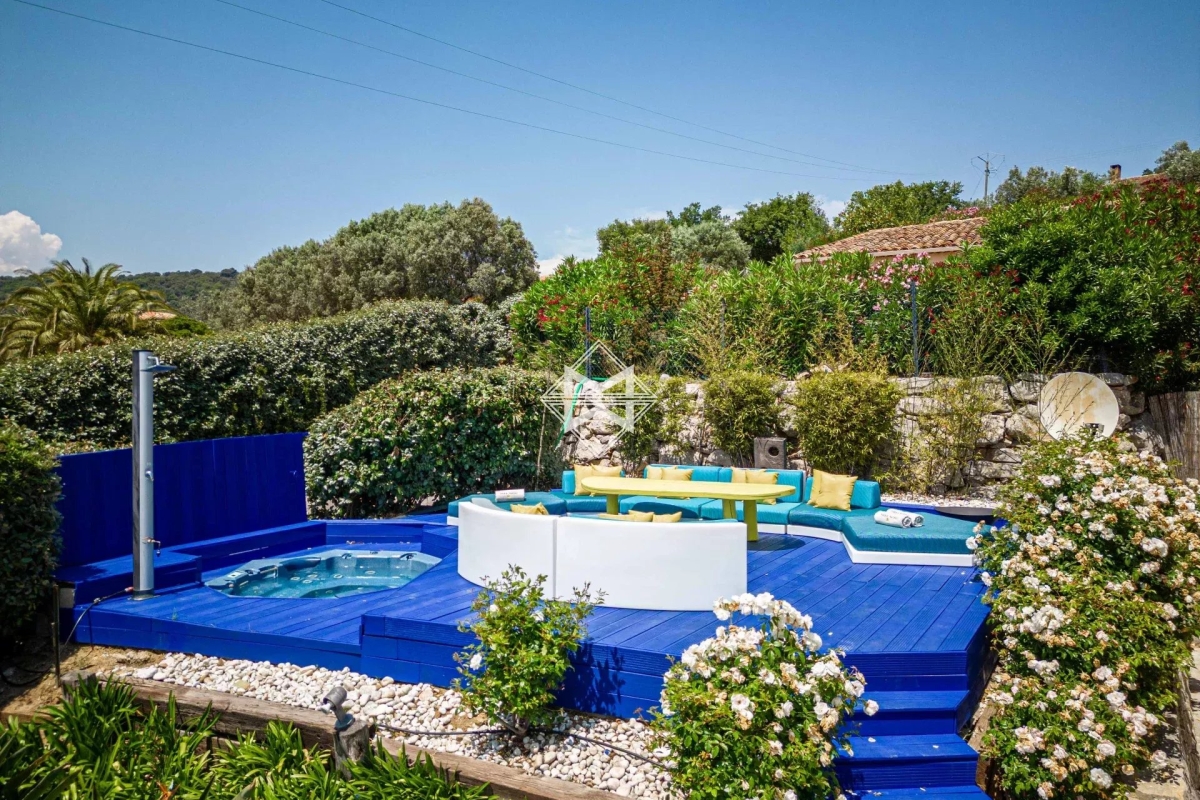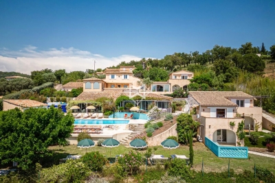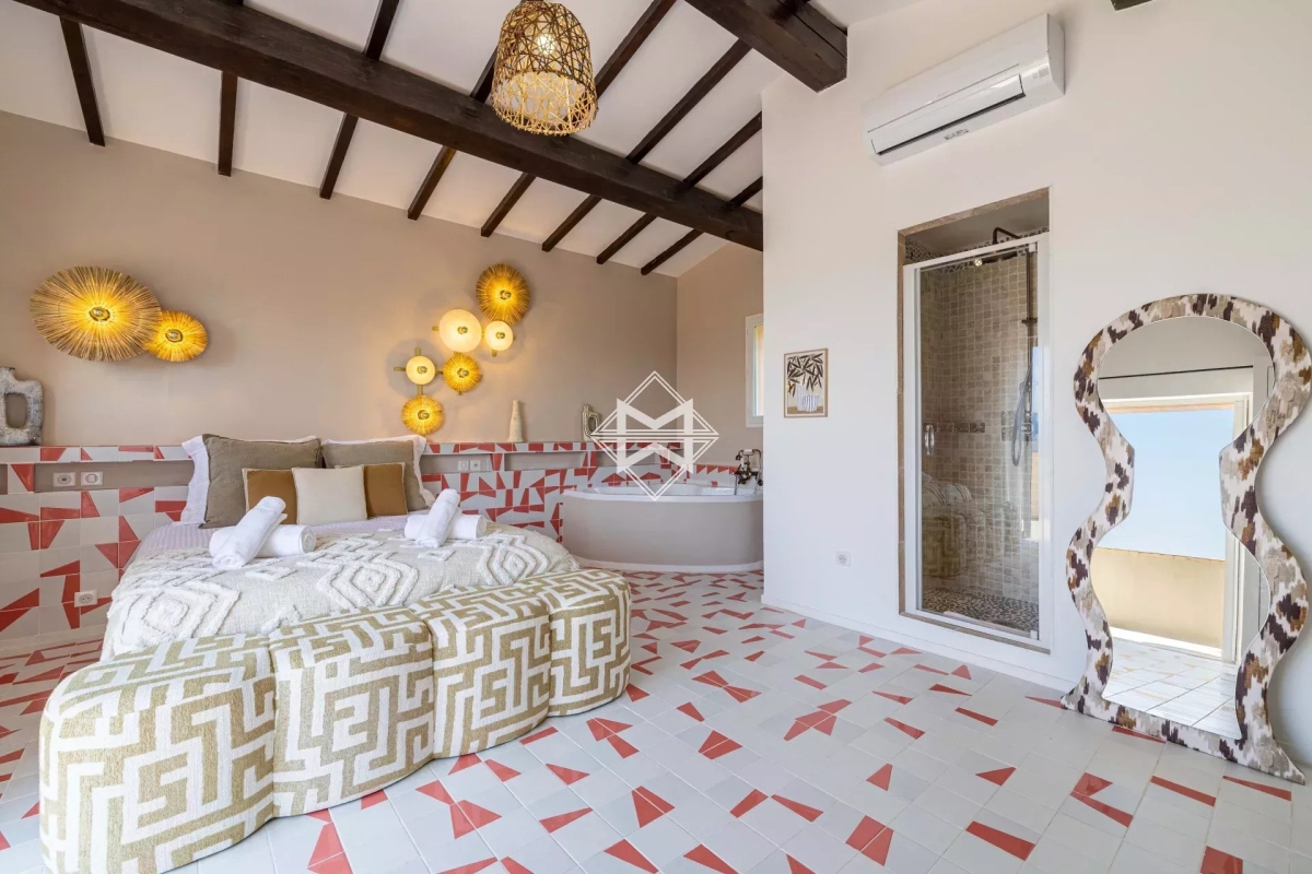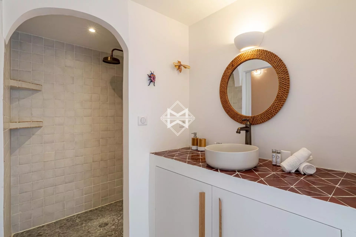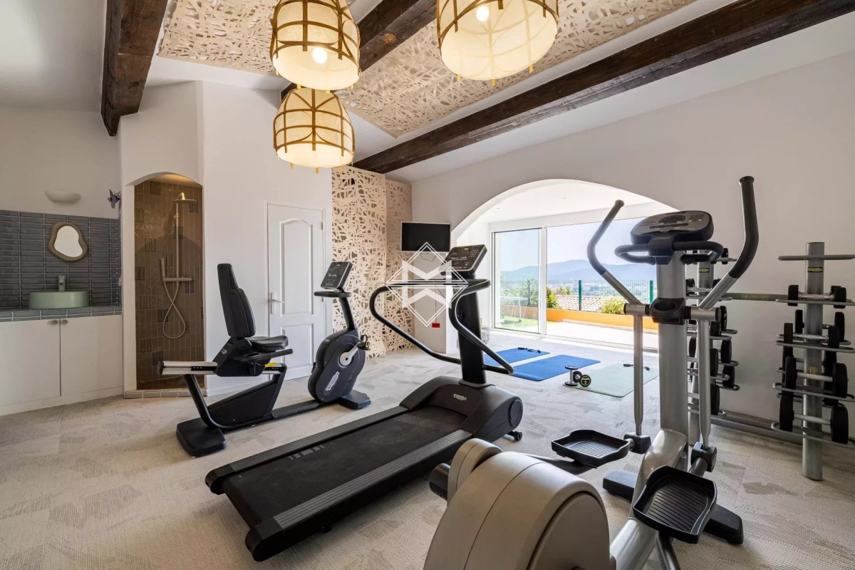 Située dans le pittoresque village de Grimaud, cette propriété se distingue par son architecture contemporaine et sa décoration colorée. Son emplacement privilégié offre une vue imprenable sur la mer et le village, tout en garantissant une atmosphère paisible et intime. Alliant un design moderne avec des lignes épurées et des éléments naturels, elle incarne parfaitement le charme méditerranéen. La villa peut accueillir une vingtaine de convives grâce à ses nombreuses chambres et dépendances, chacune équipée de sa propre salle de bains et kitchenette. Les espaces de vie sont agréables et spacieux, parfaits pour se détendre ou recevoir des invités. Profitez du soleil de Grimaud autour de la piscine, du pool house ou du jacuzzi, dépensez-vous sur le terrain de padel privé de la propriété, ou amusez-vous dans la boîte de nuit privée de la propriété. Cette villa est idéale pour des événements festifs en famille ou entre amis, offrant à la fois confort et élégance dans un cadre exceptionnel.