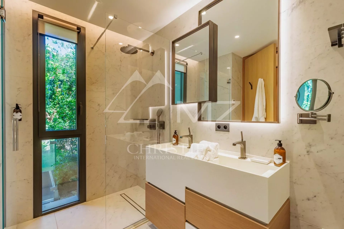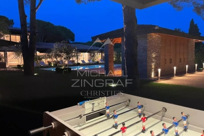 Idéalement située à Ramatuelle, à proximité des plages de Tahiti, cette propriété de prestige vous offre un cadre de vie exceptionnel, avec un parc parfaitement arboré et spacieux, La villa dispose de 3 niveaux, à l'intérieur de la villa, au rez-de-chaussée, vous trouverez un espace lumineux et ouvert sur l'extérieur, un grand séjour avec une cuisine aménagée, 2 chambres de maître et 3 chambres en suite, chacune disposant de sa propre salle de bains, A l'étage, une chambre avec sa salle de douche, son dressing ainsi que sa terrasse privative. Au sous-sol, vous pourrez vous détendre et vous ressourcer dans le hammam et la salle de sport, ou encore vous faire masser dans la salle dédiée. La cuisine de service ainsi que les 2 chambres de services sont également disponibles pour votre confort. La villa possède également une piscine chauffée avec son pool house et bar. Un cadre de vie paisible et élégant pour séjourner. N° d'agrément : 83101 000739 2R