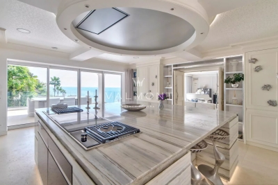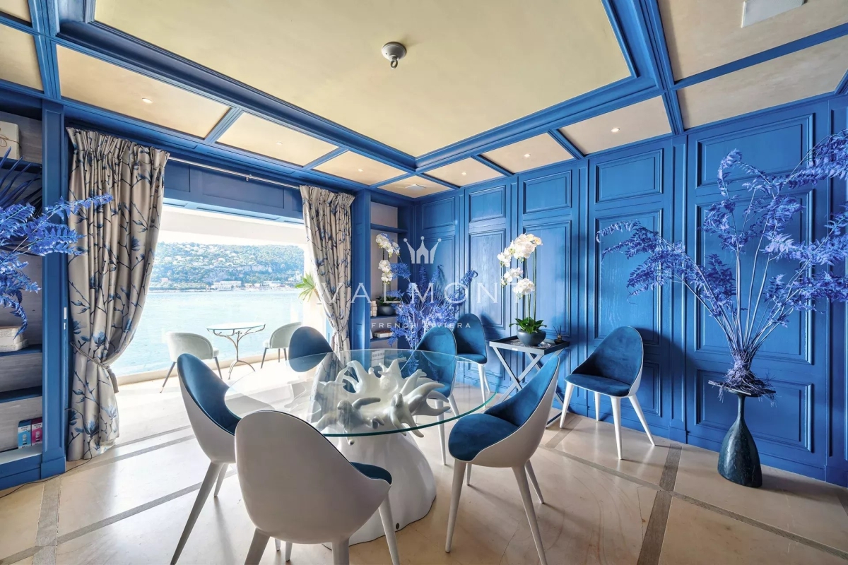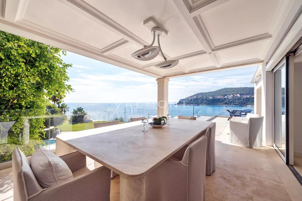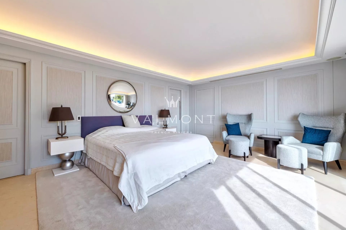 SAINT-JEAN-CAP-FERRAT : Située dans un domaine sécurisé, cette villa en bord de mer s'étend sur trois niveaux et offre 550 m² d'espaces de vie élégants. Implantée sur un terrain plat d'environ 3 400 m², la villa s'ouvre au niveau intermédiaire par des portes doubles depuis la cour intérieure, donnant sur un vaste hall avec piano. Un ascenseur dessert tous les niveaux. Le grand salon et la salle à manger s'ouvrent sur une terrasse offrant une vue imprenable sur la mer. Ce niveau comprend également une cuisine entièrement équipée, un bureau avec coin salon et une chambre avec salle de bain attenante. Au niveau inférieur du jardin, un vaste salon mène à une terrasse couverte d'environ 15 mètres avec une vue panoramique sur la mer. Ce niveau abrite également une cuisine d'été avec accès à la piscine et au jardin, des toilettes invités, trois chambres, une salle de cinéma et un hammam. Le dernier étage, accessible par ascenseur ou escalier, dispose de deux suites principales avec vue sur la mer et terrasses privées, chacune avec salle de bain attenante, dressing, douche à l'italienne et toilettes invités séparées. Deux autres chambres complètent cet étage. Les prestations supplémentaires incluent un parking au sein du domaine, un système d'alarme, une connexion internet, un portail électrique et un barbecue.