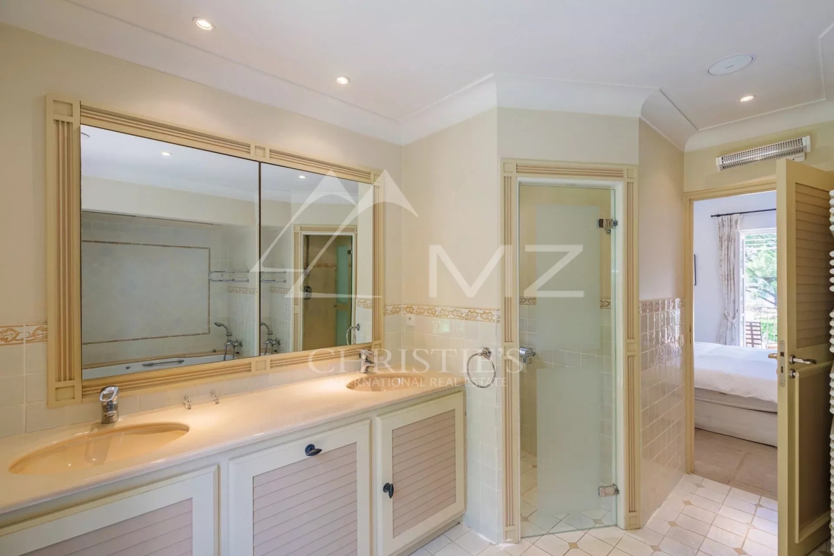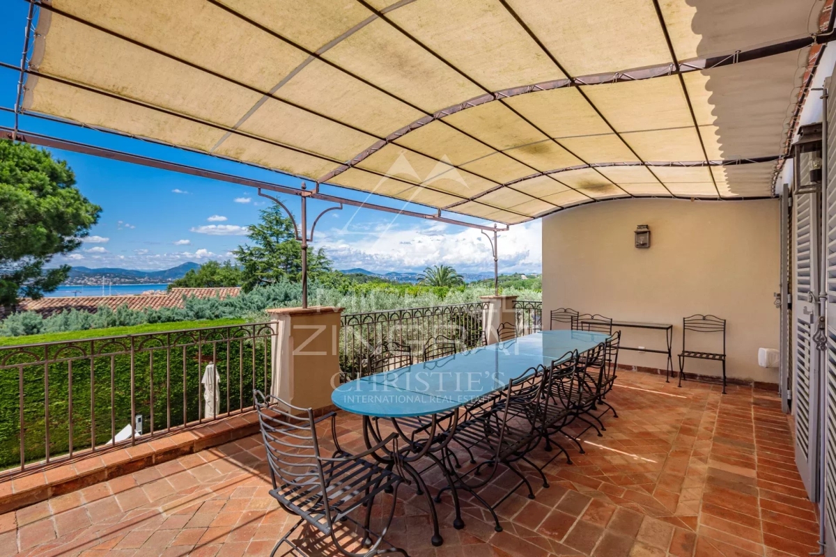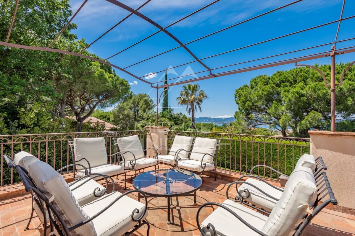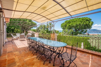 A deux pas du centre ville, cette jolie maison provençale est située sur les hauteurs d'un domaine sécurisé et résidentiel ce qui offre une superbe vue sur la mer. Elle est composée de 5 chambres en rez de jardin et de 2 chambres en rez de chaussée avec chacune sa salle de douche. Le salon traversant s'ouvre sur une grande terrasse côté piscine face à la mer et une seconde ombragée côté jardin. Numéro d'agrément : 83119000209MX