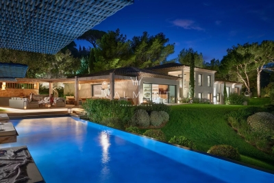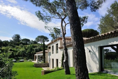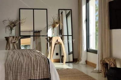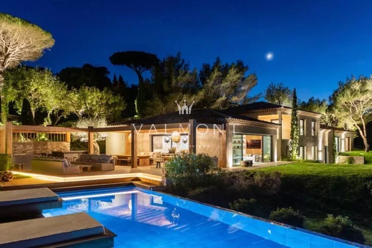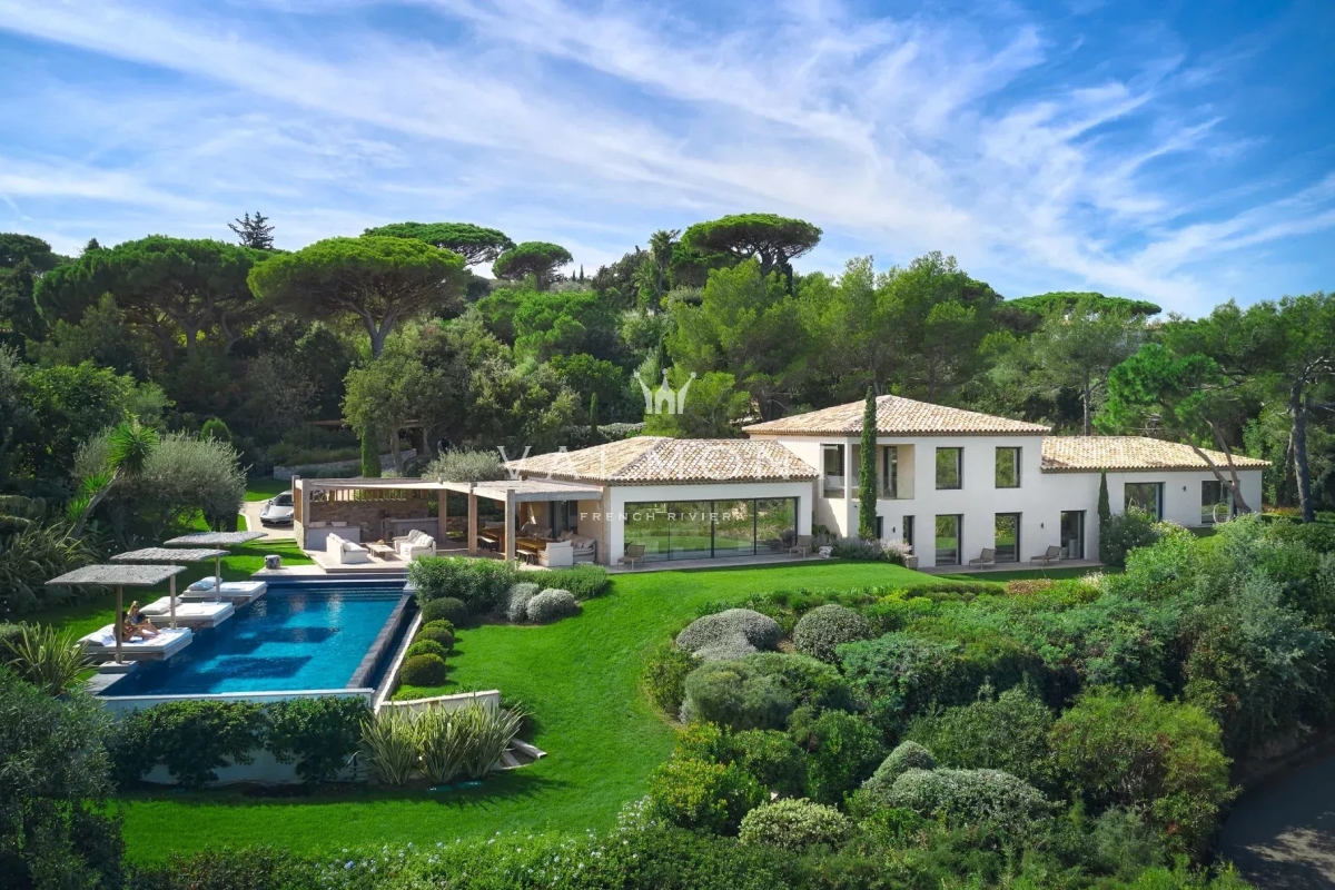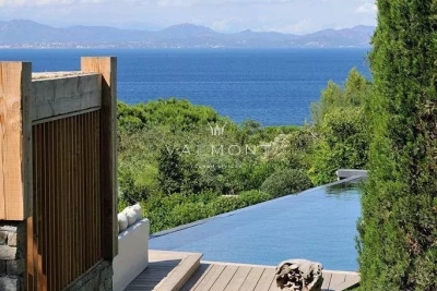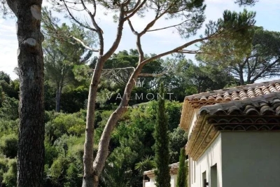 SAINT TROPEZ: Propriété récente offrant belle vue mer, située dans le prestigieux domaine de Parcs de Saint Tropez. D'une surface d' environ 520 m² la villa dispose de 9 chambres avec leurs salles de bain. Au rez-de-chaussée, toutes les pièces bénéficient de la vue mer : le salon et la salle à manger avec la terrasse, les chambres avec leur salle de bains en suite. Au premier étage se trouvent un bureau et une chambre avec salle de bains. Au niveau supérieur on accède à quatre autres chambres et leur salles de bains. Finitions et ameublement de qualité. Terrain plat de 4400 m2 environ. Grande piscine chauffée de 16m avec son pool house. Accès direct dans le sentier menant à la mer.
