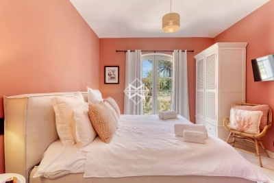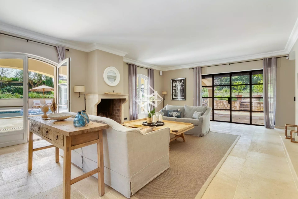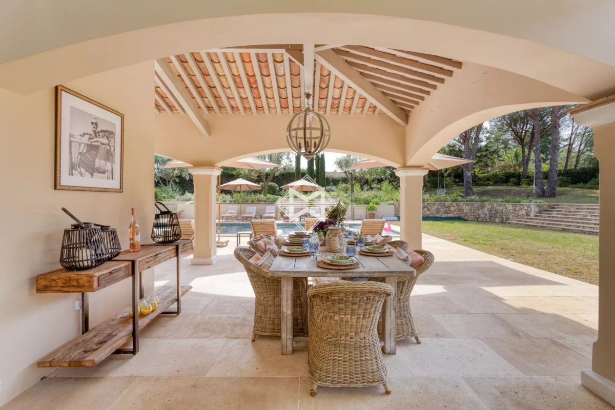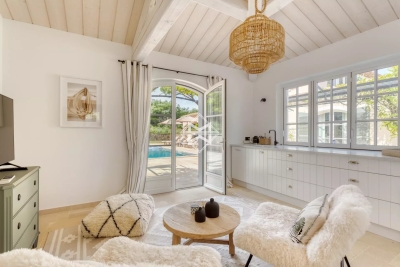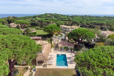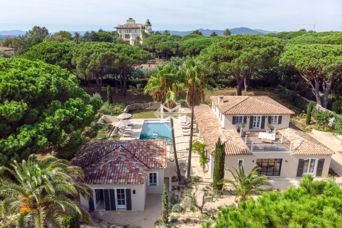 Belle propriété de charme située dans le très exclusif et recherché Domaine prisé des « Parcs de Saint-Tropez », sécurisé et gardienné, à proximité du centre et des plages de Saint-Tropez. A l'abri des regards, et exposée sud/ouest, cette élégante bastide à l'architecture tropézienne avec sa grande terrasse de toit totalise environ 300 m² de surface habitable, comprenant notamment un grand espace de vie lumineux (séjour avec cheminée, salon tv, cuisine) et 4 suites dont 1 suite pour enfants. Indépendamment, un pool house décoré avec goût et totalement équipé d'une kitchenette, d'une chambre en suite et une chambre en suite pour enfant. La propriété jouit d'un beau terrain paysager plat aux essences méditerranéennes de 3508 m², agrémentée d'une piscine chauffée. Grand abri voiture, fontaine, alarme, climatisation, sono Bose. Beaucoup de charme pour cette propriété située à l'une des adresses les plus prestigieuses de Saint-Tropez.