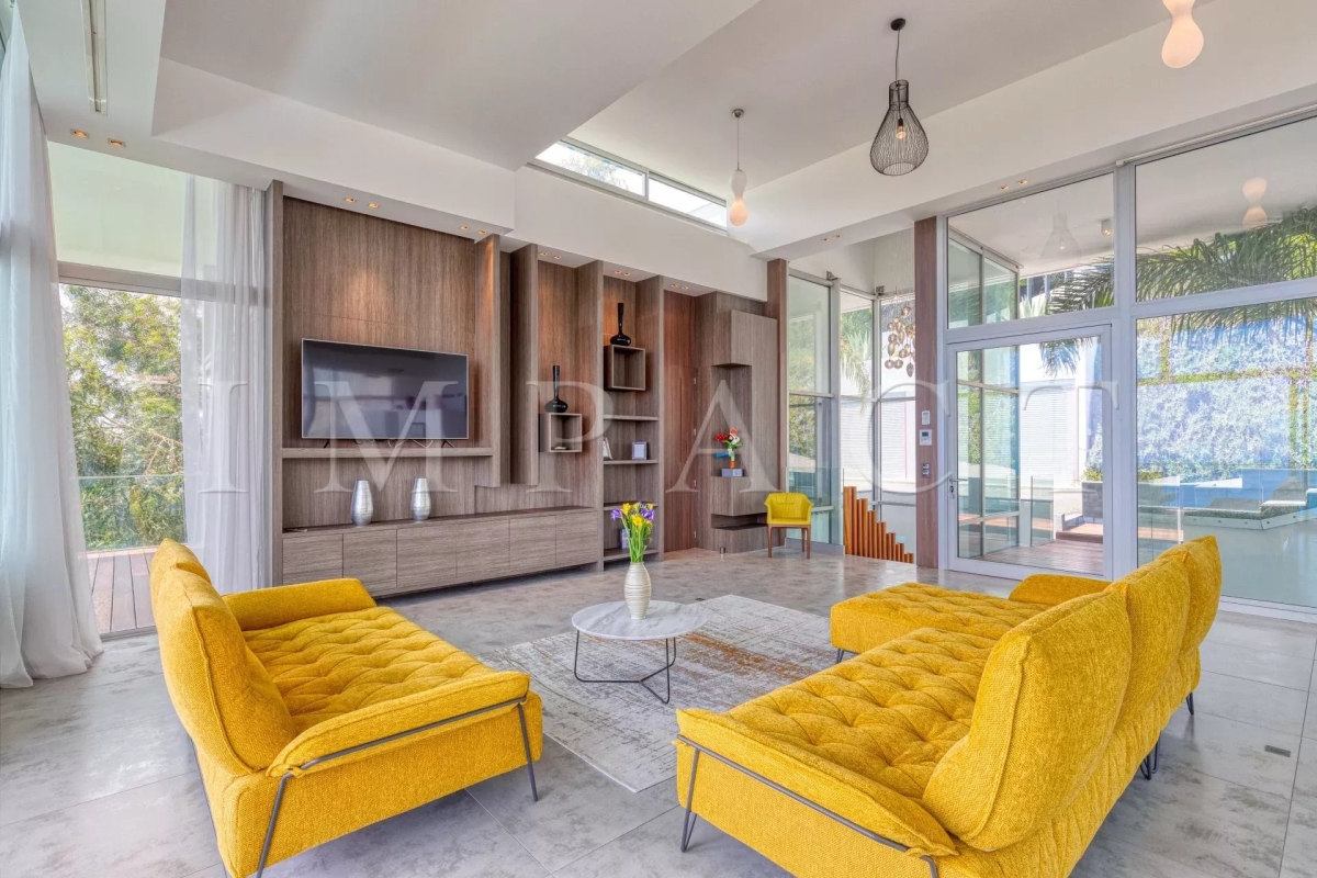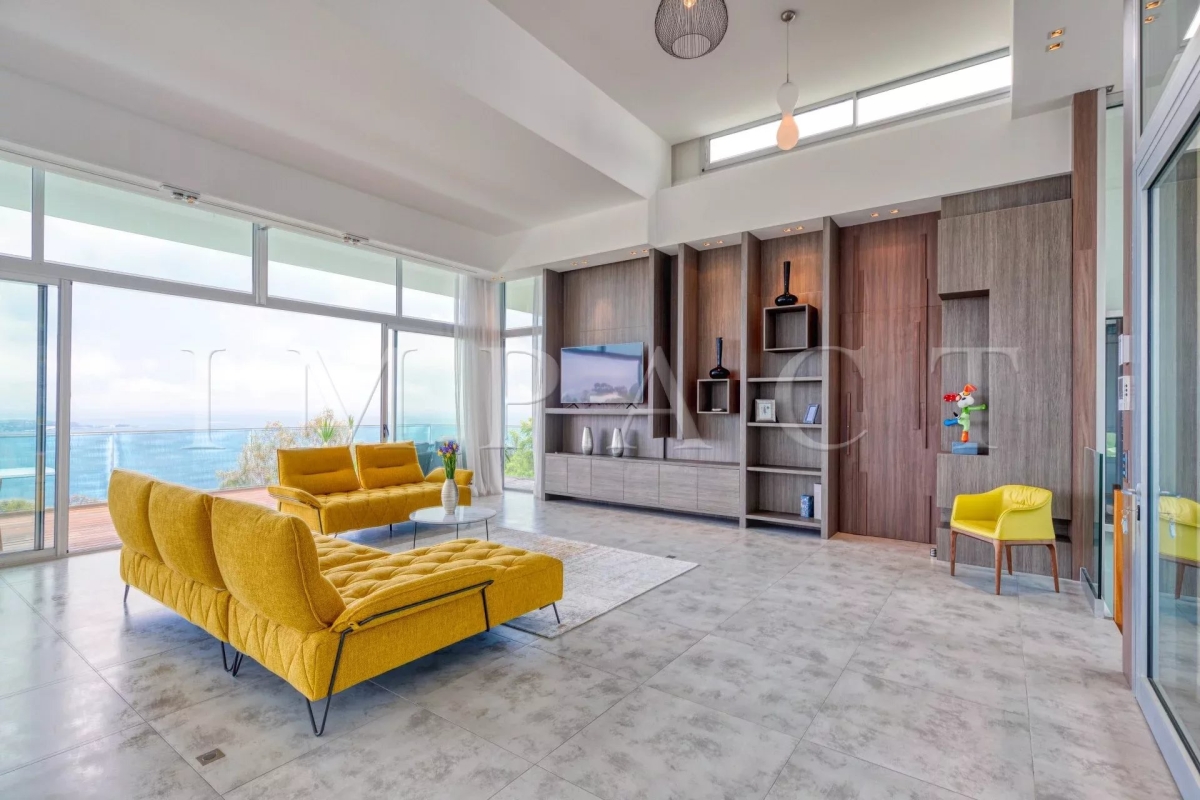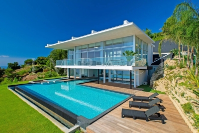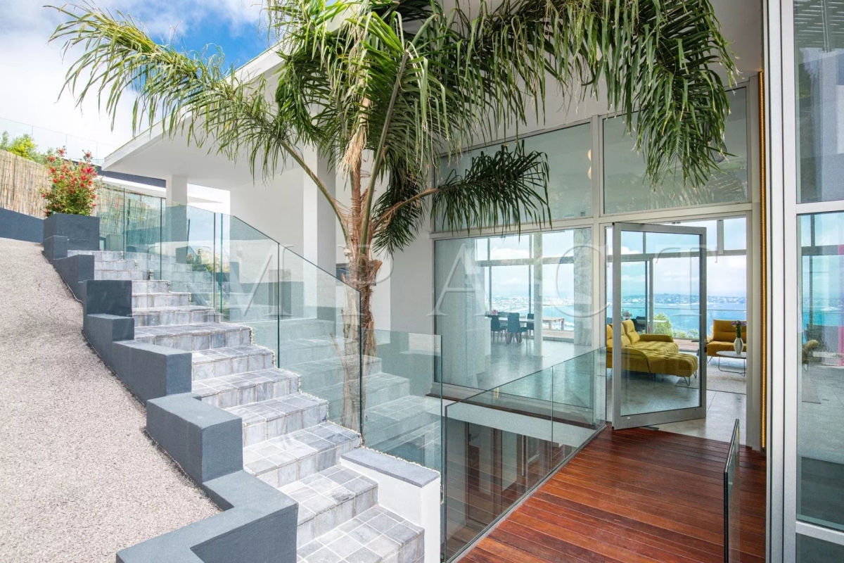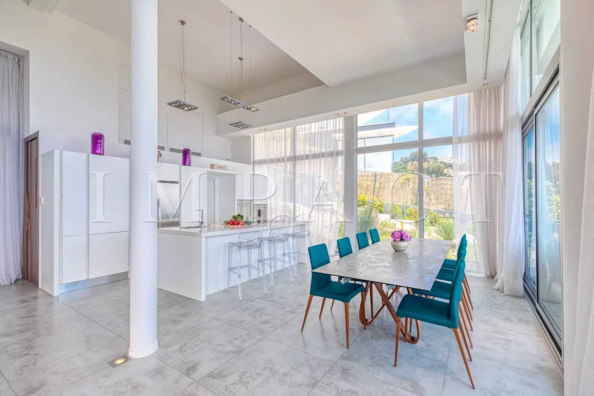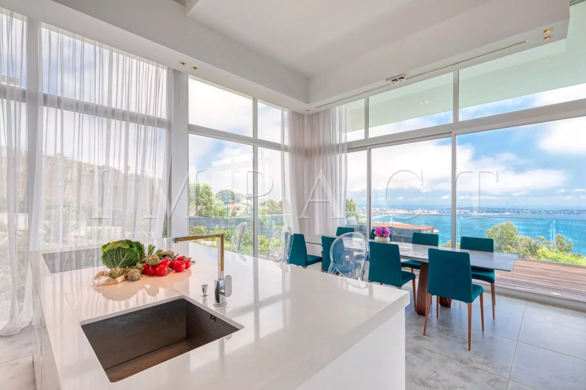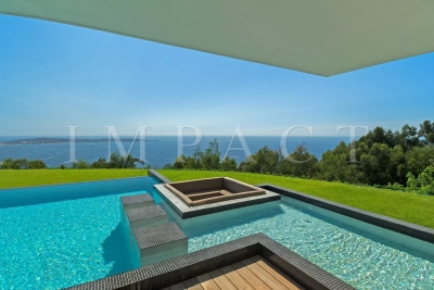 Splendide villa d'architecte de 258m², 5 chambres et 5 salles de bain, piscine, vue mer panoramique dominant les Iles de Lérins jusqu'au Cap d'Antibes sur un terrain de 2500m² de jardin paysager avec une grande diversité d'essences Méditerranéennes (palmier, citronnier, bambou, citronnier, cactus). Rez de chaussé : Hall d'entrée avec toilettes invités Double salon / salle à manger de 100m², vue mer : 2 canapés, télévision, table repas pour 8 personnes. Cuisine ouverte entièrement équipée : réfrigérateur américain, four, micro-onde, plaque induction, lave-vaisselle, machine à café. Buanderie avec lave-linge. Chambre maître N°1 vue mer – accès terrasse: lit double (160cm), dressing, salle de bain ensuite avec baignoire, douche, double vasque, toilettes. Rez de piscine : Chambre N°2 - accès piscine, vue mer : lit double (160cm), dressing, salle de douche toilettes. Chambre N°3: 2 lits simples (2x80cm), dressing, salle de douche toilettes. Chambre N°4 - accès piscine, vue mer : lit double (160cm), dressing, salle de douche toilettes. Chambre N°5: 2 lits simples (2x80cm), dressing, salle de douche toilettes. Niveau -1 : Salle de sport : Vélo, vélo elliptique, rameur, banc de musculation, multi gym SPA : Sauna, hammam, douche glacée Toilettes invités Salon télévision Extérieur : Piscine (15 m x 5,50 m) et transats Salle à manger d'été avec table pour 10 personnes et barbecue Autres prestations : Climatisation réversible, fermeture centralisée des volets, Wi-Fi, abri de voiture. Equipée pour : 10 personnes Contact: +33778826164.