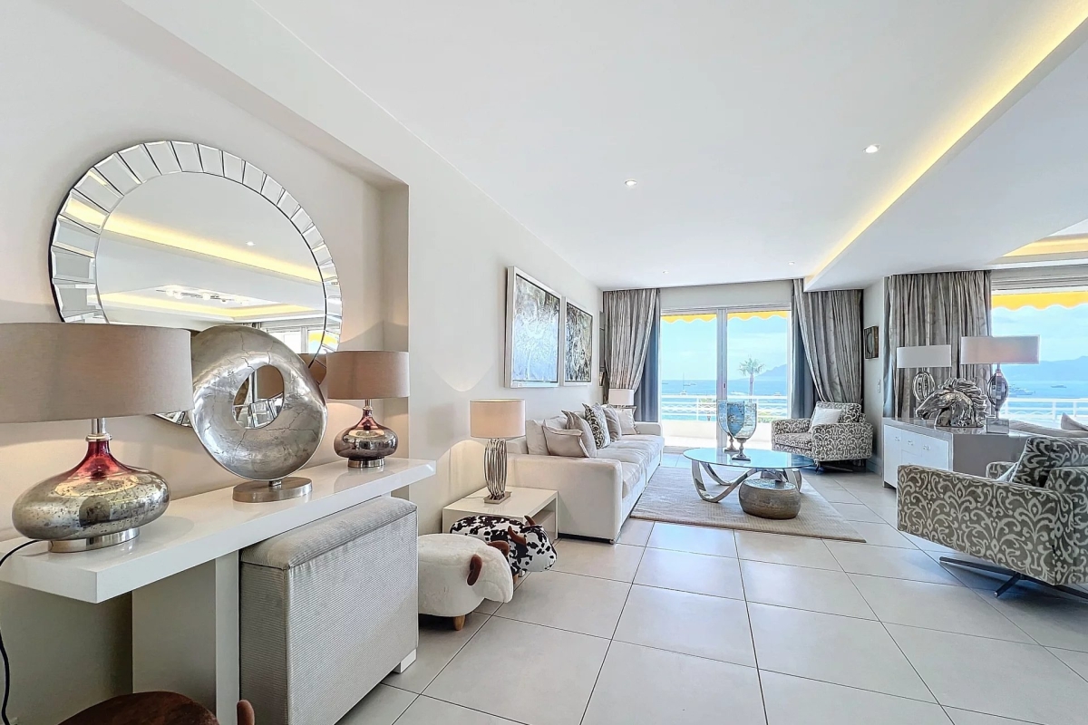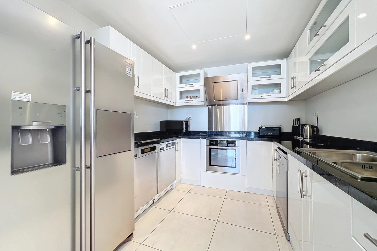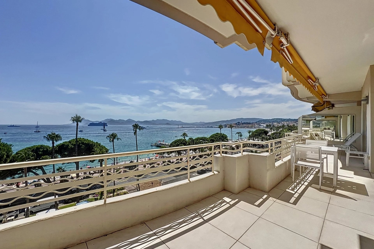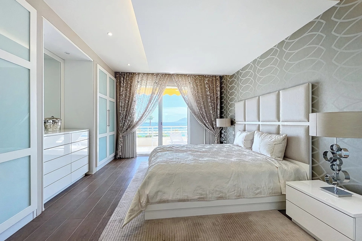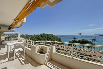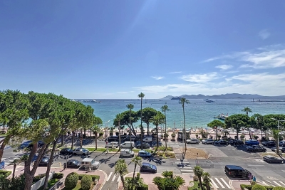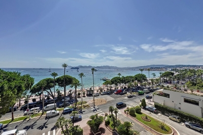In a sought-after residence on La Croisette, next to hotel Martinez, a magnificent newly renovated 2-3 bedroom apartment benefitting from a superb terrace overlooking the bay of Cannes. The apartment of 90sqm is composed of an entrance-hall with closet and a guesttoilet, a double living-room and dining-area, a separate fully equipped kitchen, a Masterbedroom with double bed 1.80, several closets and en suite shower-room. A second bedroom with double bed 1.40, a shower-room with toilet, and a room which can be used as homeoffice or a small bedroom with single bed. A/C. For seasonal rental Contact: +33609067234.