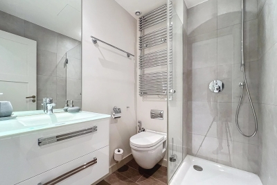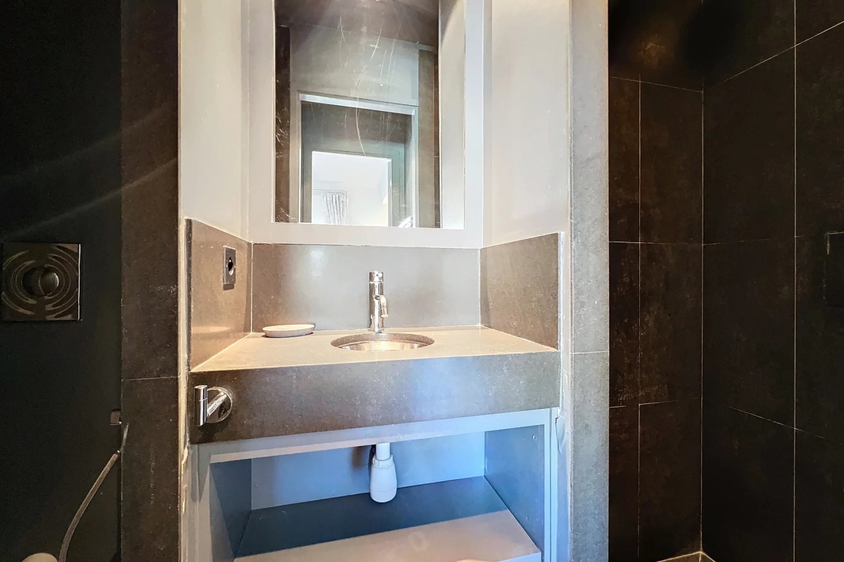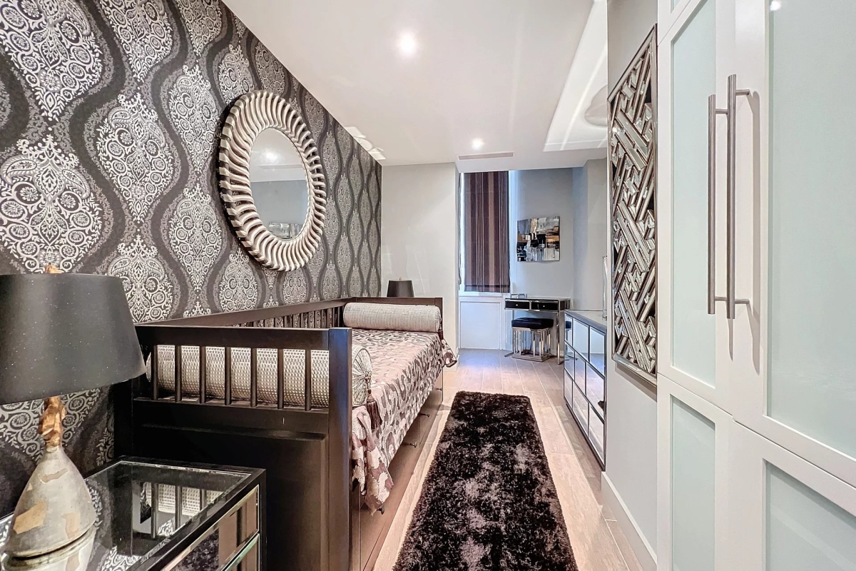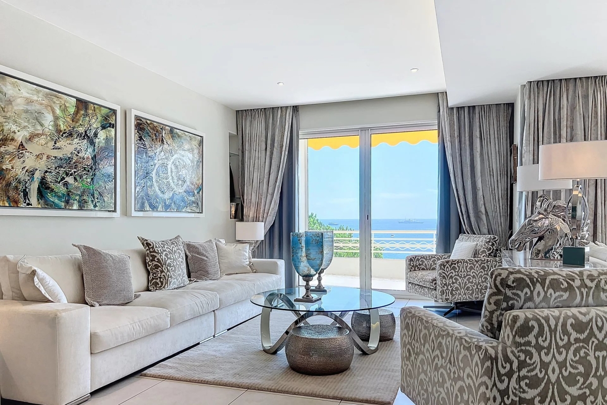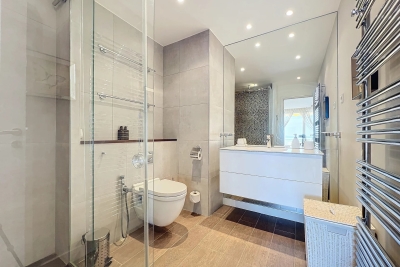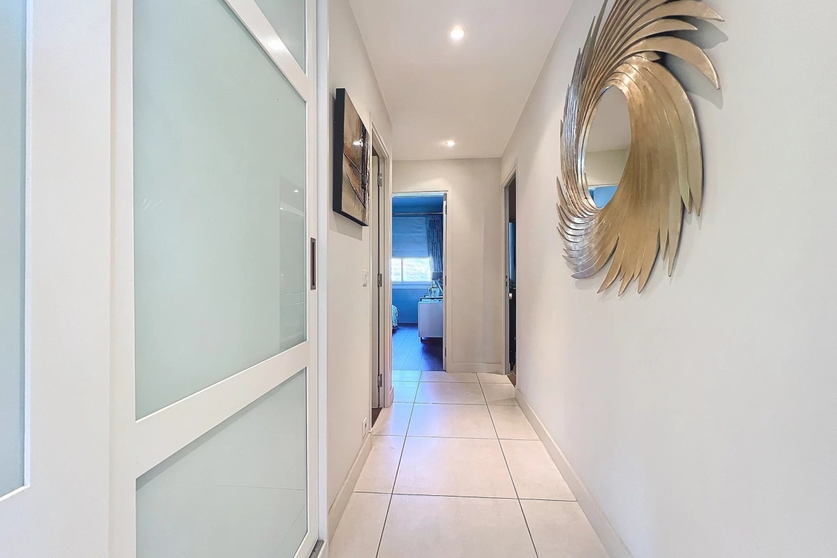In a sought-after residence on La Croisette, next to hotel Martinez, a magnificent newly renovated 2-3 bedroom apartment benefitting from a superb terrace overlooking the bay of Cannes. The apartment of 90sqm is composed of an entrance-hall with closet and a guesttoilet, a double living-room and dining-area, a separate fully equipped kitchen, a Masterbedroom with double bed 1.80, several closets and en suite shower-room. A second bedroom with double bed 1.40, a shower-room with toilet, and a room which can be used as homeoffice or a small bedroom with single bed. A/C. For seasonal rental Contact: +33609067234.
