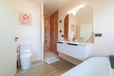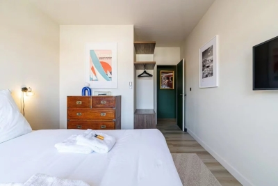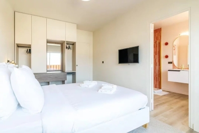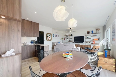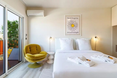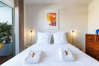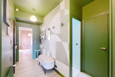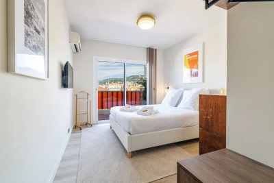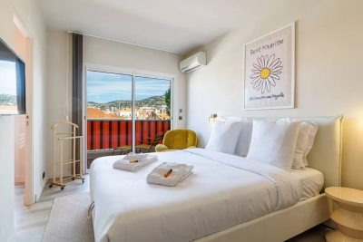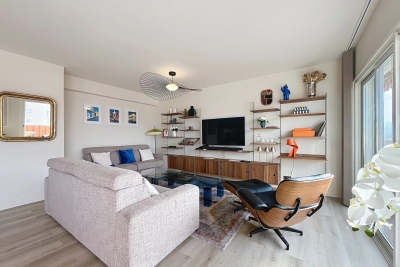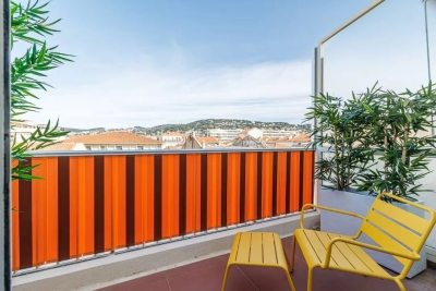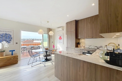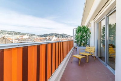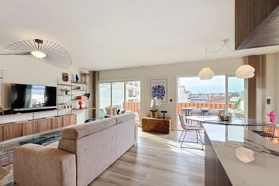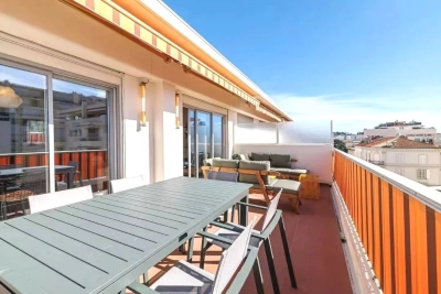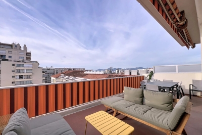In the heart of Cannes, between Rue d'Antibes and the Carré d'Or, a superb art-deco 2-bedroom apartment on the top floor, with 2 beautiful terraces. This fully renovated, walk-through apartment comprises an entrance hall, a beautiful living room with a dining area/open-plan kitchen and a lounge with two sofas, one of which can be converted into a 160 cm double bed, all opening onto a deep, South-facing terrace overlooking the city with a glimpse of the sea. The sleeping area features a master bedroom with double bed (160), en suite bath/shower room with WC, a second bedroom with double bed (160), shower room with double basin and a separate WC. Both bedrooms open onto a North-facing terrace with nice city and mountainviews. Laundry-room. Air conditioning, internet access. For seasonal rental Contact: +33609067234.