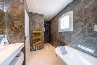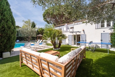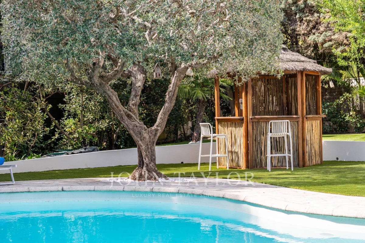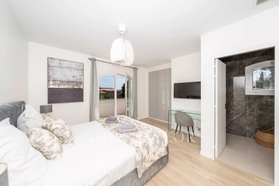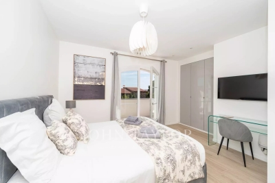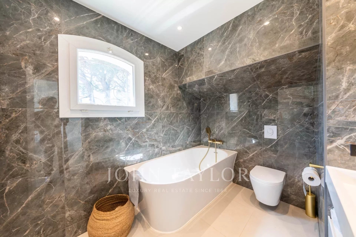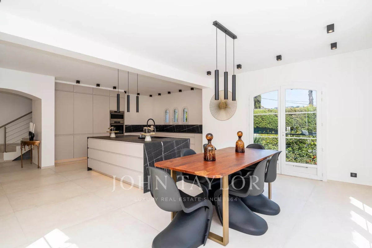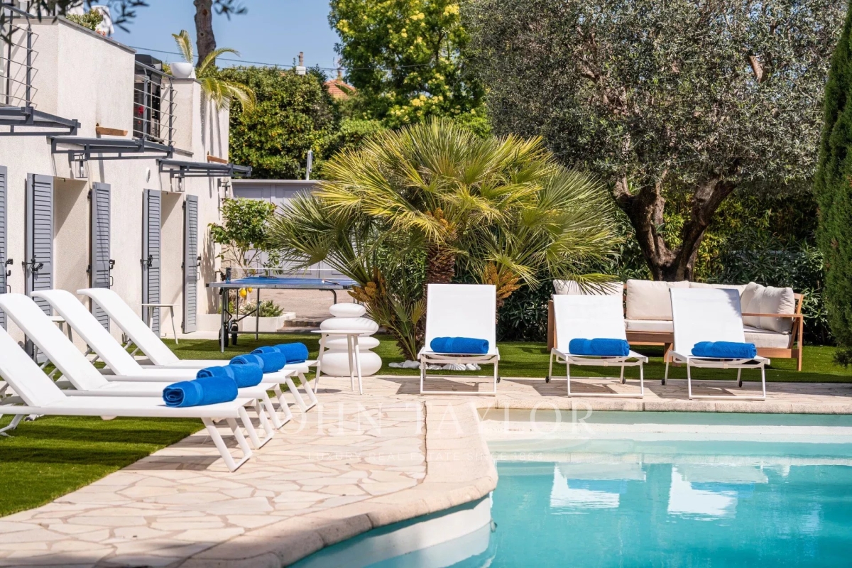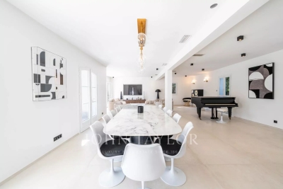 In a residential area, 10 minutes' walk from the center of Cannes and the Croisette, attractive contemporary villa with 350 m2 living space, completely renovated in 2024. Entrance opening onto a vast living-dining room, with grand piano, dining area, kitchen area, all opening onto a very large south-facing terrace equipped with barbecue, lounge and summer dining room Guest toilets ON THE FIRST FLOOR: Master suite opening onto terrace, 160 cm bed / TV Bathroom / shower / toilet GARDEN FLOOR : Bedroom (160 cm bed), dressing, opening onto the garden and the pool - Bathroom / shower and separate toilet Two bedrooms opening onto the garden, each with 160 cm bed, shower room / toilet Bedroom, 160 cm bed - Shower room / toilet Bedroom, 180 cm bed or two 90 cm beds with access to the garden - Shower room / toilet Laundry room (washing machine, dryer, refrigerator) Relaxation area with table soccer, fitness area, sauna and hammam Heated swimming pool Petanque area, table tennis Private parking area (4 cars) with 2 charging stations.