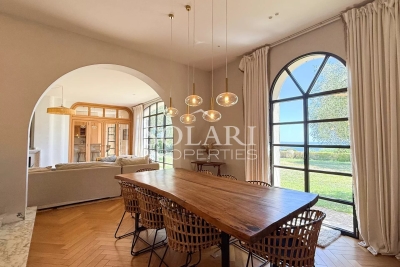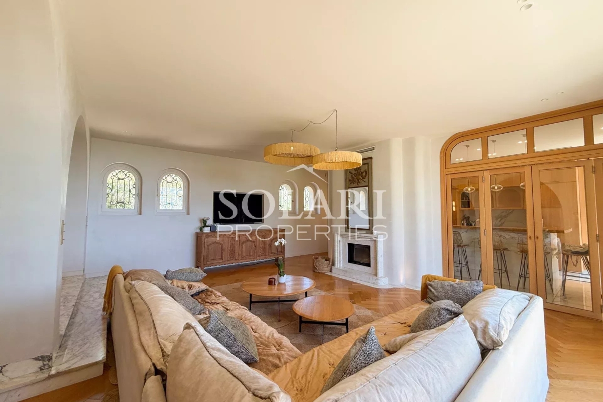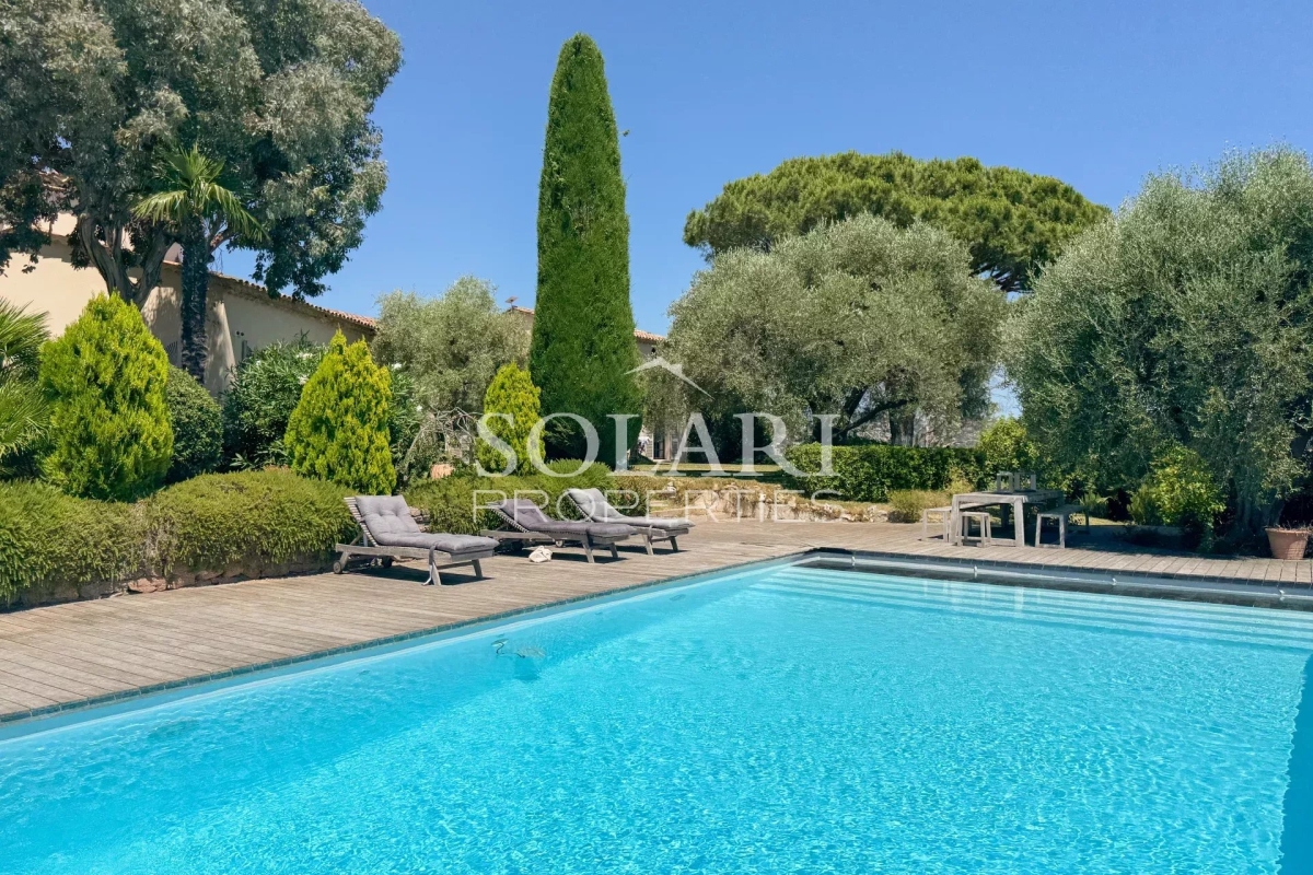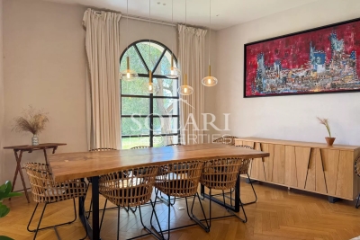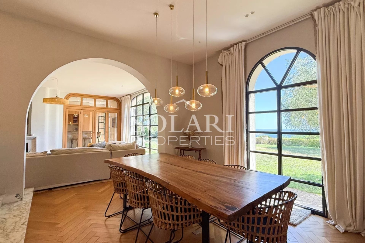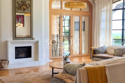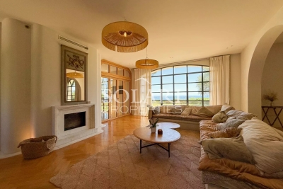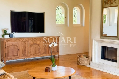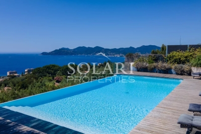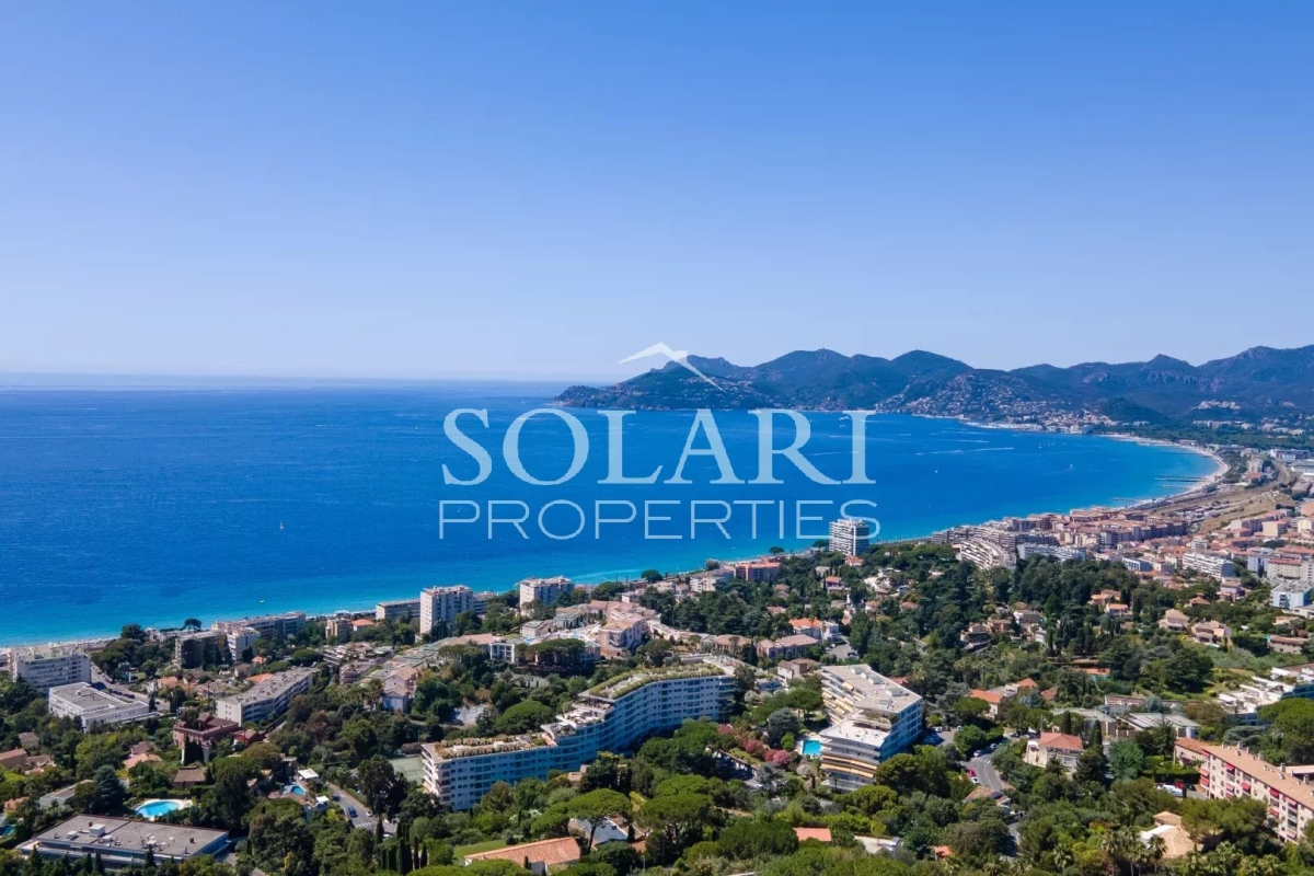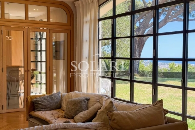 Nestled in the heart of Croix des Gardes, in a private and secure estate, this elegant Provençal villa of approximately 350m² enjoys a prime location and breathtaking panoramic views of the sea, the Lérins Islands, and the Esterel Mountains. Located just minutes from the center of Cannes, the beaches, and the motorway access, this villa offers an idyllic setting for a dream vacation on the French Riviera. Entirely on one level with the garden and swimming pool, the villa opens onto an entrance hall leading to a spacious, light-filled living room and a welcoming dining room that can accommodate up to 8 guests. The fully equipped kitchen (3 ovens, 2 dishwashers, laundry area with washing machine and dryer) and a wine cellar complete the living space. For sleeping accommodations, the villa features 5 en-suite bedrooms, including a master bedroom with its own private floor, a balcony, a dressing room, a bathroom/shower room, and a toilet. An additional bedroom with a sofa bed and a shower room is ideal for guests or staff. An office space offers the opportunity to work while admiring the view. The property is built on a magnificent flat plot of approximately 3,500 m², featuring a heated saltwater pool and outdoor areas with barbecue facilities, perfect for enjoying the beautiful weather. A large parking lot provides space for several cars.