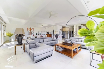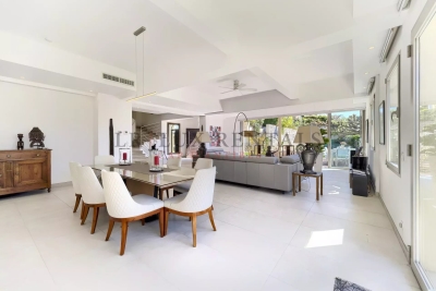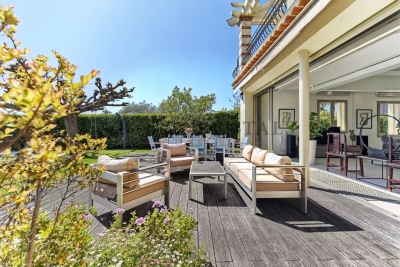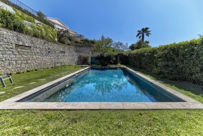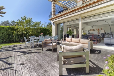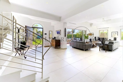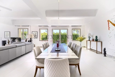 Beatiful renovated multi-storey villa with lovely sea views. Situated on a flat plot with swimming pool and petanque area. Private estate within walking distance of the beaches. Comprising an entrance hall, living and dining room opening onto garden with swimming pool and shaded terrace, large fitted kitchen opening onto shaded terrace and petanque area. En-suite bedroom. First floor: two en-suite bedrooms, 2 bedrooms sharing a bathroom, a fitted kitchen, living room and dining room opening onto a large terrace with sea views. 2nd floor: master bedroom with sea view, bathroom and shower, large dressing room and cinema room. Terrace lounge with trees. Parking spaces and garage. Contact: +33662618629.