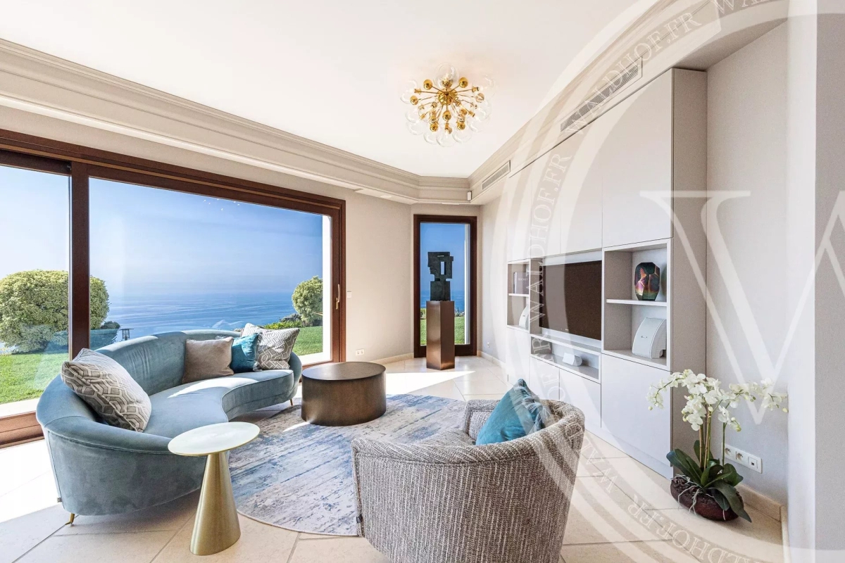Fully renovated and redecorated in 2022, the Villa offers: - A 90 m2 living room with a dining table for sixteen people and two lounge areas with a 3D television. - A kitchen equipped with advanced V-ZUG (Swiss made) appliances, including a coffee grinder and a large SUB-ZERO refrigerator. - 1 suite of 50 m2 with a separate WC, a very large bathroom with a balcony facing the sea and the beautiful village of Eze at the south front of the bedroom and a superb terrace to relax. - 7 bedrooms with stunning sea views (except one). All bedrooms have their own huge en-suite bathrooms and/or large shower rooms. - A fully equipped gym with the latest Technogym runner and multi-trainer. - A cinema room (fully equipped) with a 100 inch projector screen size, all in 3D and the best audio quality. - A pool/snooker room. - A 24-meter "Infinity" swimming pool. - A huge jacuzzi that can accommodate up to 25 people. - A terrace with plenty of seats and deckchairs, two large tables, a ping-pong table, a barbecue and an additional freezer. - Parking for more than 6 cars. This property truly offers uncompromising living, whilst being only 20 minutes from Monaco and 20 minutes from Nice and 30 minutes from Nice airport. Don't wait any longer, contact us! Contact: +33621416539.