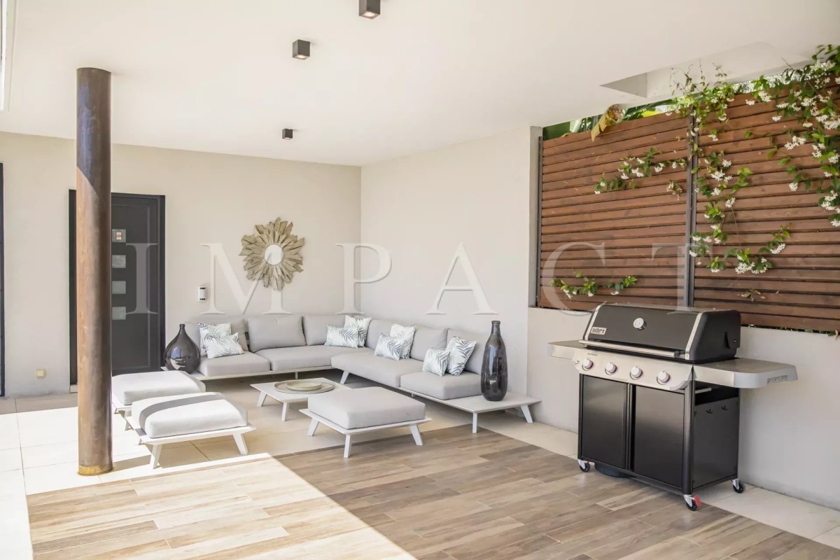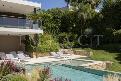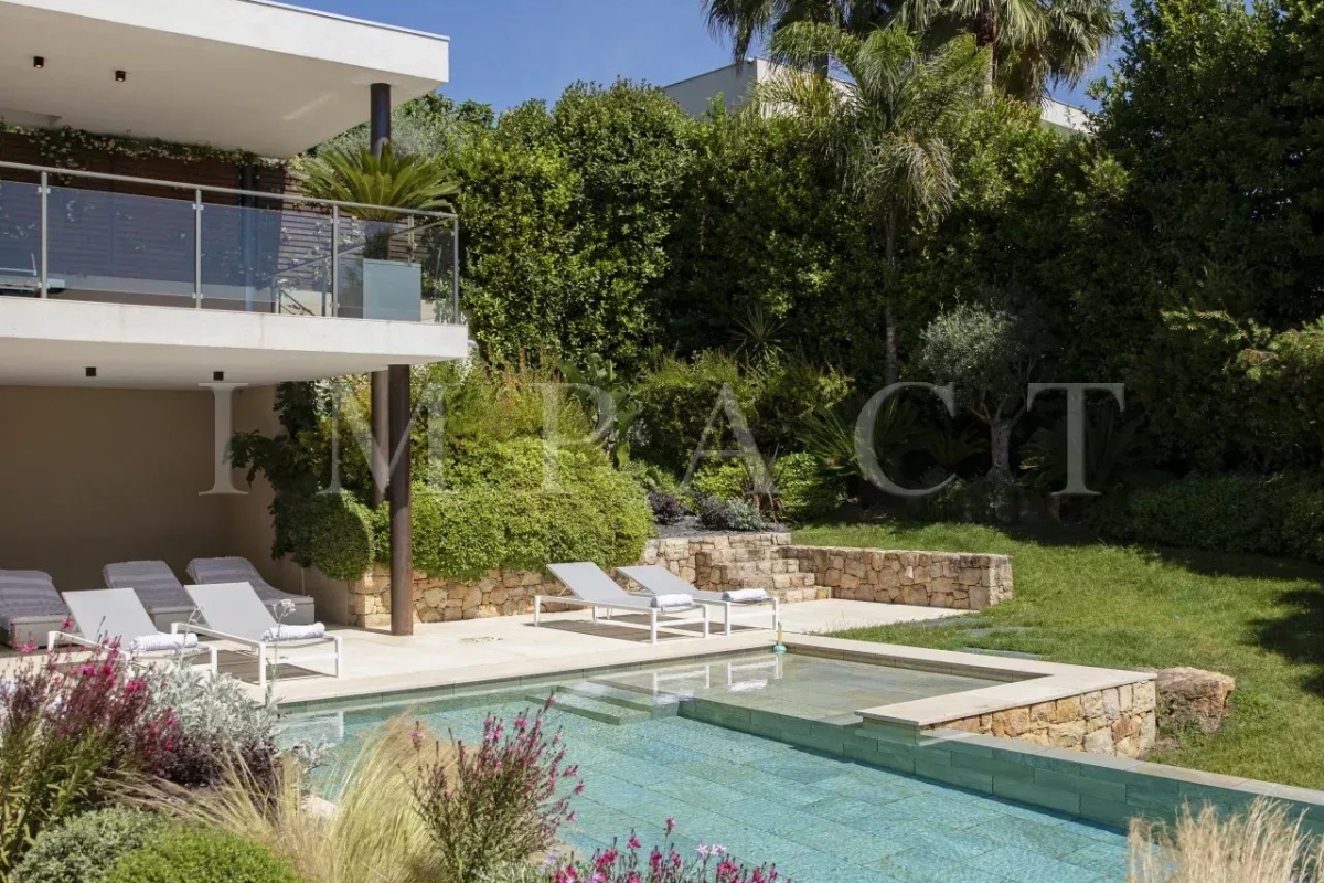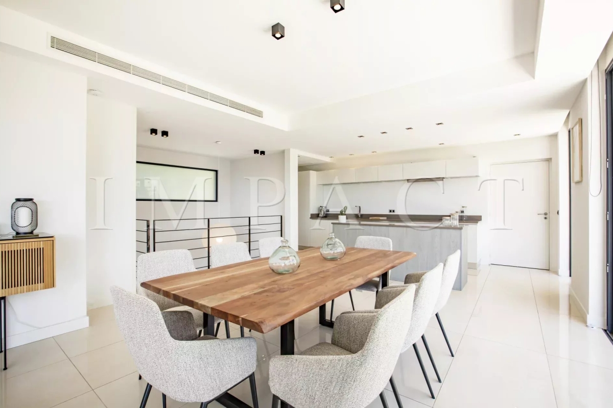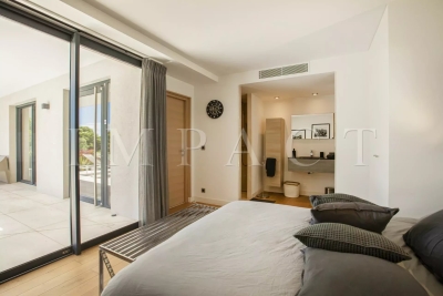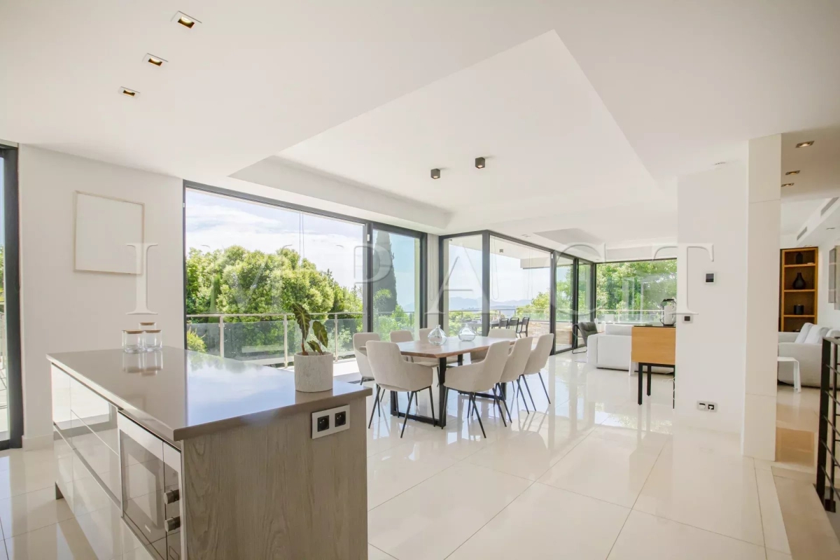 Seasonal rental - Luxurious 240m² contemporary villa with partial sea view. Description : Main level: Spacious entrance hall leading to a modern living and dining room, offering sea and pool views. Guest toilet with checkroom. Bright living room with bay windows opening onto a terrace with sea views, equipped with a large corner sofa (6 seats) and TV. Dining room with large table seating 8. Fully-equipped open kitchen: American fridge, oven, microwave, Nespresso coffee machine, dishwasher, induction hob and central island. Terrace with sea view. Dining table for 8. Barbecue area with corner sofa and 3 armchairs, seating up to 10. Garden level: Bedroom 1: double bed (180 cm), direct access to garden and pool, large dressing room, private bathroom with walk-in shower, bath, double basin and toilet. Bedroom 2: double bed (140 cm), direct access to garden and pool, dressing room, shower room with walk-in shower and basin. Bedroom 3: double bed (160 cm), direct access to garden and pool, dressing room, en-suite bathroom (in hallway) with bath, washbasin and separate toilet. Bedroom 4: double bed (160 cm), direct access to garden and pool, dressing room, private shower room with walk-in shower, basin and toilet. Laundry room: equipped with sink, washing machine and dryer. Exterior: 1,500 m² landscaped garden. Heated swimming pool (10 x 4 m). 10 deckchairs for sunbathing. Facilities: Wifi, air conditioning, garage for 2 cars. Maximum number of guests: 8 Contact: +33628933780.
