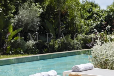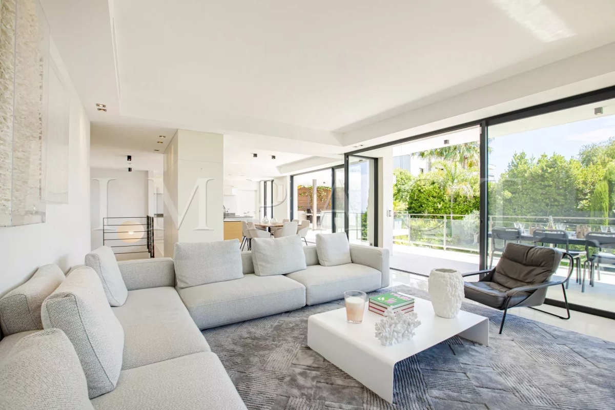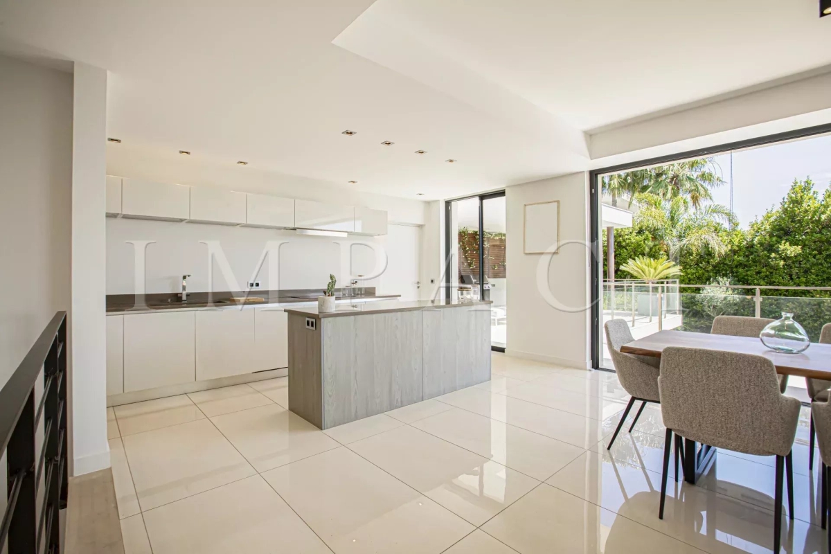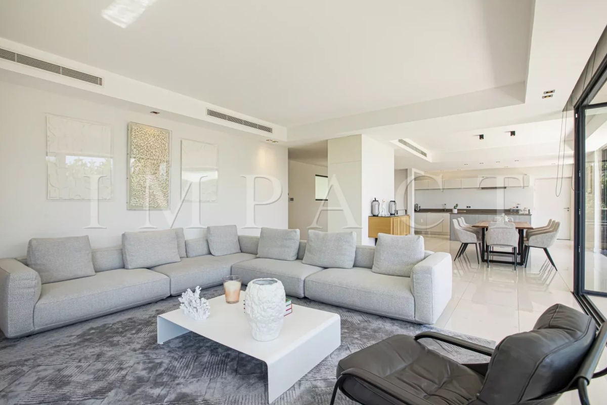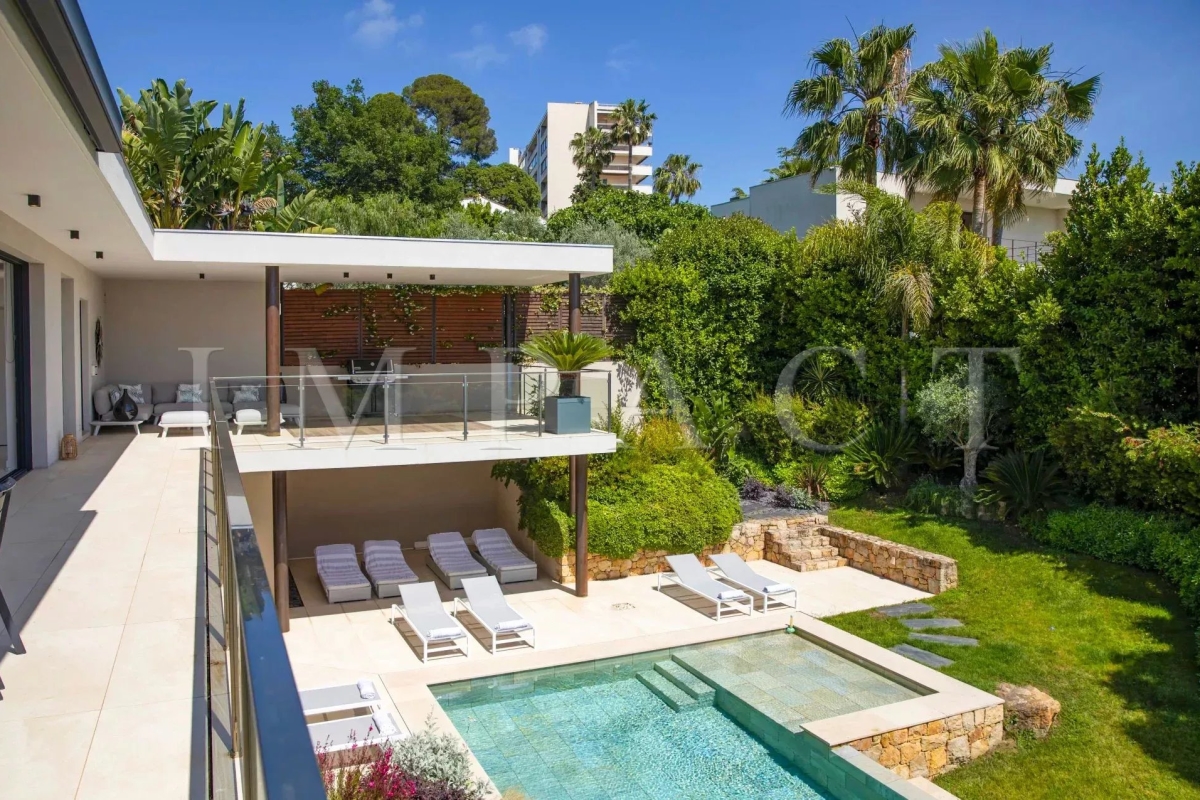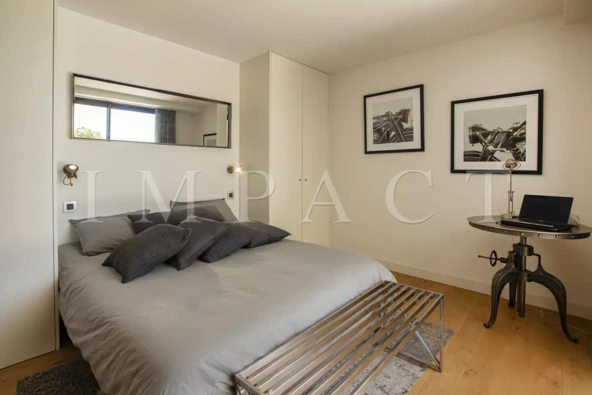 Seasonal rental - Luxurious 240m² contemporary villa with partial sea view. Description : Main level: Spacious entrance hall leading to a modern living and dining room, offering sea and pool views. Guest toilet with checkroom. Bright living room with bay windows opening onto a terrace with sea views, equipped with a large corner sofa (6 seats) and TV. Dining room with large table seating 8. Fully-equipped open kitchen: American fridge, oven, microwave, Nespresso coffee machine, dishwasher, induction hob and central island. Terrace with sea view. Dining table for 8. Barbecue area with corner sofa and 3 armchairs, seating up to 10. Garden level: Bedroom 1: double bed (180 cm), direct access to garden and pool, large dressing room, private bathroom with walk-in shower, bath, double basin and toilet. Bedroom 2: double bed (140 cm), direct access to garden and pool, dressing room, shower room with walk-in shower and basin. Bedroom 3: double bed (160 cm), direct access to garden and pool, dressing room, en-suite bathroom (in hallway) with bath, washbasin and separate toilet. Bedroom 4: double bed (160 cm), direct access to garden and pool, dressing room, private shower room with walk-in shower, basin and toilet. Laundry room: equipped with sink, washing machine and dryer. Exterior: 1,500 m² landscaped garden. Heated swimming pool (10 x 4 m). 10 deckchairs for sunbathing. Facilities: Wifi, air conditioning, garage for 2 cars. Maximum number of guests: 8 Contact: +33628933780.