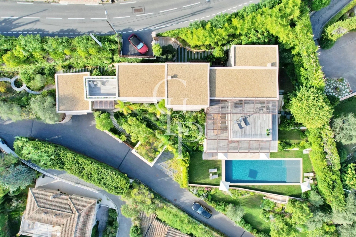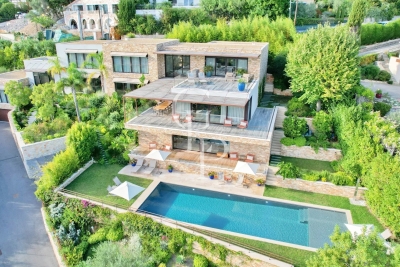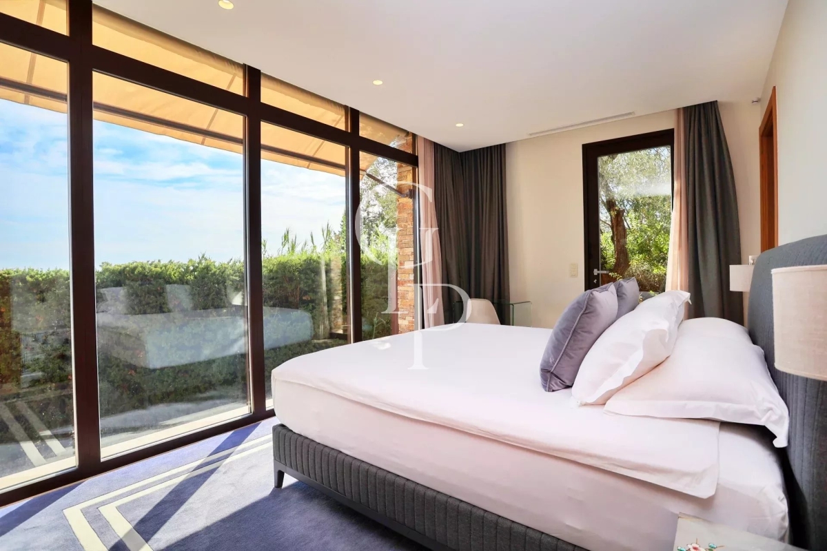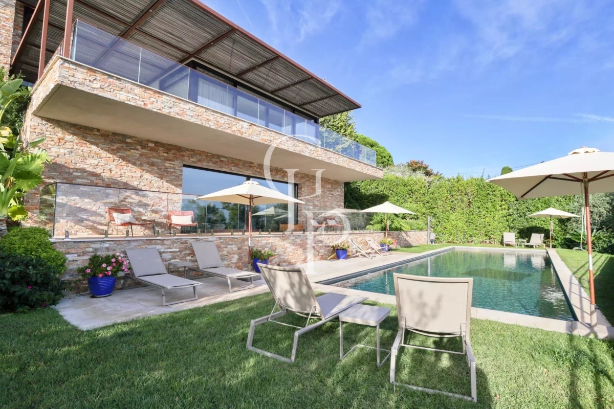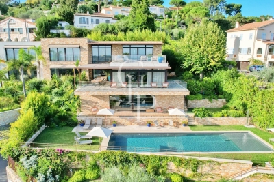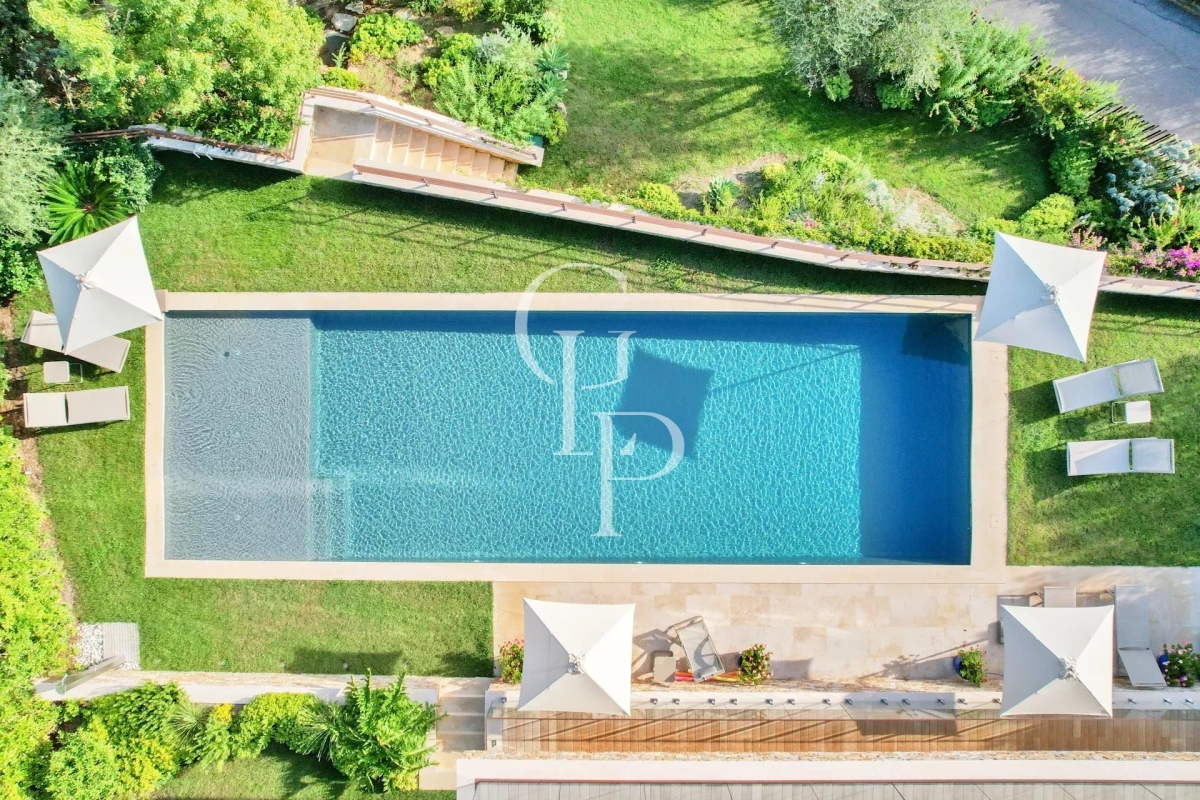 Magnificent 550 m2 villa set in 2000 m2 of land. It has beautiful terraces surrounding a swimming pool with sea views. It has 6 en suite bedrooms (including one for the staff) and 2 garages. Ground floor Living room with sea view Dining room Kitchen Bedroom 1: Double bedroom (140 cm) with en-suite shower room and toilet. No sea view. Guest toilet Upper floor Bedroom 2: Master bedroom (180 cm) with en-suite shower room and bath, double sink and toilet. Lounge area, terrace and sea view. Bedroom 3: Double bedroom (180 cm) with en-suite shower room, toilet and bidet. Sea view. Bedroom 4: Double bedroom (160 cm) with en-suite shower room, toilet and bidet. Sea view. Terrace. Lower floor Bedroom 5: Double bedroom (160 cm) with en-suite shower room, toilet and bidet. Sea view. Bedroom 6: Twin bedroom (80 x 2 cm) with en-suite shower room, kitchenette. Equipped pool house TV lounge Sauna Additional services: Heated saltwater pool (€300 per week), bullet-proof windows (no electric shutters), within walking distance of the village of Mougins. Contact: +33647030154.