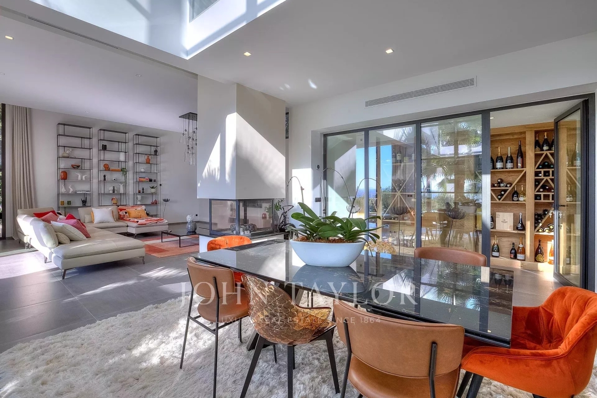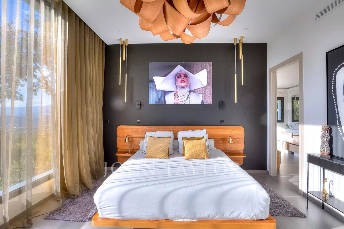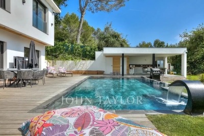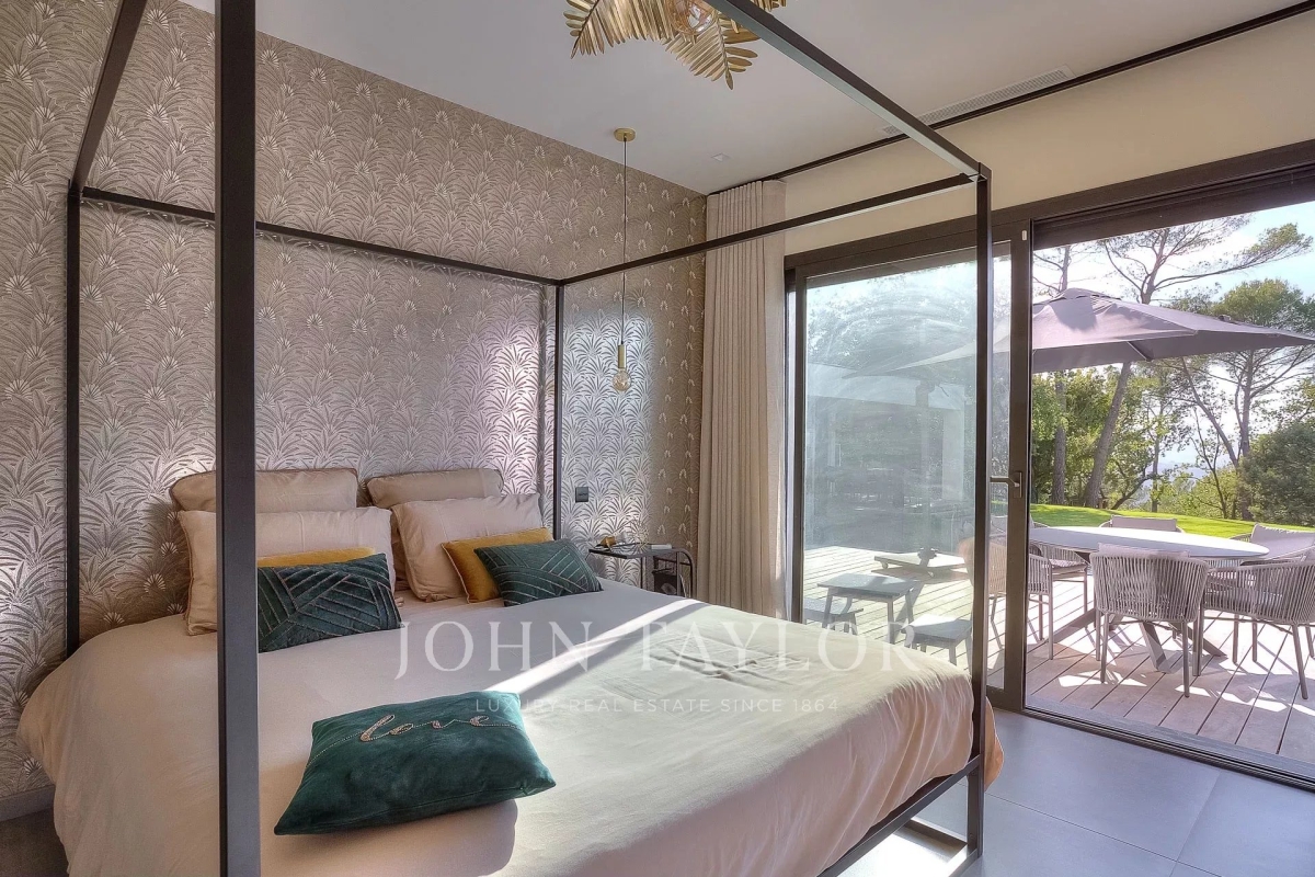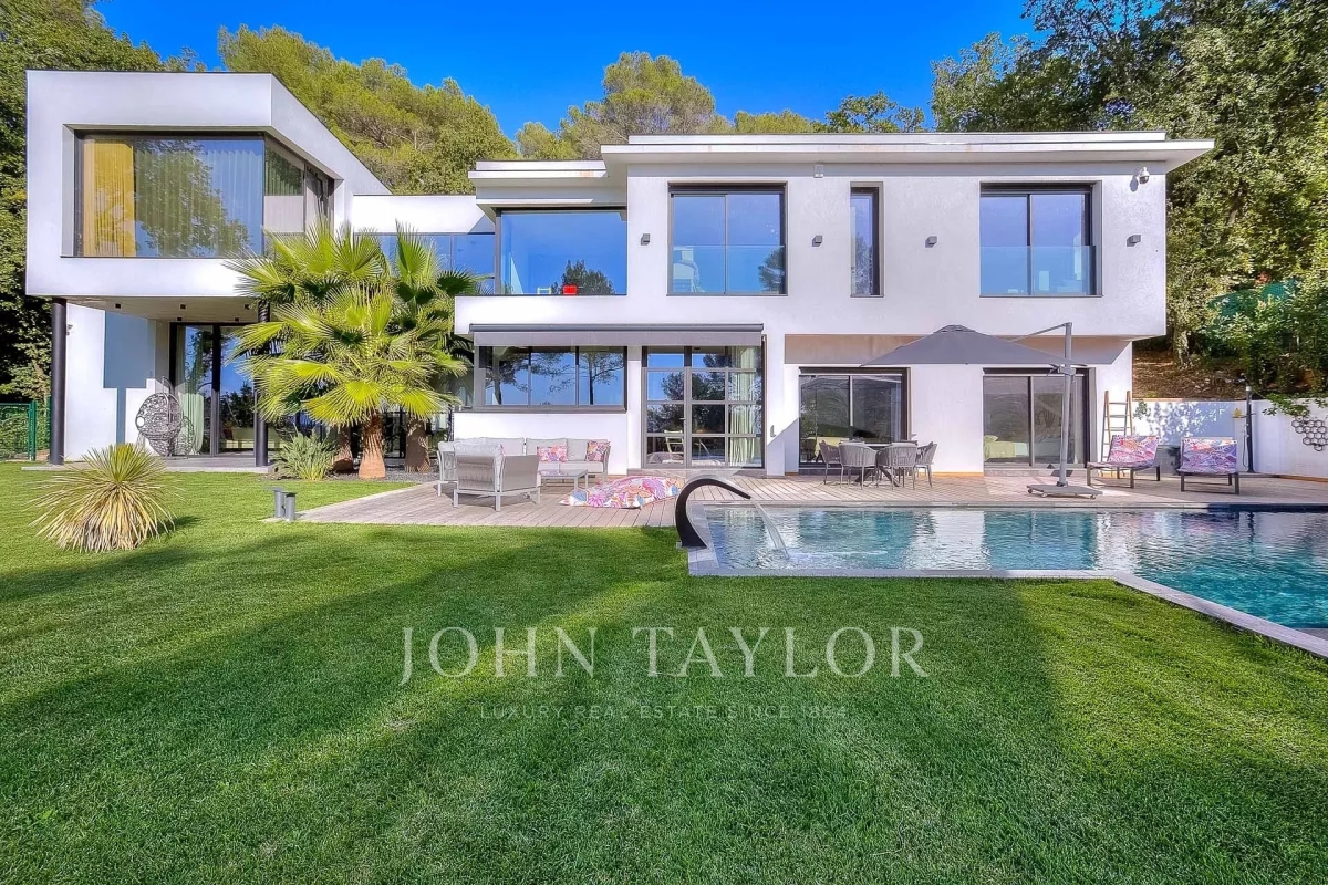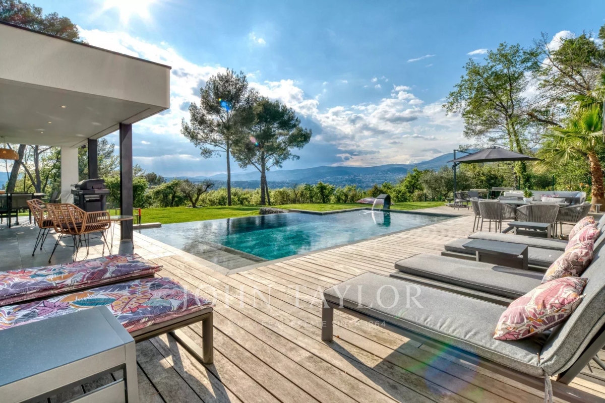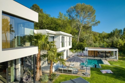 This exceptional 430 m² contemporary villa, ideally located near the sought-after villages of Mougins and Valbonne, offers an abundance of natural light through expansive bay windows and enjoys breathtaking panoramic views of the surrounding landscape. Designed to accommodate up to 10 guests in comfort and style, the villa features 5 well-appointed bedrooms and 4 modern bath-/shower rooms. Ground floor: Elegant entrance hall with built-in storage Master suite (Bedroom 1) with king-size bed (180x190), private bathroom (double vanity, bathtub, walk-in shower, separate WC), dressing room, and desk Bedroom 2: king-size or twin beds (180x190 or 2x90x190), en-suite shower room (shower, vanity, WC), and dressing room Bedroom 3: king-size bed (180x190), en-suite shower room (shower, vanity, WC), and dressing room Fully equipped fitness room Garage Garden level: Guest WC Spacious living room opening directly onto the pool area Bright dining room adjoining the lounge Fully equipped modern kitchen Bedrooms 4 & 5: each with king-size beds (180x190), sharing a shower room (shower, vanity, WC) Functional laundry room Outdoor amenities: Landscaped garden 4 private parking spaces Heated infinity pool (10x5 meters) Pool house with summer kitchen, barbecue, outdoor shower Jacuzzi for 6 people This villa is the perfect blend of contemporary design, comfort, and Mediterranean lifestyle — ideal for family holidays or a peaceful retreat in the South of France. Information on the risks to which this property is exposed is available on the Géorisques website: www.georisques.gouv.fr Contact: 0609238497.