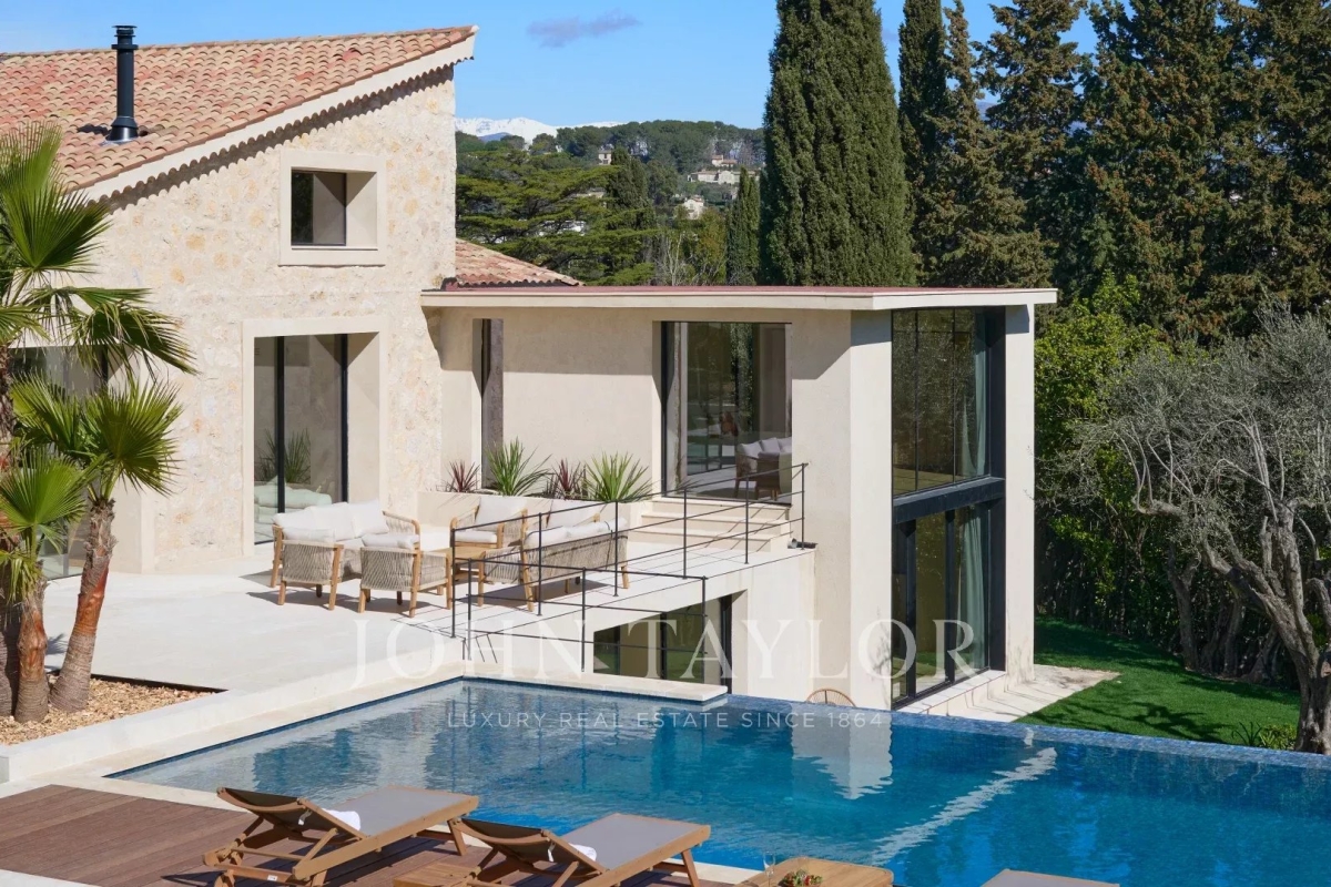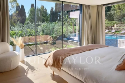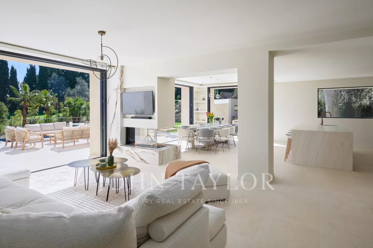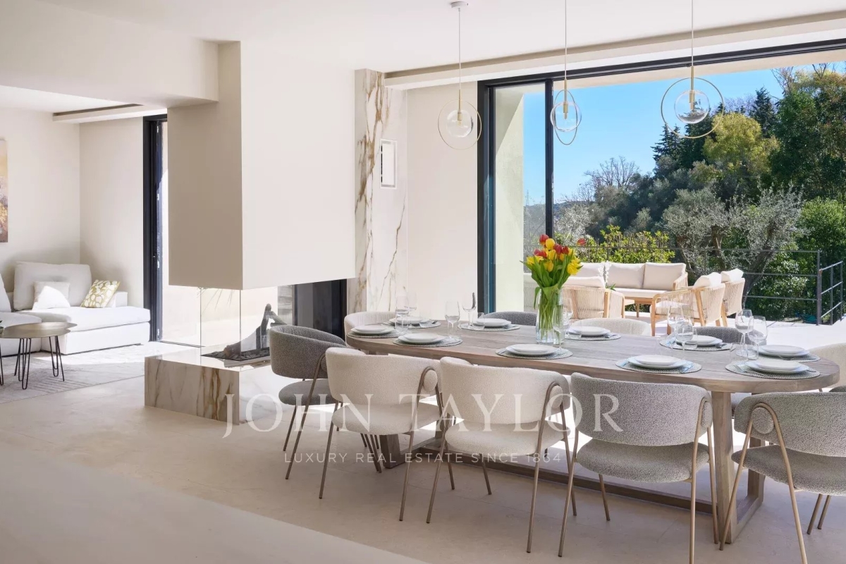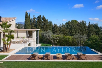 This beautiful contemporary villa with 350 m² of living space and top-of-the-range amenities would be ideal for a family looking to spend a wonderful vacation on the Côte d'Azur. It is located on foot from the old village of Mougins, close to all amenities. It includes : First floor: - Spacious entrance hall, - Living room of approx. 100 m² with TV area, sound system and fireplace, access to terrace and pool-house with barbecue, - Fully equipped open-plan kitchen with central island and dining area, - Dining room, - Master bedroom: double bed, bathroom, dressing room, terrace. - Bedroom n°2: double bed, shower room, dressing room. 1st floor: - Bedroom n°3 : double bed, bathroom, dressing room. Garden level: - Bedrooms n°4 and n°5: double beds with ensuite shower rooms, - Cinema room, - Fitness room and sauna, - Laundry room and garage. Exterior amenities: - Landscaped garden ; - Infinity pool; - Several relaxation areas with deckchairs and garden furniture; - Parking area. Information on the risks to which this property is exposed is available on the Géorisques website: www.georisques.gouv.fr Contact: 0609238497.