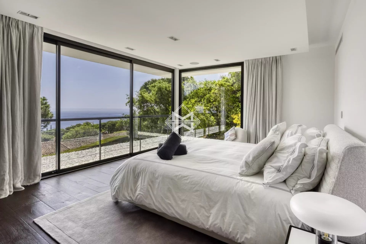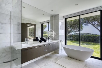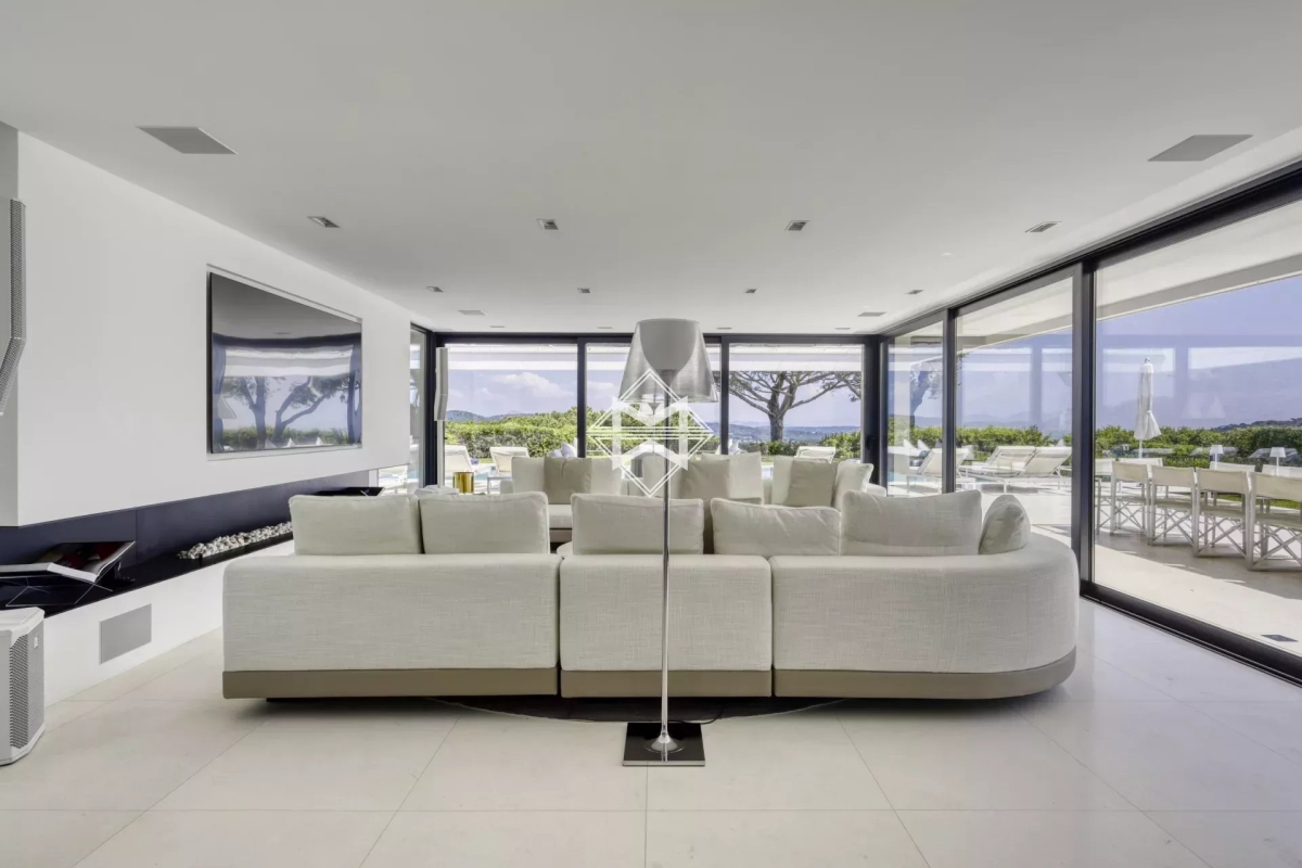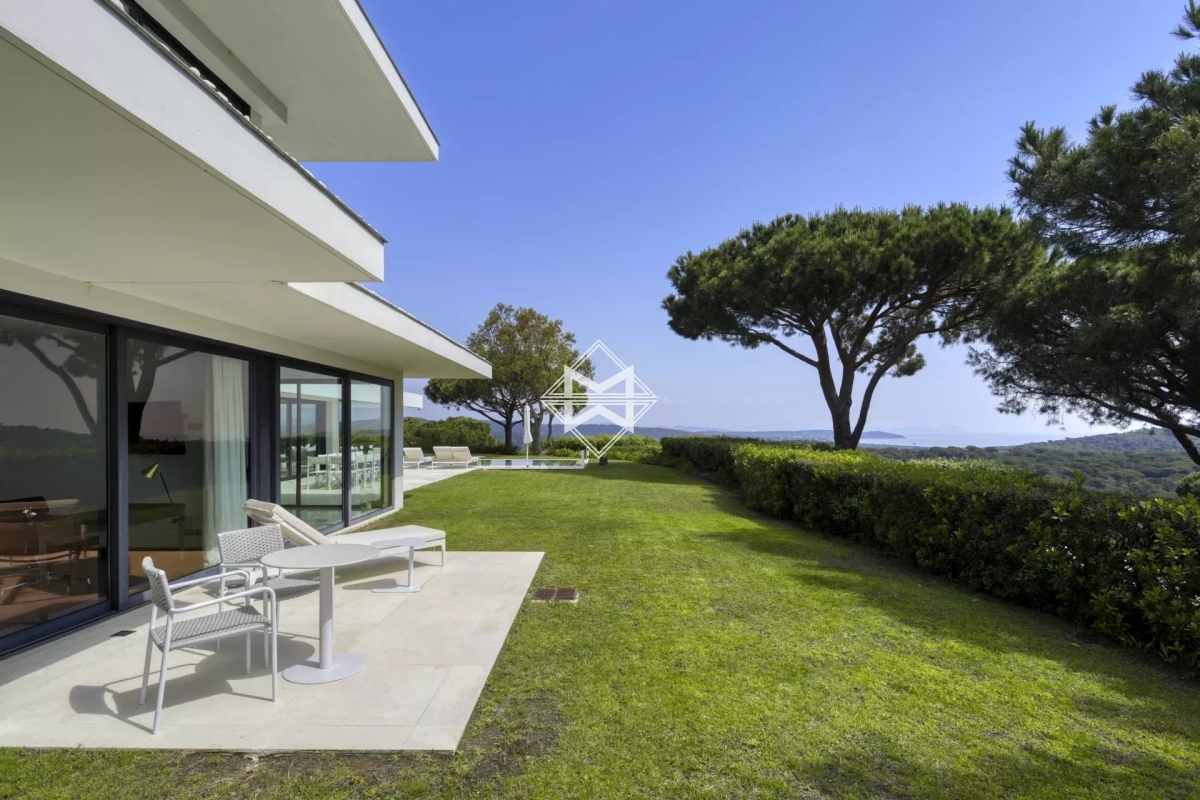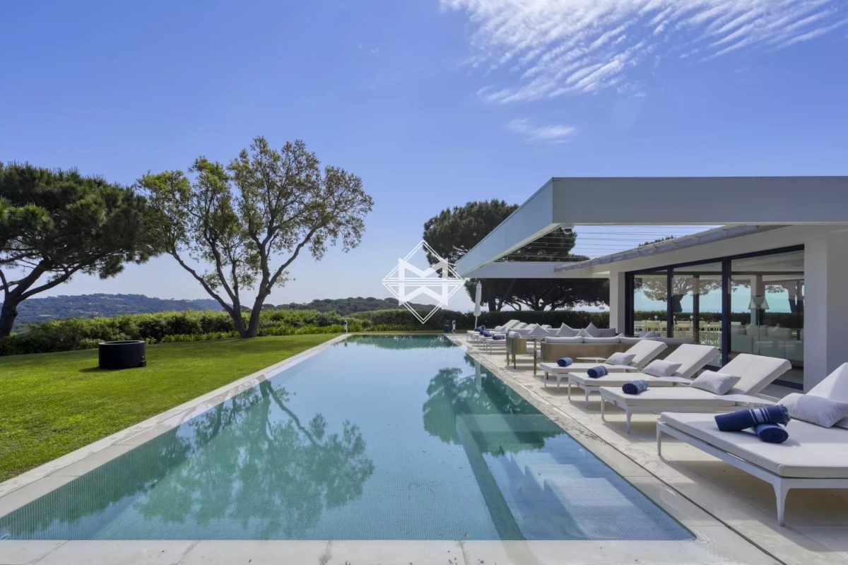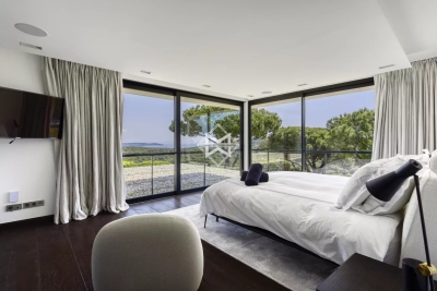 Contemporary villa, enjoying exceptional panoramic sea views and surrounded by wonderful nature, is nestled in a popular and greenery area of Escalet in Ramatuelle. The property is not far from the Escalet beach, within only 3 minutes, and the Pampelonne beach, in only 10 minutes, enjoying the proximity of the center of Saint-Tropez (only 18 minutes). The modern style villa, built from high end materials, has a large surface of approx. 500 m², including 8 beautiful suites. The splendid bay windows are visually extending the interior spaces, allowing to take full advantage of the superb sea view offered by the dominant position of the villa. Surrounded by a ground of approx. 5800 m², the property has a heated pool of 20 meters long and an outdoor bar. Bocce ball (petanque) court, home automation, security system, reversible air conditioning, bioethanol fireplace ... This contemporary property in the region of Saint-Tropez will seduce nature and sea lovers.