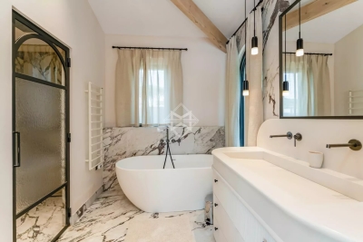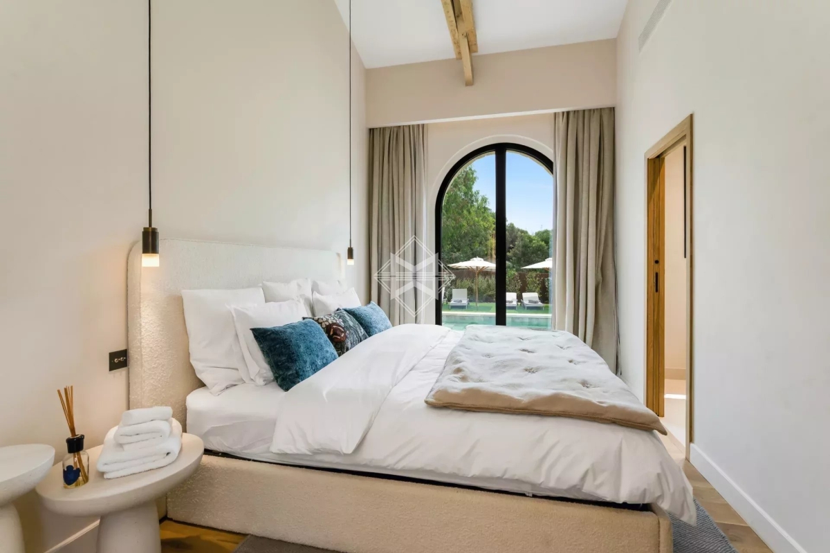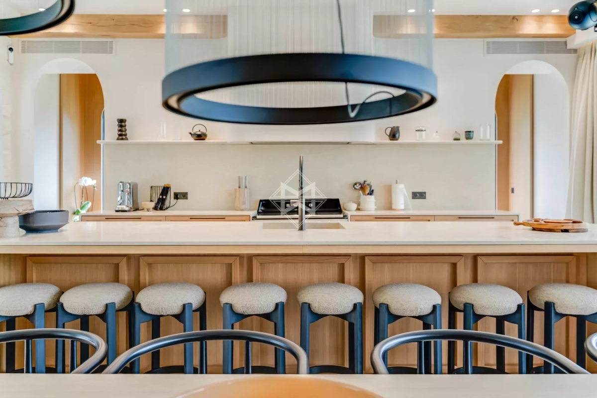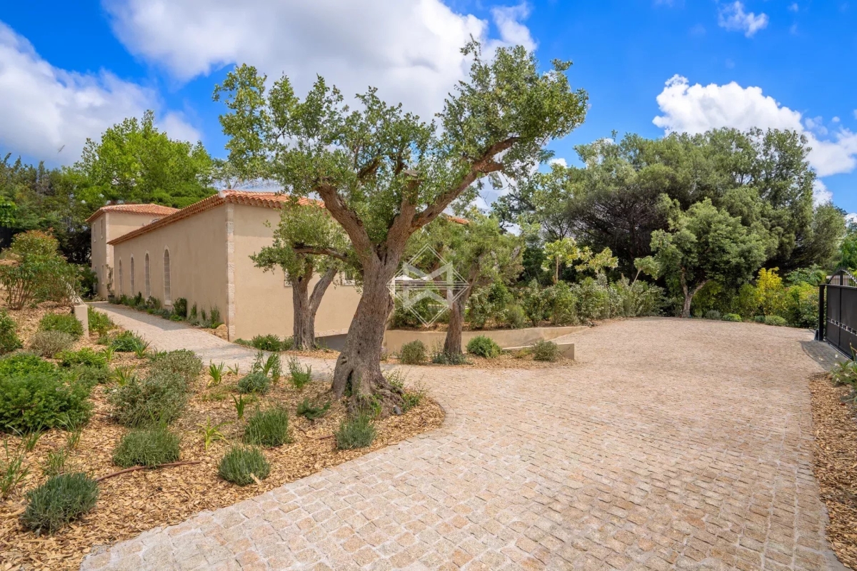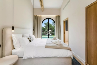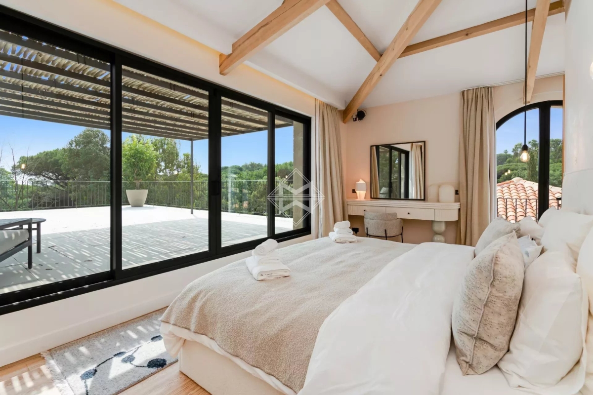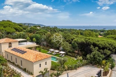 In a peaceful setting, and just a few minutes' walk from Club 55 and Pampelonne Beaches, discover this splendid brand-new residence of approximately 380 sq m, nestled on a landscaped plot of approximately 1202 sq m perfectly maintained . Upon entering, you will be charmed by the spacious living area, ideal for relaxing and entertaining with friends and family. The open kitchen leading to the dining area offers breathtaking views of the garden and the pool, creating an idyllic setting for meals with loved ones. With 4 suites on the main level, each guest can enjoy their private space and the tranquility of the surroundings. The Master bedroom upstairs boasts a spacious terrace even providing a glimpse of the sea, while another suite on the lower level adds an extra touch of comfort and privacy. To complete this exclusive living environment, the villa also boasts a fully-equipped gym with numerous pieces of fitness equipment, ideal for lovers of well-being and physical activity, as well as a cocooning TV room, designed as a genuine relaxation area, to enjoy your films or series in a warm, cosy This magnificent villa with 6 suites in total harmoniously combines luxury, elegance, and comfort for an exceptional living experience.