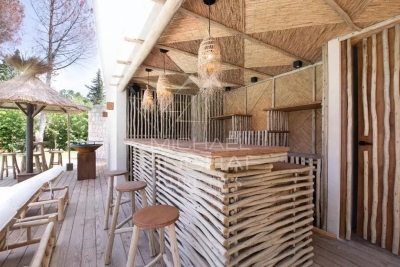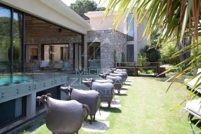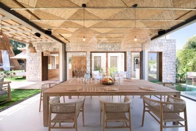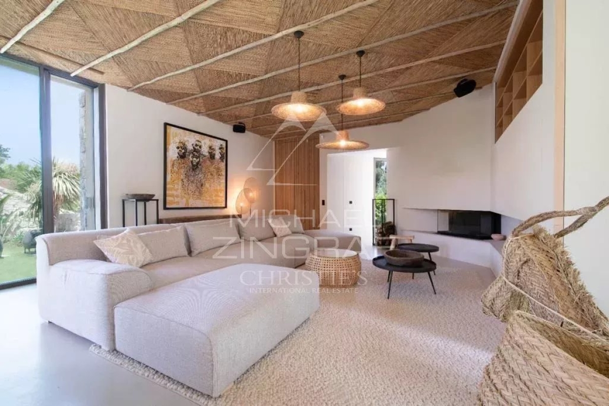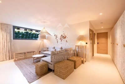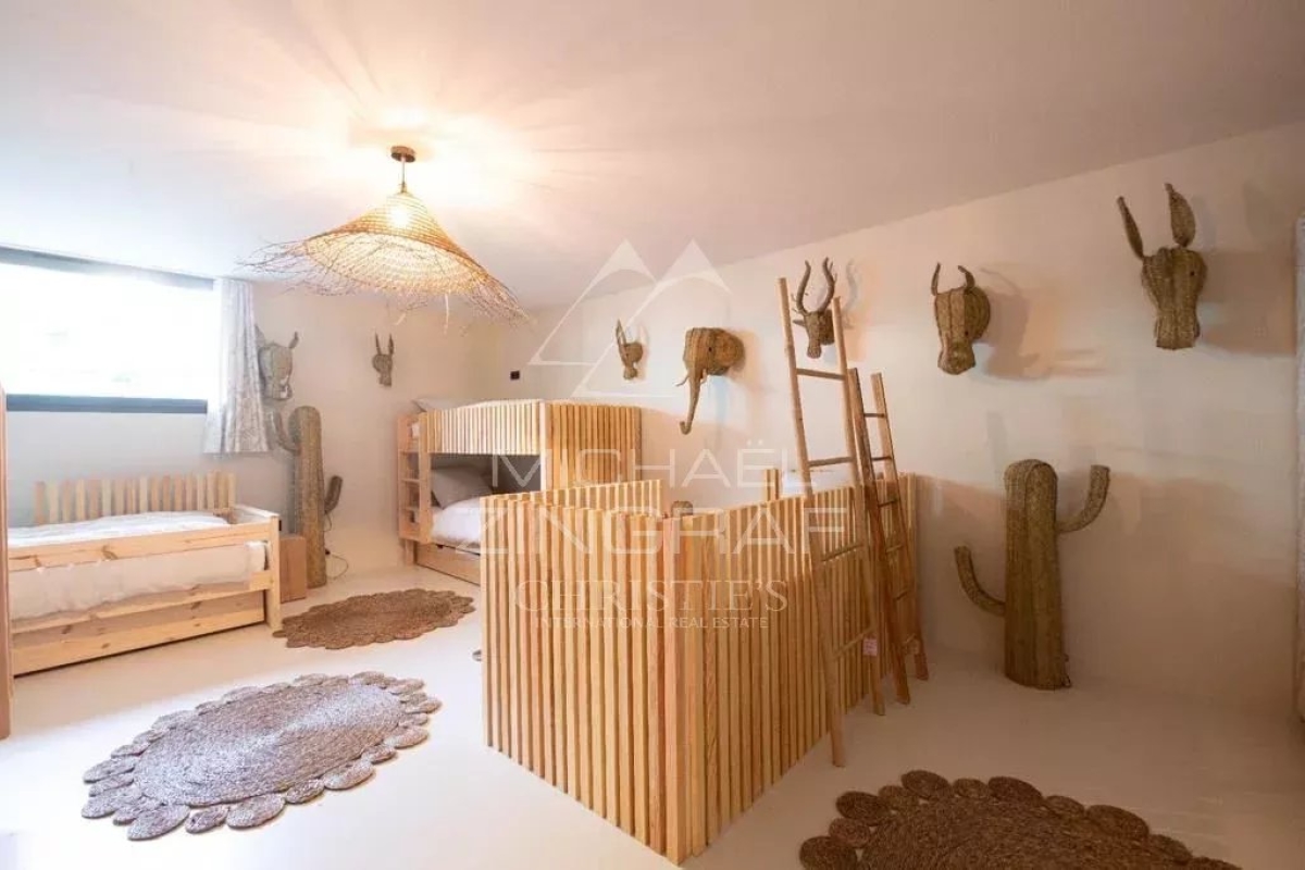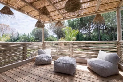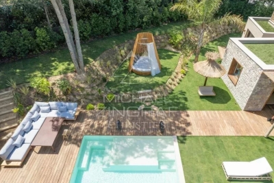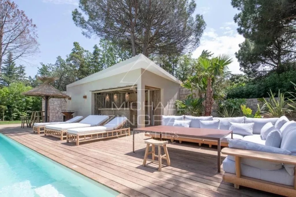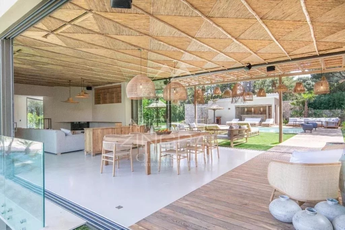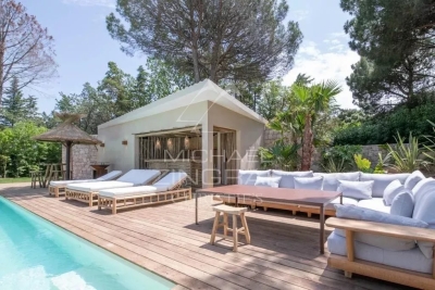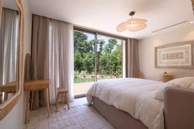Superb property nestled in the heart of parasol pines on a land of about 2000m2, ideally located a few minutes from the center of Saint-Tropez and the beaches of Pampelonne. It is composed of a large and bright living room open to the outside, a fully equipped kitchen, 6 bedrooms en suite and a children's room, a massage room, a game room and a discotheque. Facilities: Air conditioning, linens, daily cleaning, electric gate, sheltered parking spaces, swimming pool with Jacuzzi and pool house.