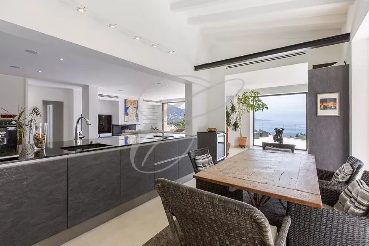 Hameau of Roquebrune, quiet residential area, villa with beautiful terrace and heated swimming pool with panoramic sea and mountain view. The villa is composed of a living room, dining room, fully equipped american kitchen, a master bedroom with dressing and bathroom, two other bedrooms with dressing and shower room. A laundry. An independent bedroom with its bathroom. Large terrace with summer kitchen and barbecue. Covered parking for two cars and a garage. Possibility of seasonal retan for several months : price on request Contact: +33609975123.