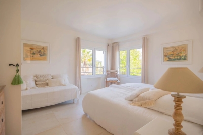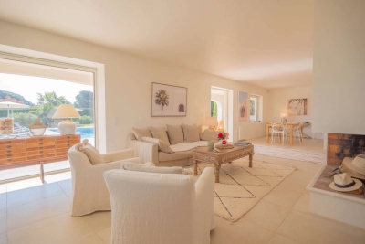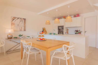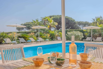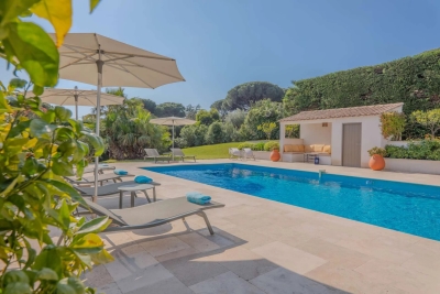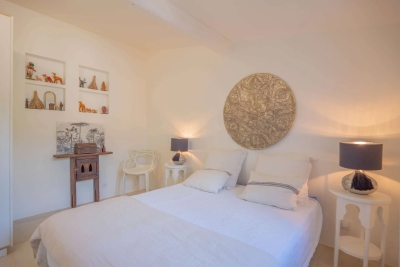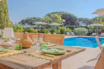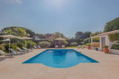 Sainte Maxime: This magnificent renovated villa, located in a very popular area of the city; offers serenity and a haven of peace for an unforgettable holiday. It consists of a large living room overlooking the garden and pool, decorated in soothing colors and its fireplace to enjoy a moment of relaxation. A beautiful dining table, fully equipped open kitchen and bar corner. An adjoining laundry room (refrigerator, washing machine) On the ground floor: a first double room ((160x190cm) and its soft decoration. A second double room (160x190cm) and their connecting shower room, separate guest wc. A third double bedroom with two single beds (80x190), an extra bed and its shower room. Upstairs: a beautiful double room (160x190cm) with its nice private terrace and a very nice sea view and the pool. Outside: a beautiful swimming pool, its adjoining pool house that offers a perfect rest area for idleness. A bowling alley. Parking spaces. A very large garden, lush conducive to serenity. Check-in/out in high season (min 7 days): from Saturday to Saturday To be paid on the spot: security deposit and tourist tax Registration N°: 83115005545DP