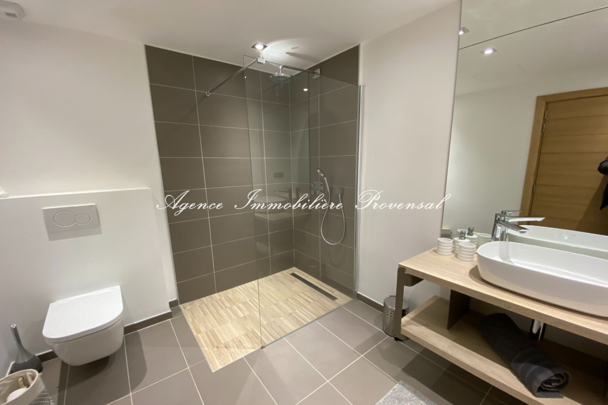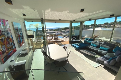 Superb modern terraced duplex house with a pool and sea view over the Gulf of Saint Tropez, available for rent for 8 people in a beautiful gated and secure estate of 13 villas in Sainte Maxime. Located close to the town center and the beach of Sainte-Maxime in the residential area of La Croisette, the main level features an entrance, a living room with an open-plan kitchen opening onto terraces with a lovely sea view over the village of Saint-Tropez, two bedrooms, and a shower room. Upstairs, there are two additional bedrooms each with en suite bathrooms. Beautiful terraces with loungers and a summer lounge facing the sea. The pool (6x3x1.45m) is protected by an alarm. You will also have a carport and a garage. The villa is fully air-conditioned and offers high-quality amenities. Linen is provided. Very nice secure estate equipped with surveillance cameras. Pets are not allowed. Furnished rental rating: 5***** Security deposit payable on arrival: €3000 Tourist tax is extra (amount varies depending on the rental period, price, and number of guests over 18 occupying the property). Low season price: €3,518/week. May price: €4,802/week. June price: €5,444/week. Price for the first two weeks of July: €6,727/week. Price for the last 3 weeks of July: €8,780/week. August price: €9,443/week. Price for the last week of August: €8,653. September price: €6,727/week. For information, availability, and booking periods, please contact us by email: Contact: +33(0)494960018.