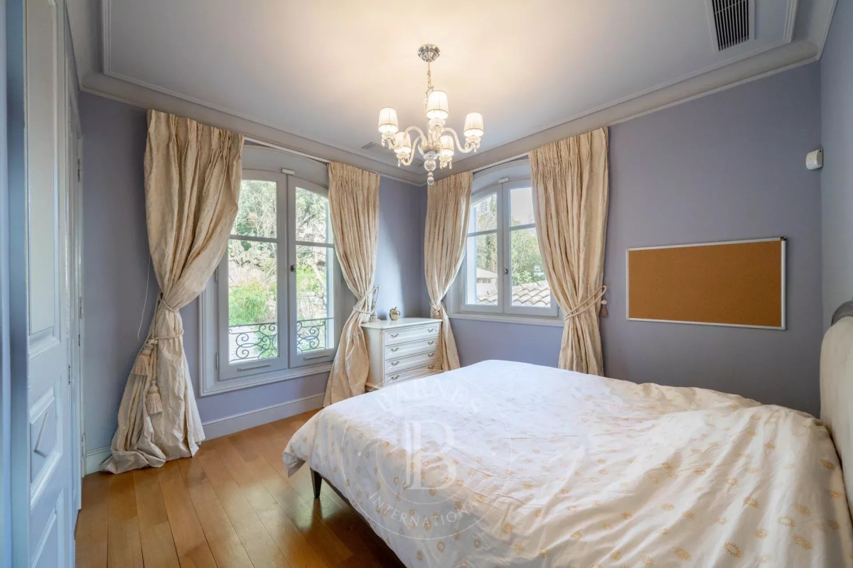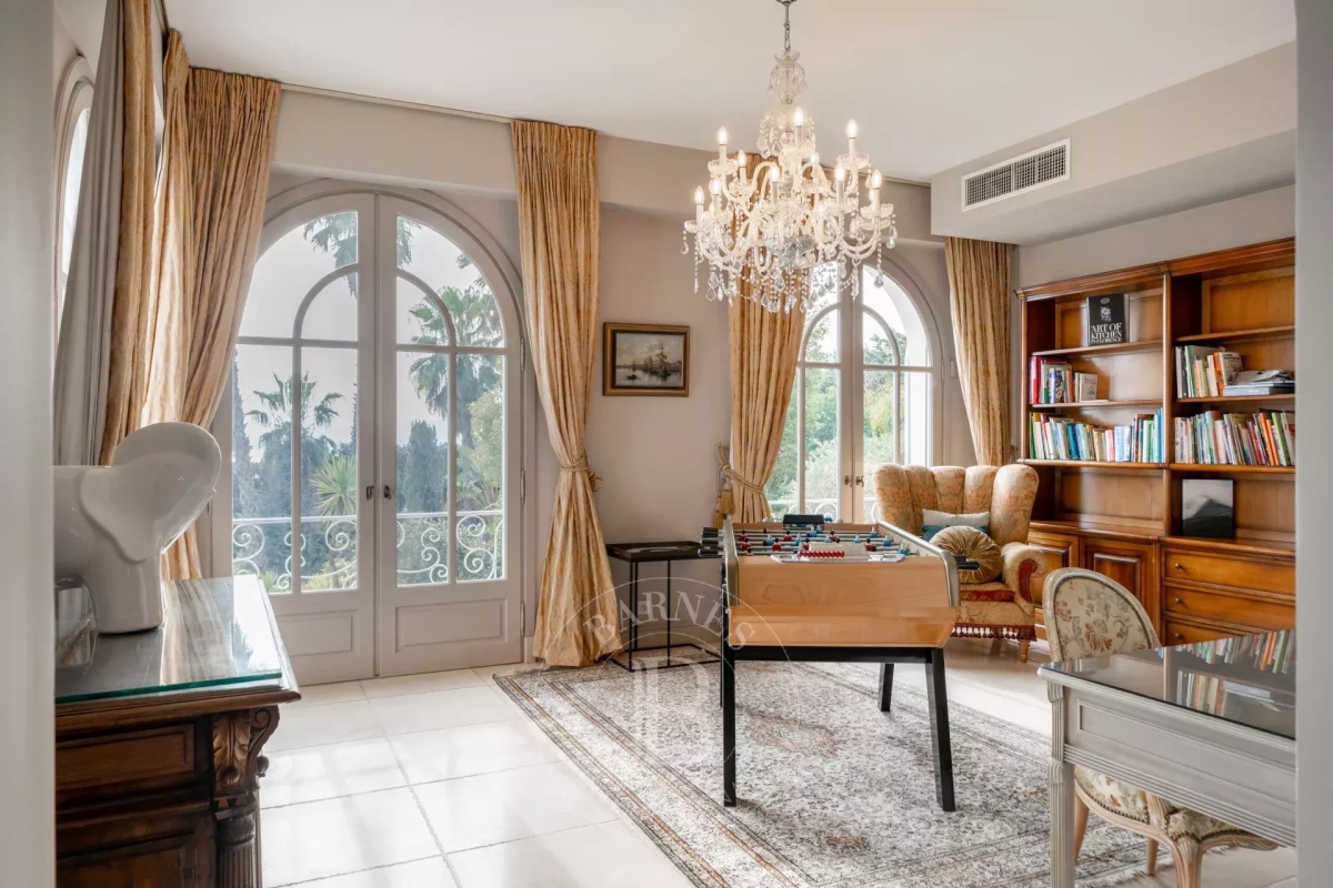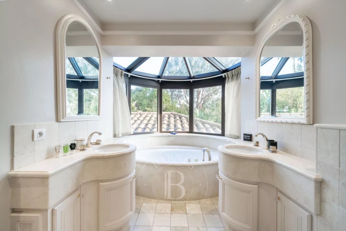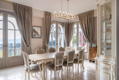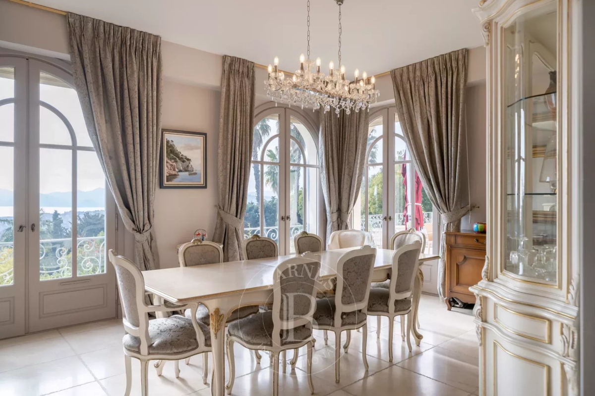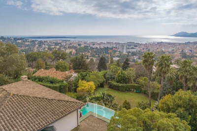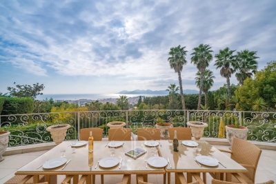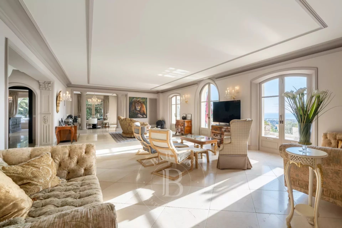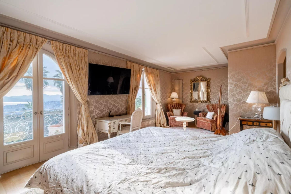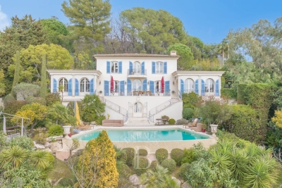 Située dans le prestigieux quartier de la Californie, cette villa néoprovençale offre une vue mer panoramique sur la baie de Cannes. Elle comprend un grand séjour avec salle à manger pour 8 invités, une cuisine américaine entièrement équipée, 4 chambres en suite, 2 chambres indépendantes, un studio annexe, un bureau, une salle de sport équipée ainsi qu'une salle de cinéma. Le jardin de plus de 4 000 m² est agrémenté d'une piscine au sel à débordement, 3 places de parking participe également à la constitution du bien.