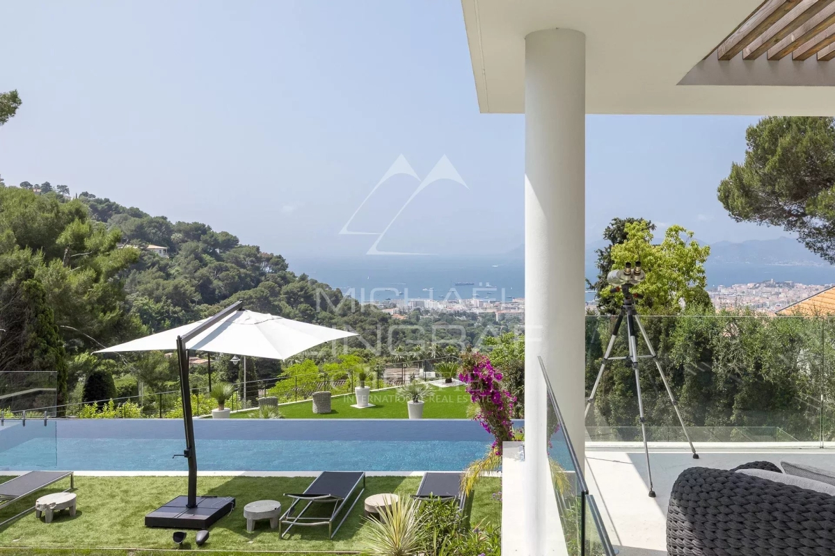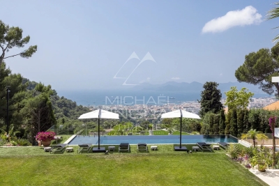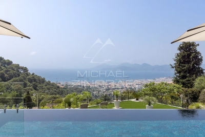 Rare. En plein cœur de la Californie, en position dominante surplombant la baie de Cannes et l'Estérel, propriété exceptionnelle de style contemporain entièrement et récemment rénovée par un architecte de renommé. Sur 660 m² environ, elle offre de beaux espaces de réception ouvrant sur de larges terrasses face à la mer, très beau jardin complanté, piscine. Appartement de gardien indépendant, salle de sport, sauna, hammam, cave à vin, 6 chambres en suite.