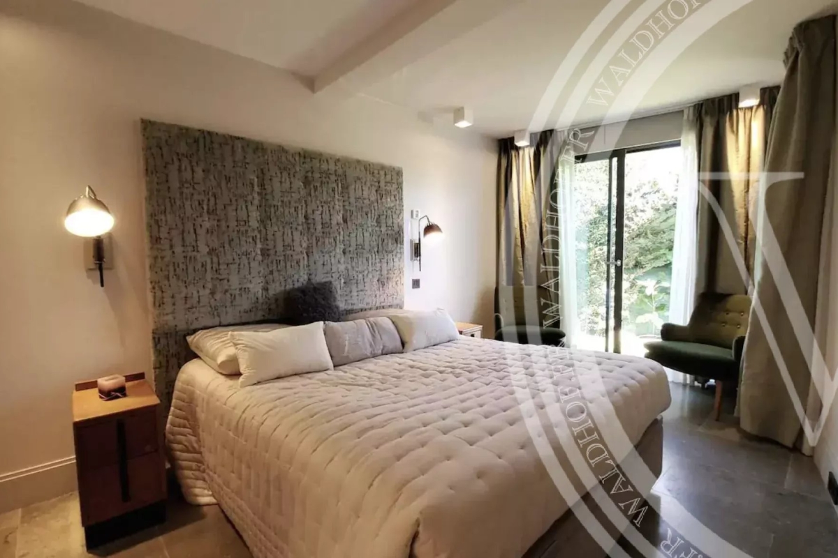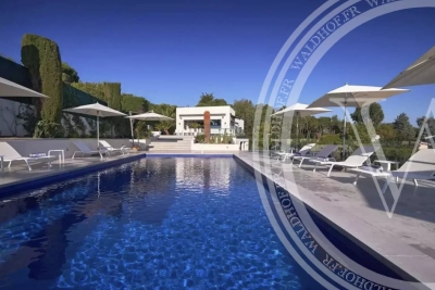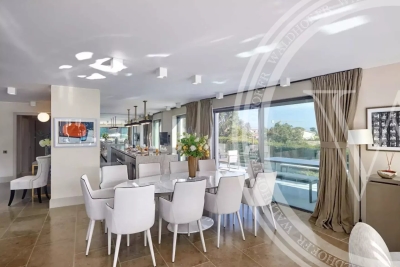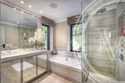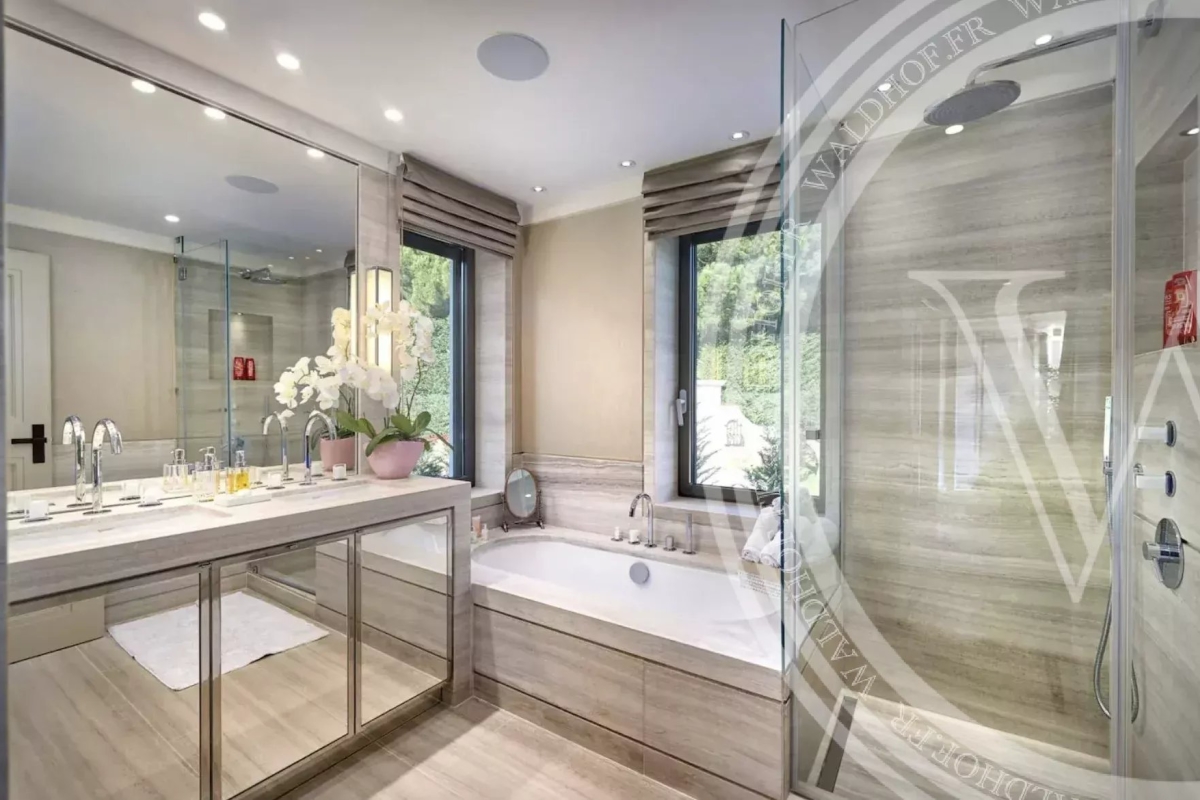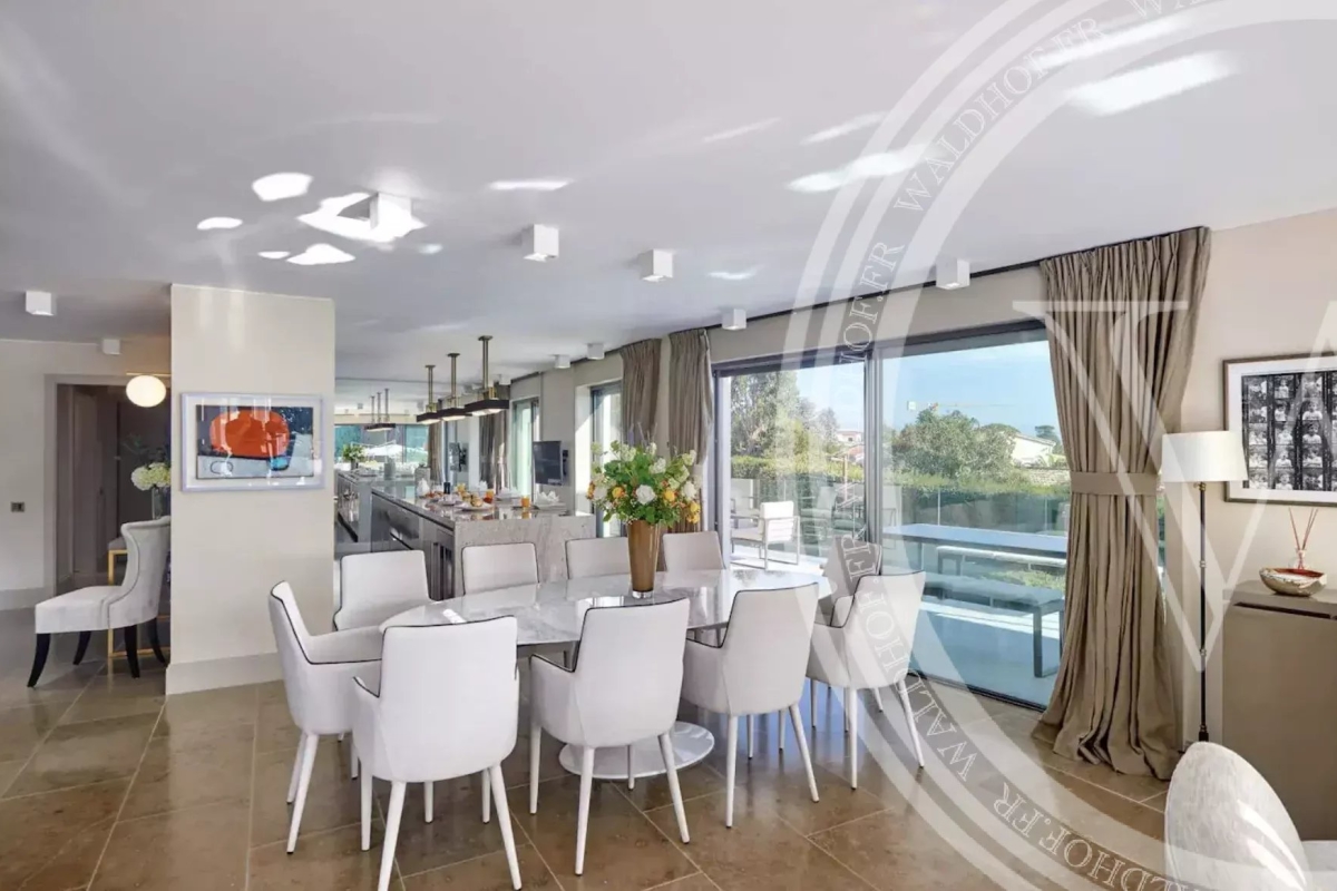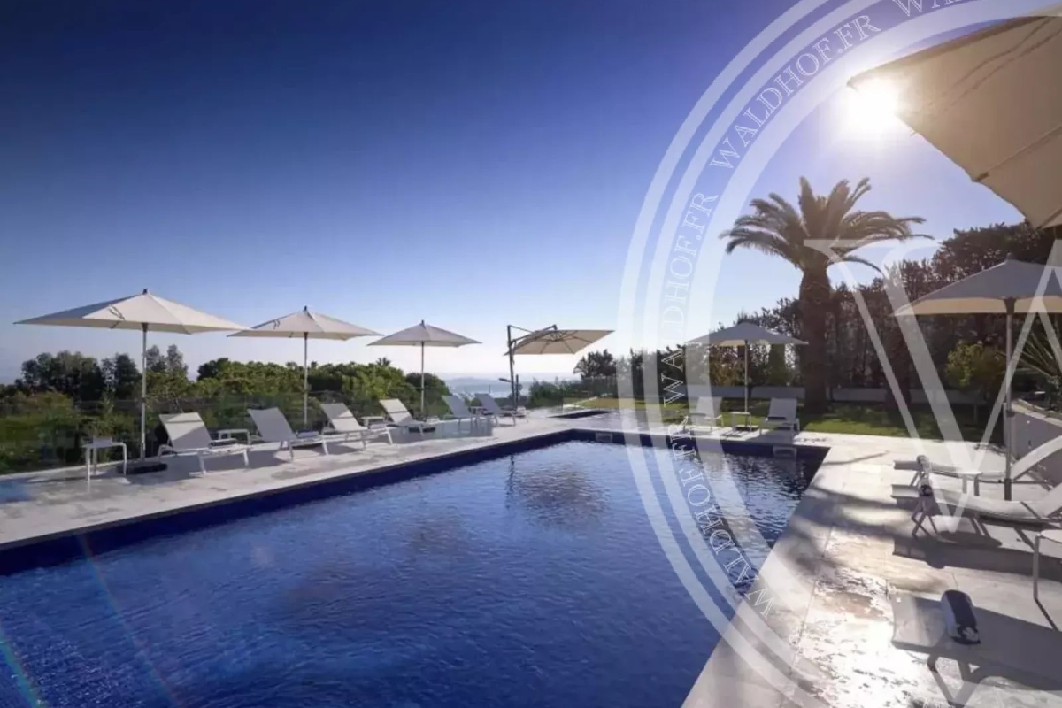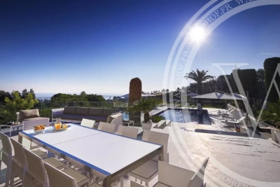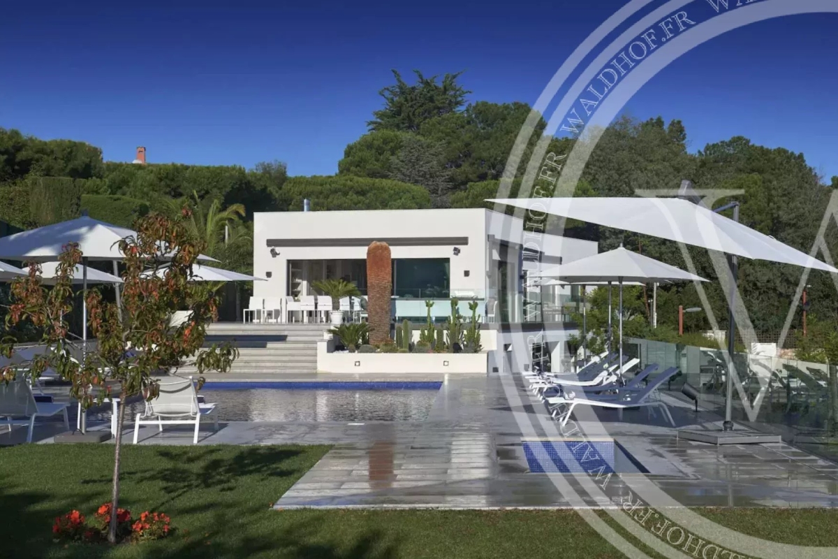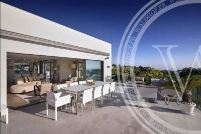 Cette villa, vue panoramique & mer, bénéficie d'une belle position dominante, dans le quartier résidentiel de Super Cannes, à 10 minutes du centre animé de Cannes, des plages de sable de La Croisette & 15 min du Palais des Festivals. Dans une propriété, sécurisée de 1,600 m2, la maison de 330m2, villa contemporaine, sur 2 niveaux, offre, dans aménagement moderne, un intérieur contemporain, 6 chambres en-suite, 1 chambre staff. au niveau d'entrée (RDC) : - 1 Suite parentale double équipée d'un lit King Size(180x200cm), salle de bain en-suite avec baignoire, douche de plein pied et double vasque, wc japonais séparé, rangements, et balcon, vue mer & montagnes. Une vaste double réception,, salon, salle à manger et une cuisine ouverte moderne tout équipée avec grand espace de convivialité, le tout ouvrant sur une terrasse donnant sur l'espace piscine et le jardin avec une vue panoramique & mer . Une salle d'eau invités avec wc complète le niveau. Au niveau inférieur (RDJ) : - 2 Suites Parentales doubles équipées de lits King Size (180x200cm), salle de bain en-suite avec baignoire ou douche, wc, dressings, coins bureau, Tv, ouvrant sur terrasse couverte et jardin, exposées à l'Est , vue jardin. - 3 Chambres doubles équipées de lits Queen Size (180x200cm), salle de bain en-suite avec douche, wc, rangements, ouvrant sur terrasse couverte et jardin , vue jardin. - 1 Chambre double dédiée au personnel équipée de Lits Twins gigognes (90x200cm), salle de bain en-suite avec douche,wc, rangements, vue jardin. Une buanderie avec lave linge & sèche linge, stockage froid (réfrigérateur & congélateur) & sec complètent le niveau, La maison offre une vue panoramique à 180° sur la baie de Juan les Pins, le Cap d'Antibes. Elle est également équipée de climatisation indépendante pour chaque pièce, de chauffage, de systèmes d'alarme intérieur / extérieur, de vidéo surveillance, de volets roulants, stores, portails et portes de garages automatiques... Enfin, la villa, tient à la disposition des hôtes 2 garages et 2 places de stationnement à l'intérieur. Contact: +33651318572.