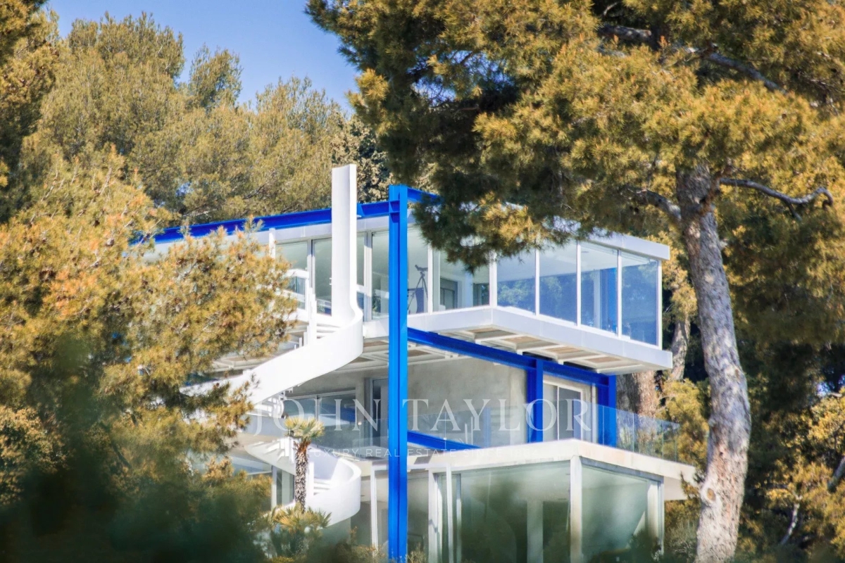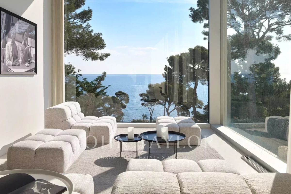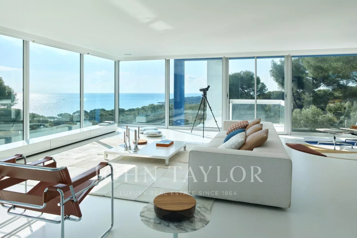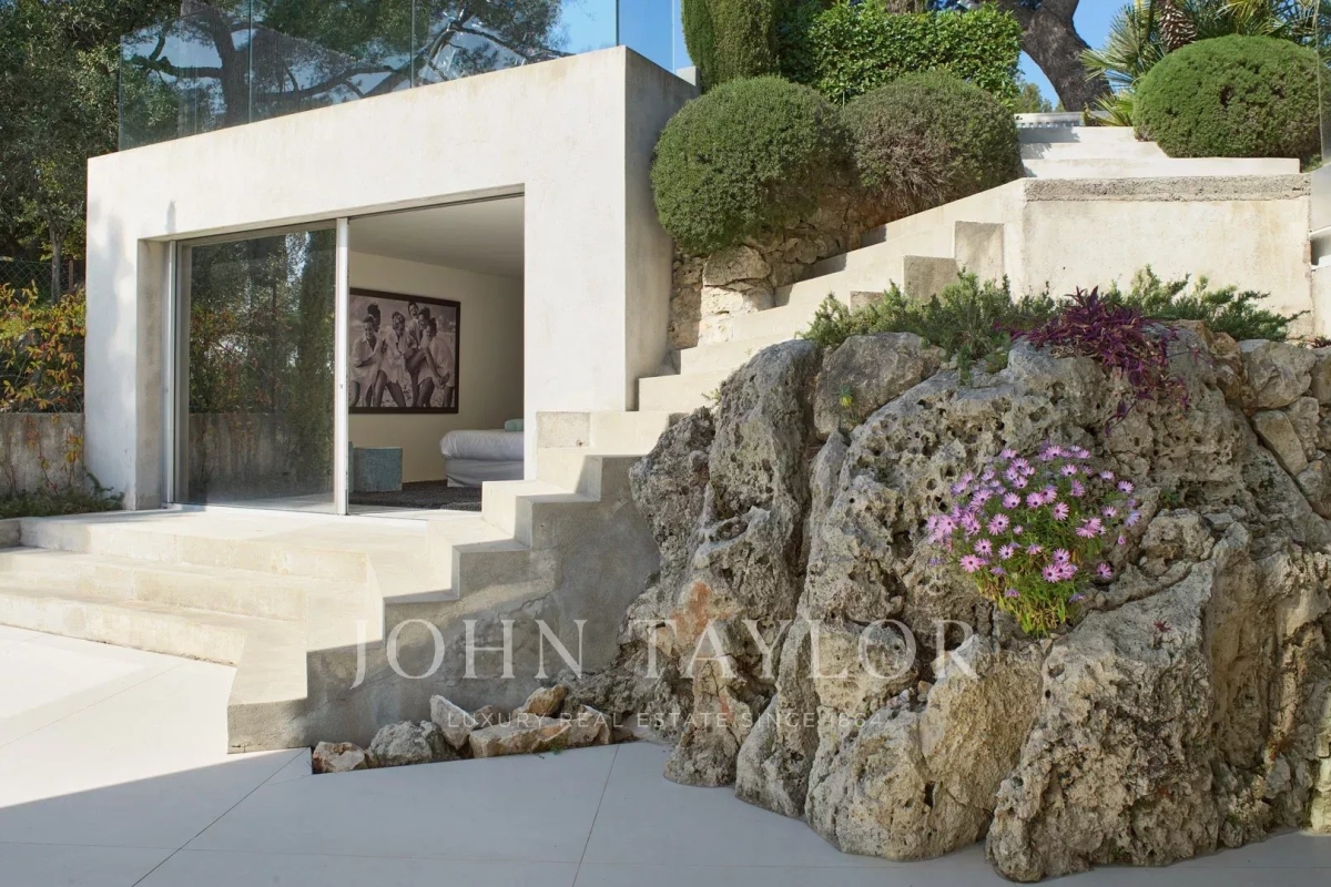 Dans l'un des quartiers les plus recherchés du Cap d'Antibes, à proximité du Phare de la Garoupe et à quelques minutes en voiture des Plages de la Salis et du Port de la Gallice, magnifique villa moderne construite en 1966 par le fameux architecte Claude Parent. Entièrement rénovée et climatisée, exposée Sud, elle offre de magnifiques vues panoramiques sur la baie du Cap d'Antibes et sur la ville. Au cœur d'un terrain de 1 000 m2, la villa de 300 m2 habitables avec ascenseur se compose comme suit : Avec un entrée indépendante : Chambre, lit double avec salle de douches/ WC Villa - Niveau entrée: Espace de réception bénéficiant de par ses larges baies vitrées d'une belle luminosité, comprenant salon, salle à manger et cuisine américaine et offrant des vues imprenables sur la mer et la ville Villa - Niveau intermédiaire: Deux chambres, chacune avec lit double et salle de douche ensuite / WC Grande terrasse équipée Villa - Niveau -1: Chambre de Maitre avec salle de bains + douche en suite – Toilettes séparés Cuisine/ bar entièrement équipé donnant sur salon/ terrasse. Toilettes invités Buanderie Piscine à débordement dans la roche Bains de soleil Equipement : système alarme, internet WI-FI, portail électrique