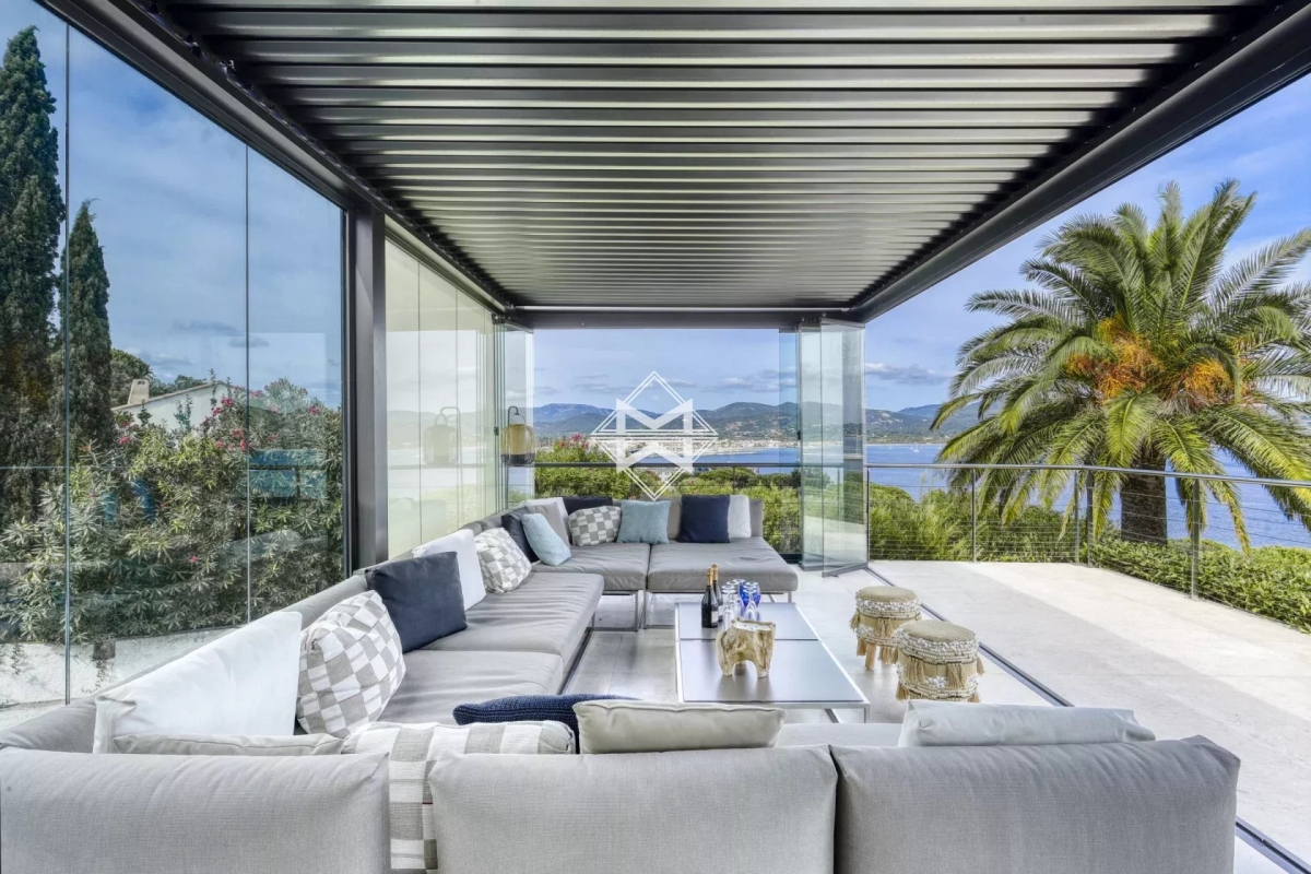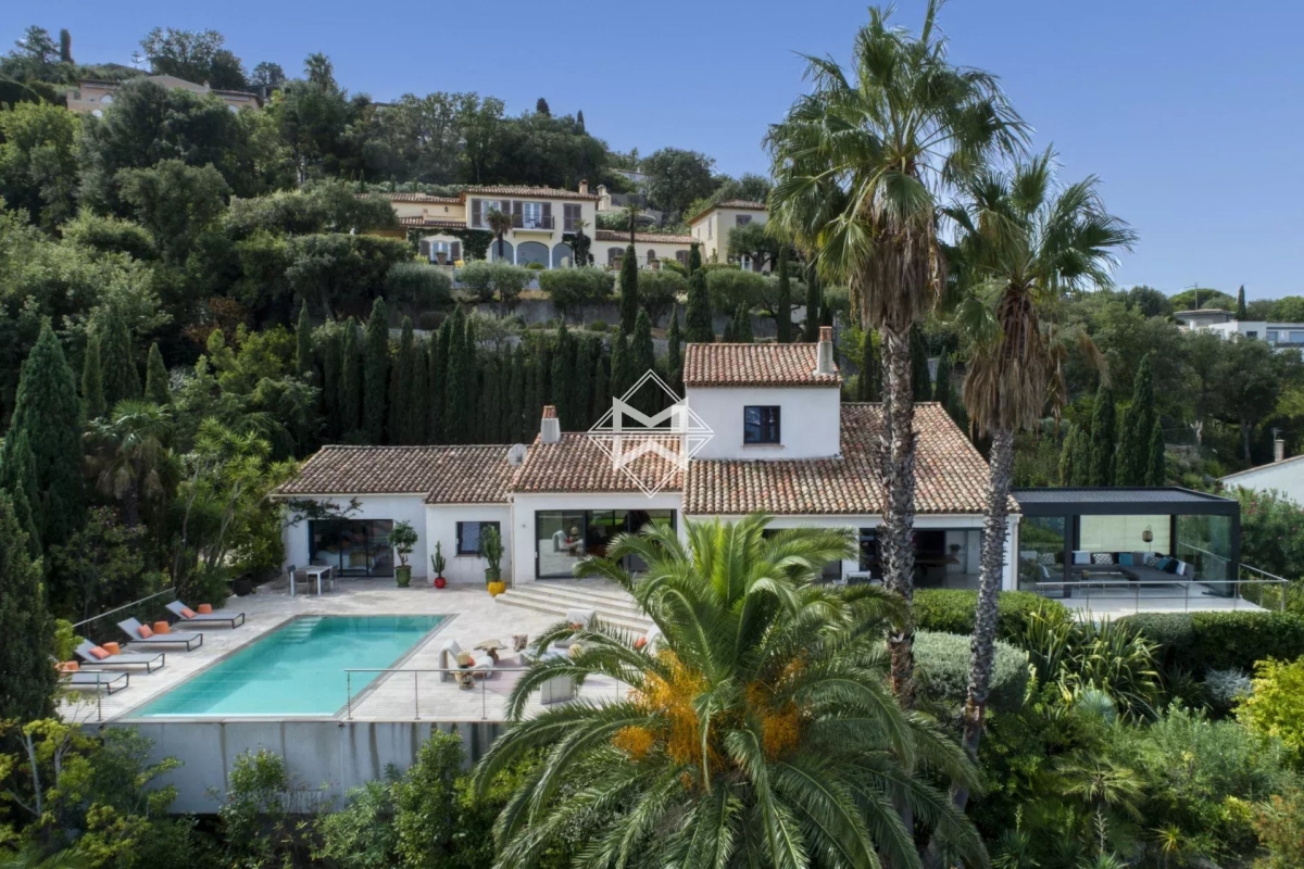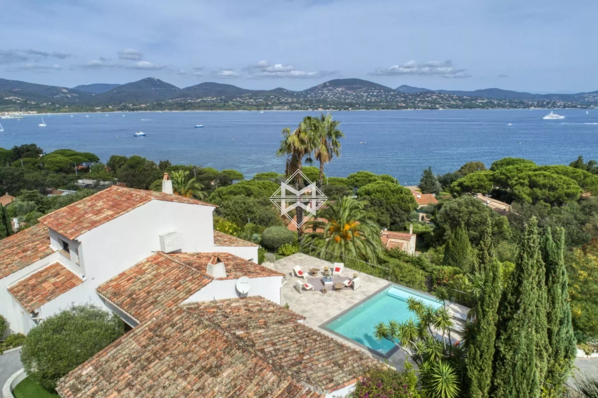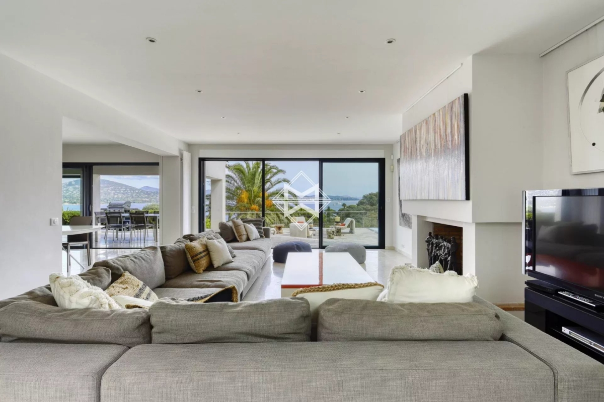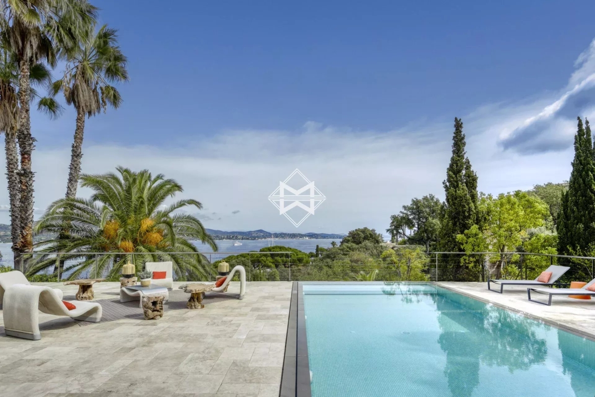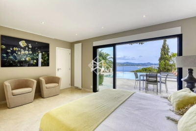 Dominant la baie, bénéficiant d'une exceptionnelle vue mer, villa d'architecture traditionnelle moderne d'environ 250 m2 édifiée sur un terrain paysager de 1880m2. La villa se compose d'un vaste salon, salle à manger et cuisine américaine ouvrant sur une terrasse couverte offrant un panorama exceptionnel sur la mer, 4 suites avec chacune leur salle de douches/bains. Piscine chauffée, climatisation, barbecue, système d'alarme. Numero d'agrément : 83065 000214SW