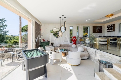 Location saisonnière - Villa de charme vue mer Découvrez cette somptueuse villa de 360 m² habitable, nichée sur les hauteurs de Mandelieu-la-Napoule, offrant une vue imprenable sur la mer. Un intérieur spacieux et élégant Rez-de-chaussée : Un espace de vie raffiné Entrée élégante avec bibliothèque. Salon cosy équipé d'un canapé, d'une TV et d'une cheminée. Toilettes invitées. Grande pièce de vie avec vue mer, comprenant : Un salon spacieux (canapé 6 places, 4 fauteuils, baby-foot). Une salle à manger avec une grande table pour 12 personnes. Une cuisine ouverte entièrement équipée : four, micro-ondes, cave à vin, plaque à induction, frigo, lave-vaisselle, machine à café Nespresso, bouilloire et grille-pain. Accès direct à la piscine et aux espaces extérieurs. Chambre 1 (vue mer) : Lit 140 cm, dressing, salle de bain avec douche et vasque. Master Suite (vue mer, accès piscine) : Lit 160 cm, dressing, salle de bain avec baignoire, douche, double vasque, toilettes séparées. Niveau inférieur (-1) : Espace nuit & commodités Cuisine équipée indépendante. Buanderie avec lave-linge, sèche-linge, congélateur et rangements. Toilettes séparées. Chambre 3 : Deux lits simples (90 cm), rangement. Chambre 4 : Quatre lits simples dont un superposé, armoire. Salle de bain commune (chambres 3 & 4) avec baignoire et vasque. Toilettes séparées. Chambre 5 (vue mer) : Lit 160 cm, TV, armoire, salle de douche attenante avec douche et vasque + toilettes. Chambre 6 (vue mer) : Lit 160 cm, TV, armoire, salle de douche privative avec lavabo. Chambre 7 (vue mer) : Lit 160 cm, TV, armoire, salle de douche avec toilettes et lavabo. Piscine de 8x4 m avec vue mer. Jacuzzi pour des moments de détente absolue. Terrain de 2 200 m² avec espace détente. Terrain de pétanque, idéal pour des moments conviviaux. Cette villa d'exception, idéale pour des vacances en famille ou entre amis, vous offre un cadre luxueux et apaisant, alliant modernité et confort. Autres équipements : WIFI, Climatisation Equipée pour 14 personnes. Contact: +33628933780.