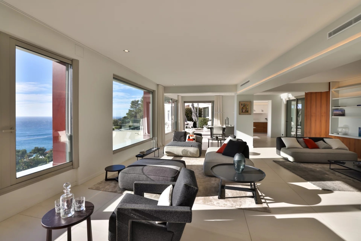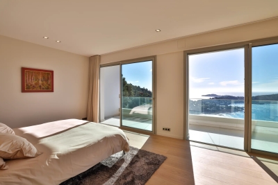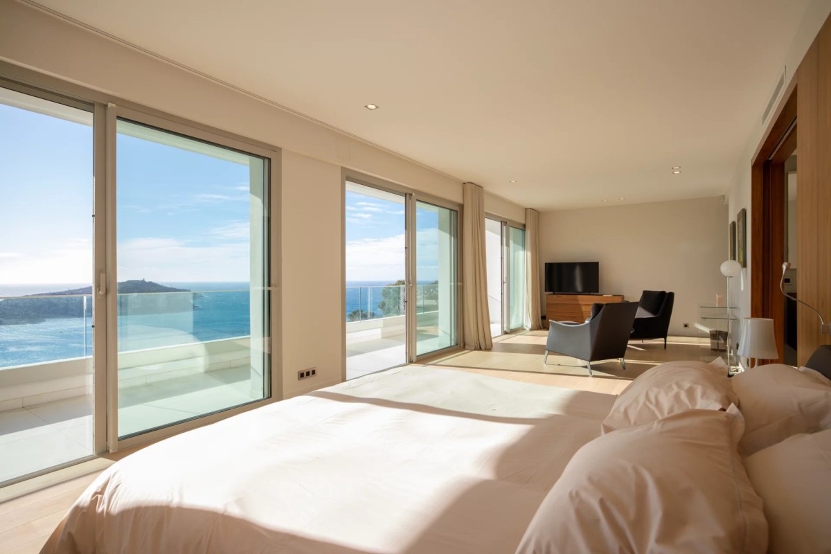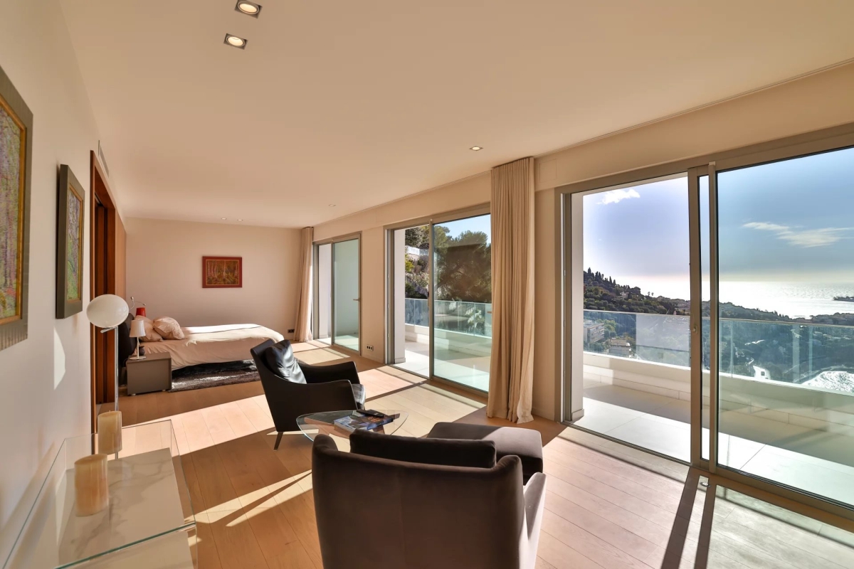 Au cœur d'un domaine privé, cette somptueuse villa contemporaine allie à la perfection luxe et confort. Avec une superficie de 440m², elle peut accueillir jusqu'à 10 invités dans ses 5 chambres, ainsi que 4 personnes supplémentaires dans son appartement indépendant. Dès l'entrée, vous serez charmés par un vaste espace de vie ouvert, baigné de lumière naturelle et décoré avec un goût raffiné. Chaque pièce offre une vue imprenable sur la mer, créant une ambiance sereine et apaisante. Les prestations incluent un espace de détente et de massage, un hammam, un jacuzzi et une piscine extérieure chauffée, tous conçus pour offrir un confort ultime. Rez-De-Chaussée -Entrée -Double salon ouvrant sur une terrasse vue mer -Salle à manger -Cuisine équipée ouvrant sur une terrasse vue mer -Arrière-cuisine -Terrasse vue mer avec jacuzzi -Chambre 1 : Master en suite (lit180cm) avec toilette indépendant, dressing, espace salon ouvrant sur une terrasse privative vue mer-salle de bain douche ouvrant sur une terrasse privative. Niveau 1 -Chambre 2 : master junior en suite (lit 160cm) avec un toilette indépendant,placard de rangement, une salle de bain douche et ouvrant sur une terrasse vue mer -Toilette invité -Chambre 3 : en suite (lit 160cm) dotée d'une salle de douche toilette et ouvrant sur une terrasse vue mer -Toilette -Chambre 4 (lit 160cm) dotée d'une salle de douche et ouvrant sur une terrasse vue mer -Studio indépendant accessible en descendant quelques marches de l'escalier extérieur : dotée d'un canapé convertible 140cm, il dispose d'une chambre en suite avec salle de douche toilette, une salle à manger et une cuisine équipée et dispose d'une belle vue mer Rez De Jardin -Salle de massage -Hammam avec ciel étoile -Douche -Toilette -Buanderie Prestations supplémentaires : vidéo surveillance, alarme, domotique, internet fibre, bbq, ascenseur, coffre fort, climatisation réversible Contact: +33781475525.